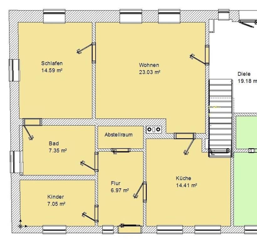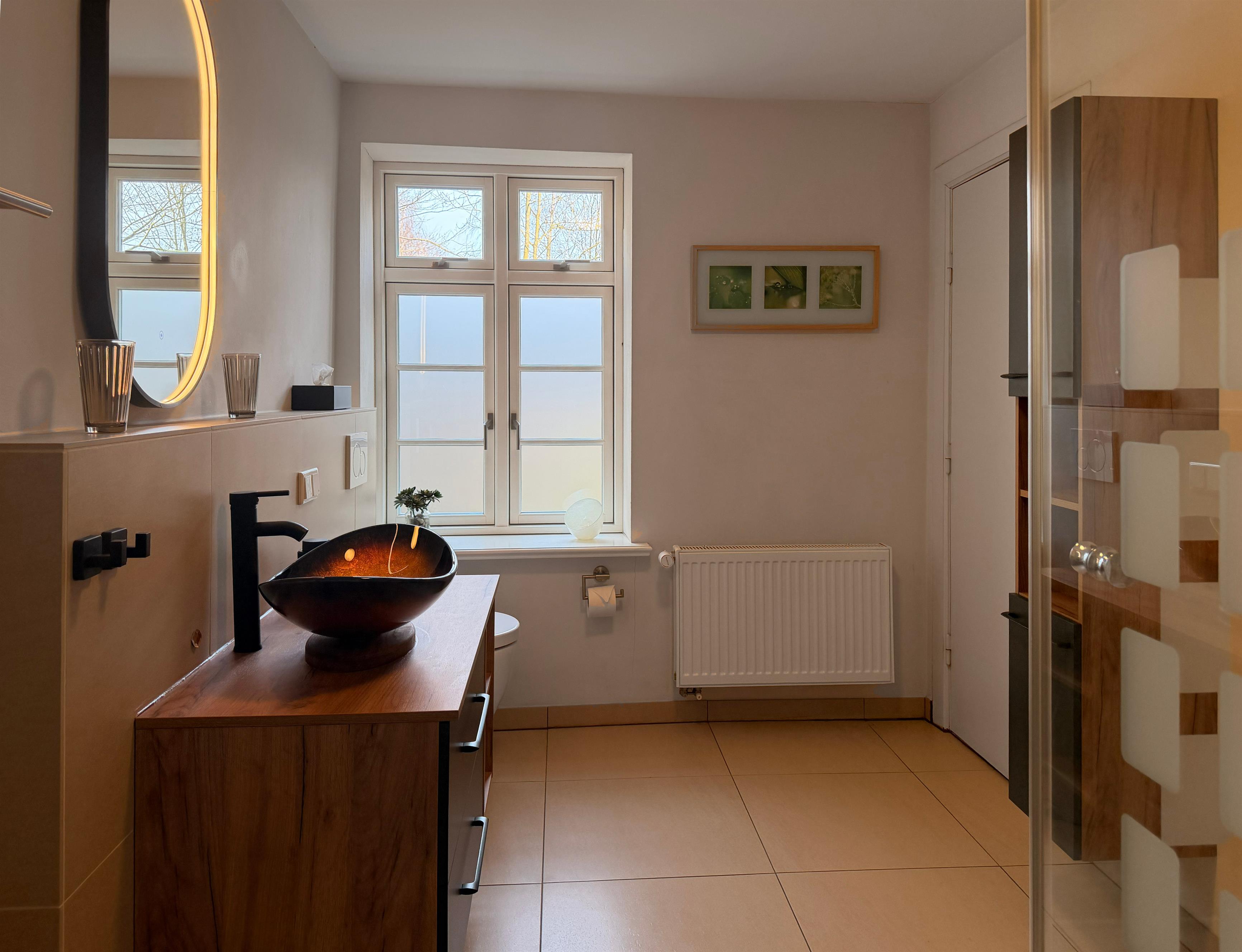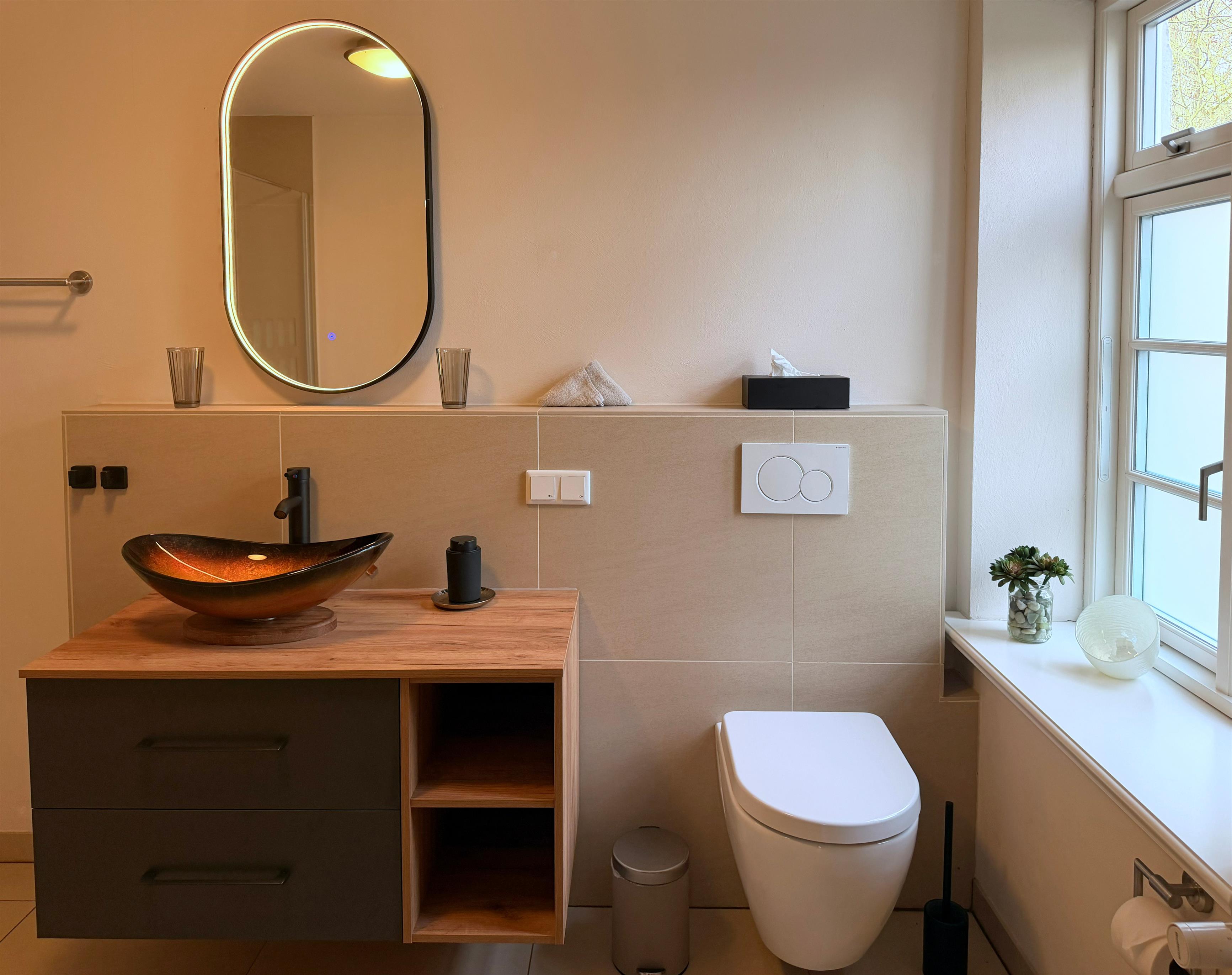 Das Haus wurde vollständig modernisiert, um den heutigen Komfortwünschen zu entsprechen. Dabei war es uns sehr wichtig, den Charme des historischen Gebäudes zu erhalten. Die Wohnung verfügt über ein Wohnzimmer mit Essbereich und Kaminofen, zwei getrennte Schlafzimmer, eine großzügige Küche, Bad und eine Abstellkammer. Das erste Schlafzimmer ist mit einem Boxspring-Doppelbett ausgestattet, im Zweiten befindet sich ein Stockbett.