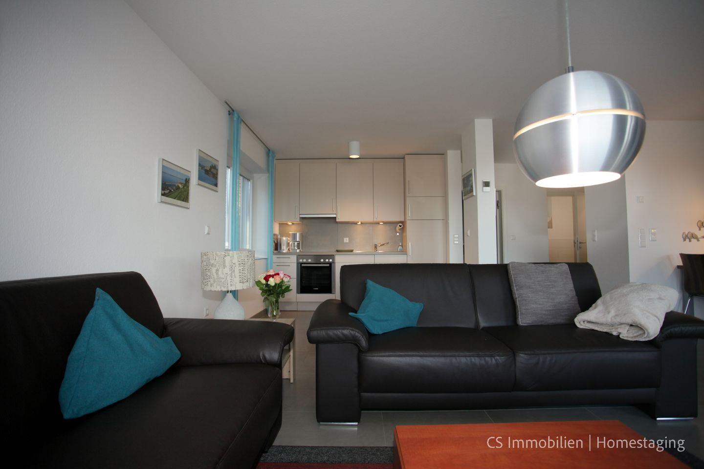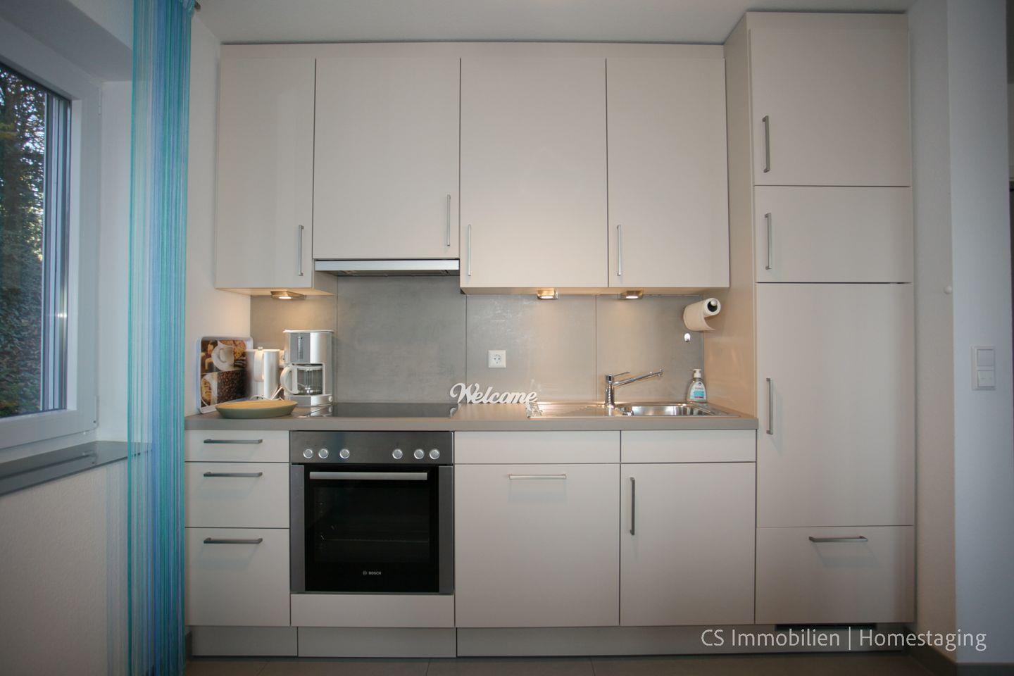 Das Herzstück der Wohnung ist der offene Wohn-/Essbereich mit bodentiefen Fenstern und Zugang zum großen Balkon. Die moderne Einrichtung, die gemütliche Wohnlandschaft und der Blick auf die Natur sorgen für pure Entspannung. Die voll ausgestattete Wohnküche lädt zu kreativen Kochmomenten ein, während die fertigen Leckereien auf dem Balkon genossen werden können.
