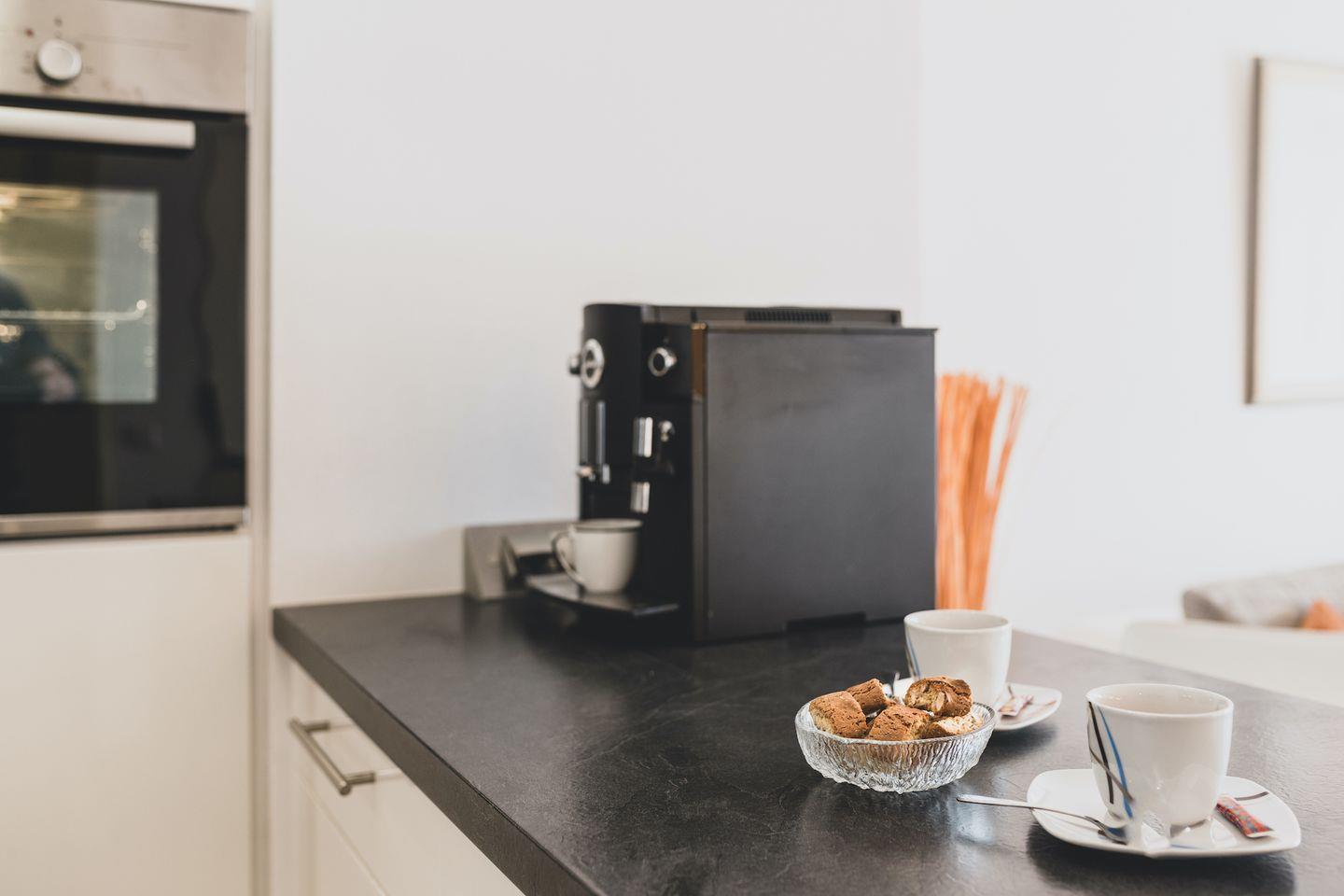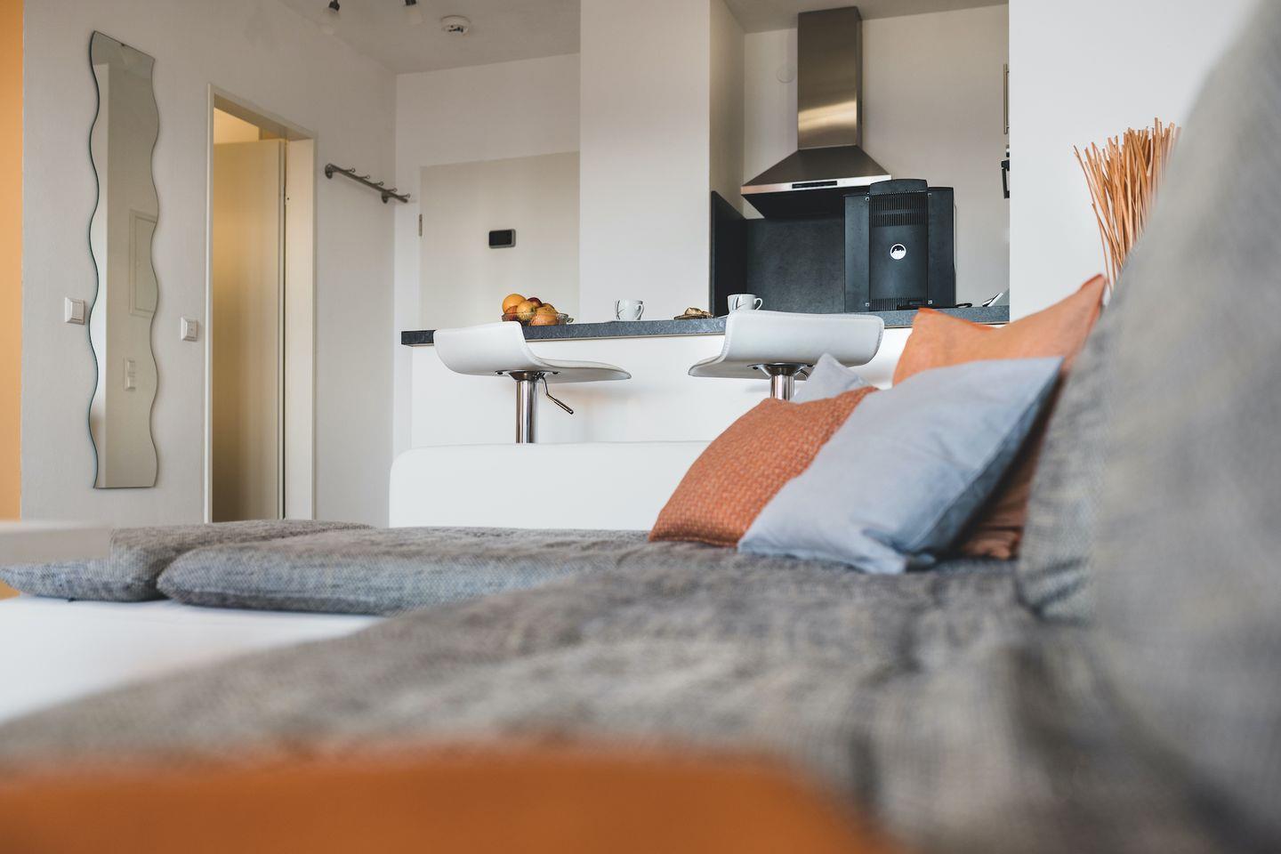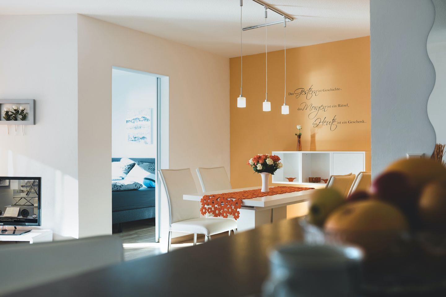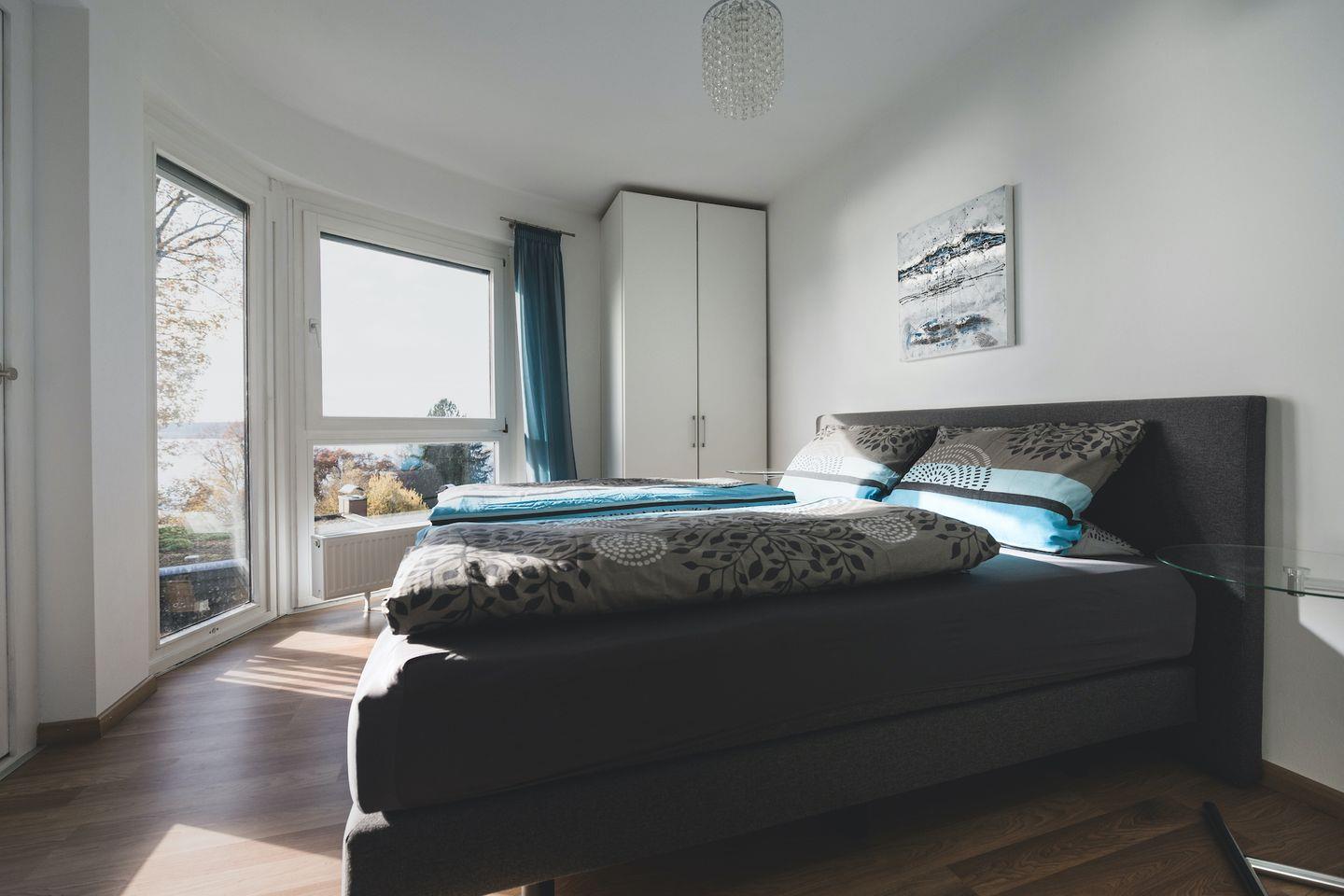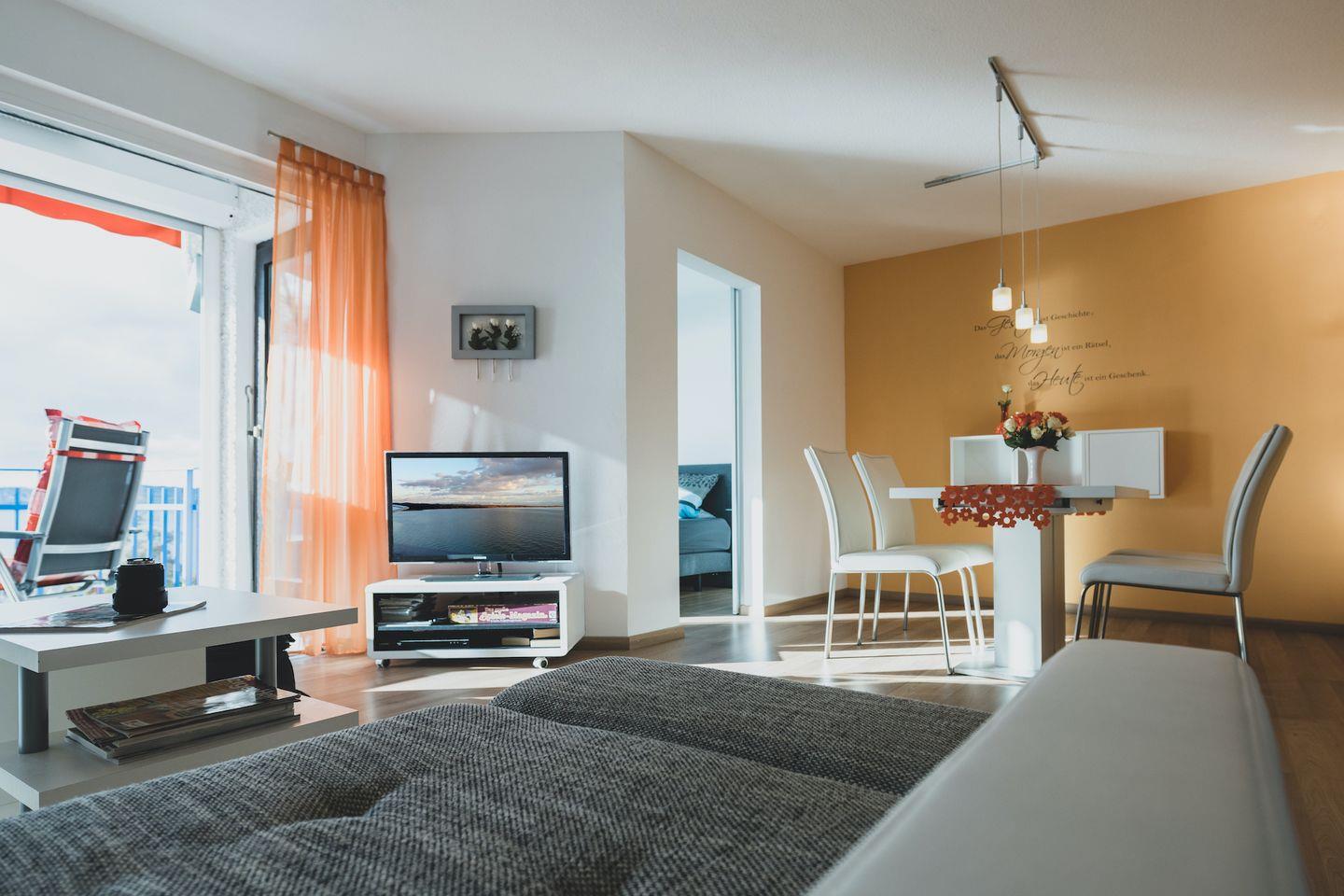 Die Ferienwohnung verfügt über ein Schlafzimmer mit einem komfortablen Boxspringbett und großem Kleiderschrank, von dem aus Sie den malerischen Ausblick auf den Bodensee genießen können. Neben dem geräumigen Schlafzimmer bietet das komfortable Sofa im Wohnbereich eine weitere Schlafgelegenheit für ein Kind. Der offene Wohnbereich lädt zum Verweilen ein und bietet eine voll ausgestattete Küche mit modernem Design sowie einen gemütlichen Essplatz für bis zu vier Personen. Genießen Sie Ihren morgendlichen Kaffee oder Espresso mit dem hochwertigen Jura-Kaffeevollautomaten.