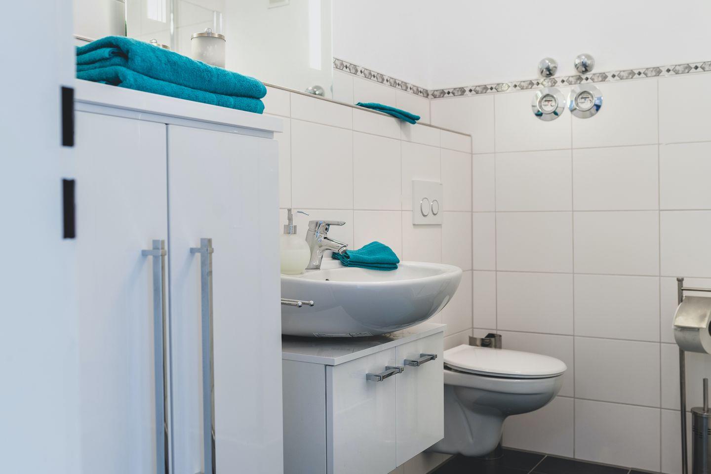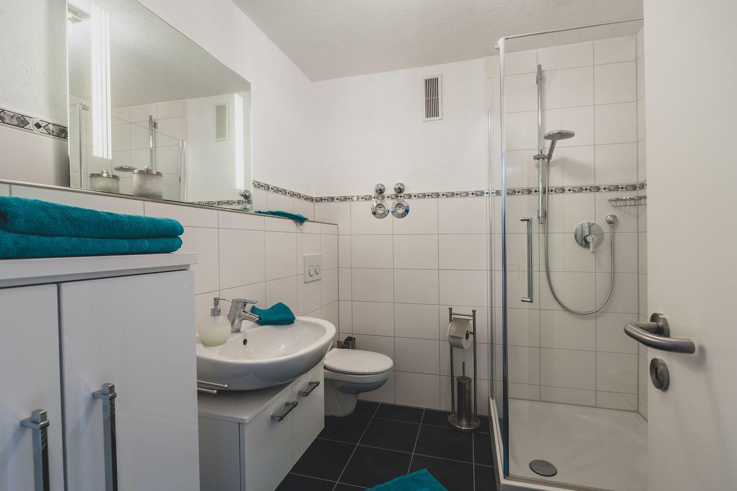 Das moderne Badezimmer verfügt über eine Dusche, ein WC und einen beleuchteten Waschtisch. Zur weiteren Ausstattung gehören WLAN, ein abschließbarer Fahrradraum sowie ein gemeinschaftlicher Tischtennisraum für unterhaltsame Stunden. Bitte beachten Sie, dass die Wohnung rauchfrei ist, um den Komfort aller Gäste zu gewährleisten. Ein eigener Parkplatz steht Ihnen während Ihres Aufenthalts zur Verfügung