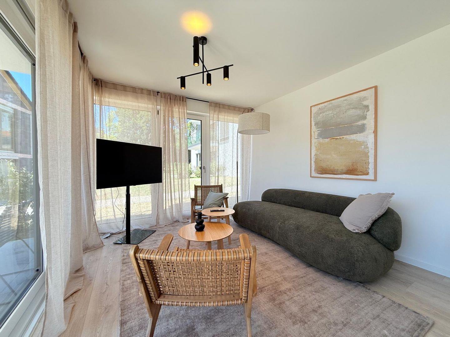 Die Suite besteht aus insgesamt drei Zimmern, darunter zwei separate Schlafzimmer. Sowohl im Wohn- als auch in den Schlafbereichen wurde ein pflegeleichter Vinylboden verlegt, der zur modernen Atmosphäre beiträgt. Der Wohnbereich ist mit einem komfortablen Sofa, Sessel sowie einem großzügigen Essbereich und Esstisch ausgestattet. Ein 44 bis 55 Zoll großer Fernseher mit digitalem Satellitenanschluss, Radio, Gesellschaftsspiele sowie kostenfreies WLAN (ab 25 MBit/s) sorgen für Unterhaltung und Konnektivität. Kaffeemaschine, Toaster, Spülmaschine und viele weitere Küchenutensilien gewährleisten in der offen zum Wohnzimmer gestalteten Küche maximale Funktionalität. Ein Backofen mit Elektroanschluss, ein 4-Platten-Herd, Kühlschrank mit Gefrierfach sowie eine komplette Ausstattung an Geschirr, Besteck und Kochutensilien stehen ebenfalls zur Verfügung.