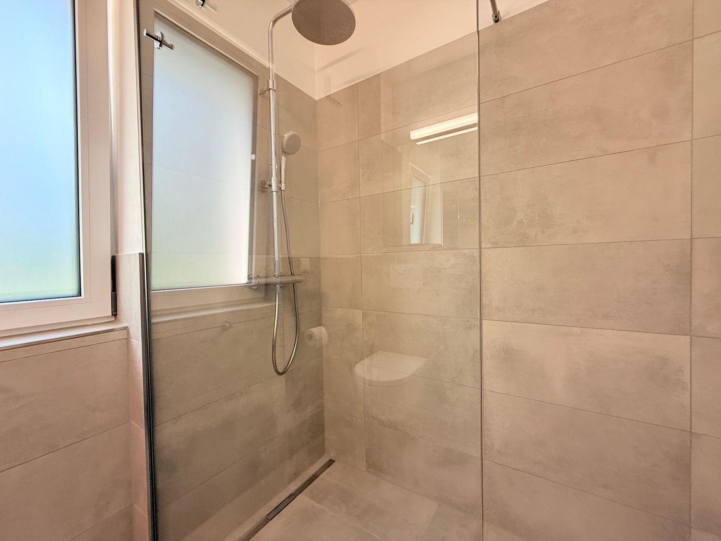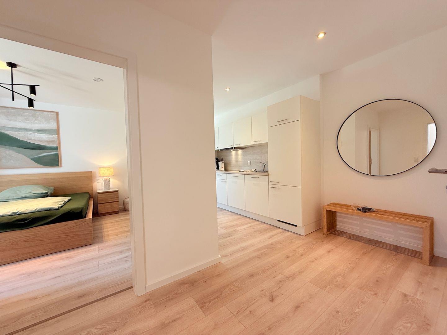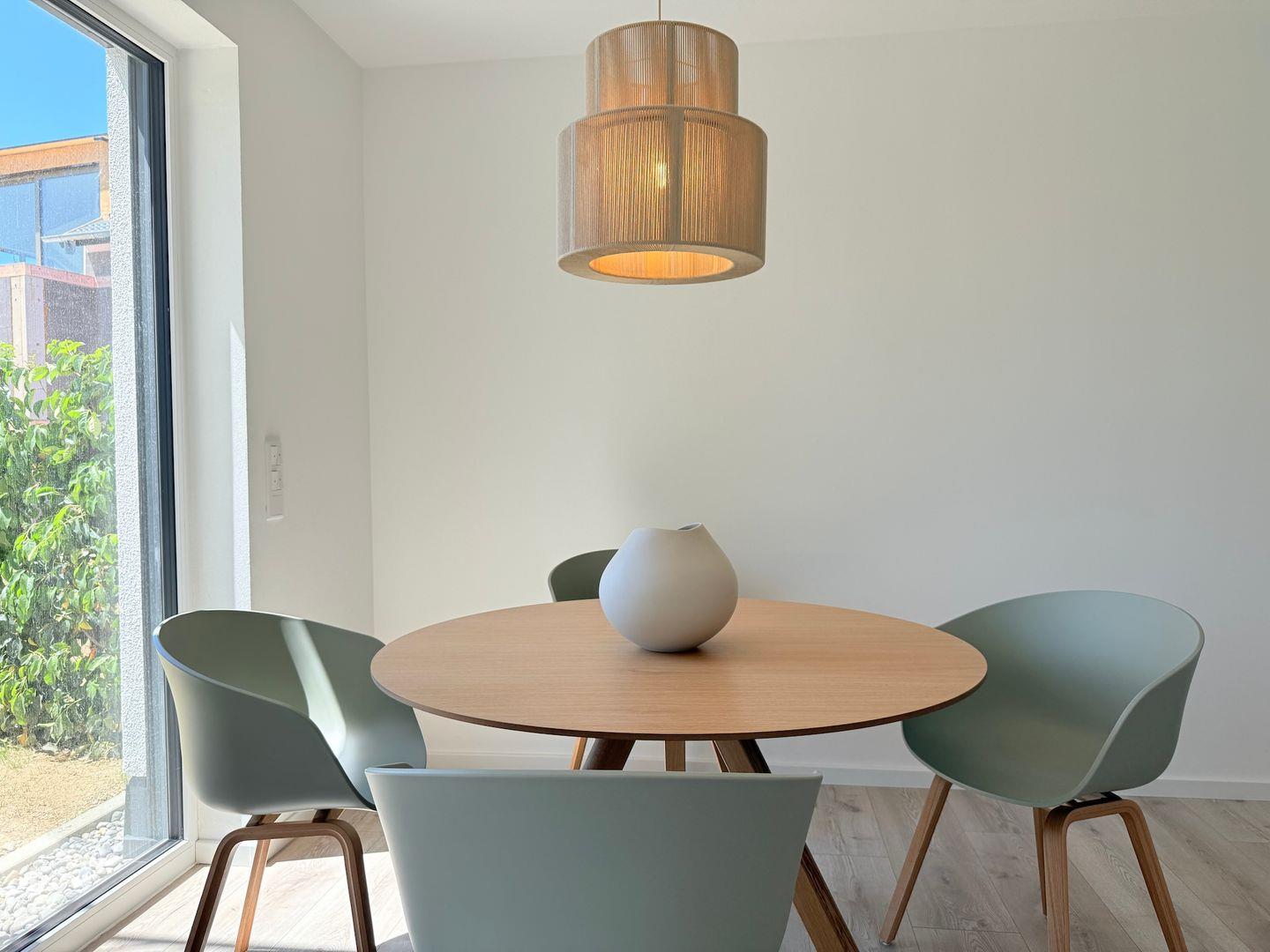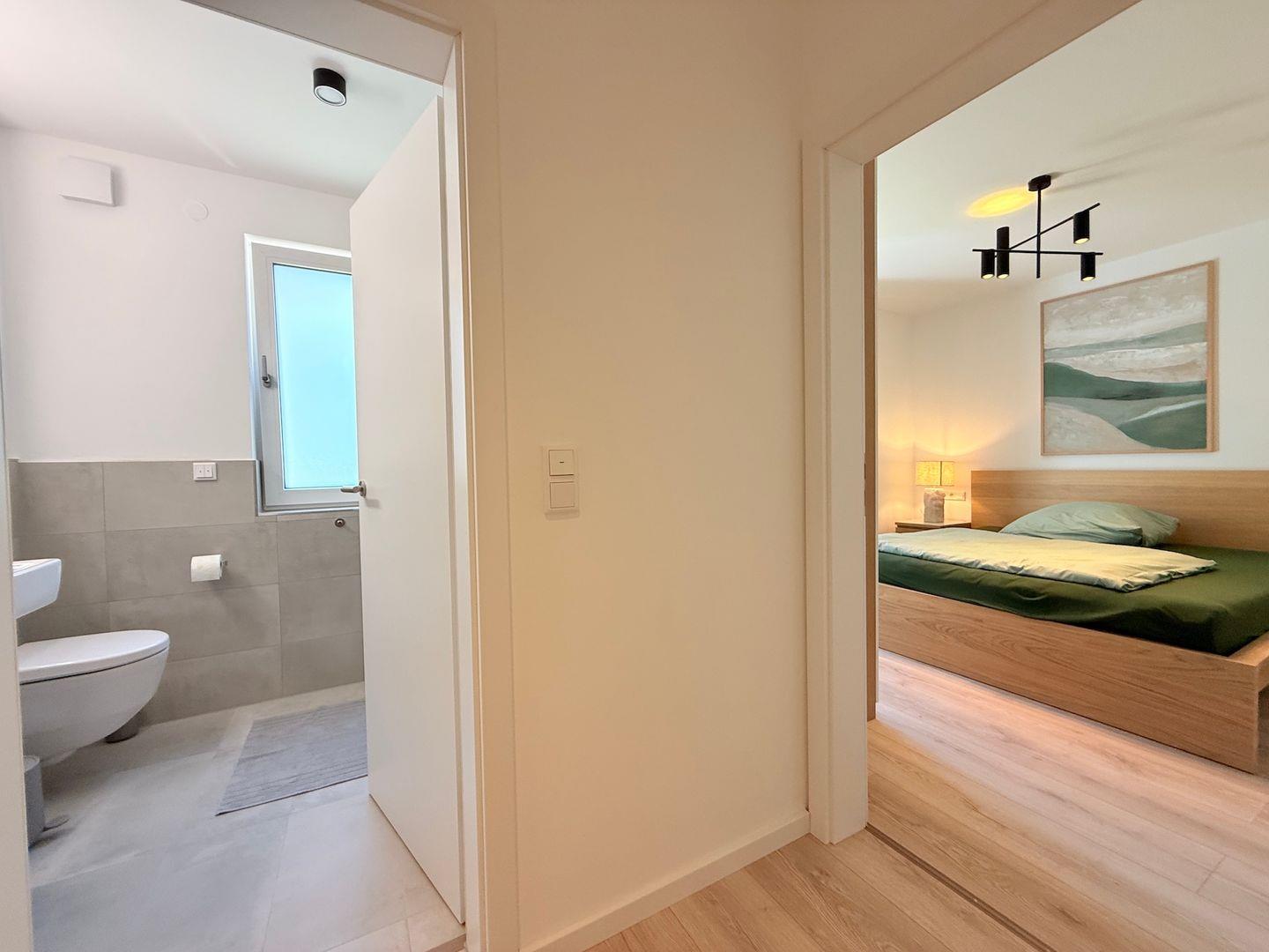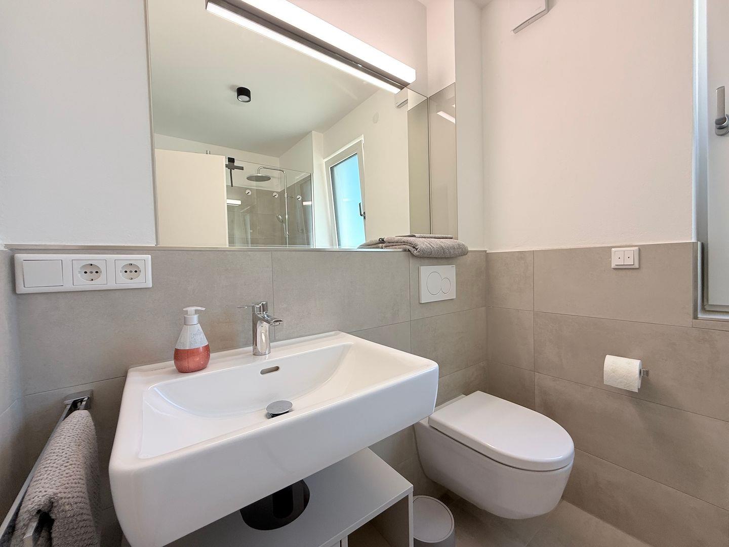 Das Badezimmer ist mit einer bodengleichen Dusche, Haartrockner, Waschbecken, WC und Spiegel ausgestattet. Badetücher, Handtücher, Bettwäsche sowie Reinigungsmittel sind inbegriffen. Waschmaschine und Trockner stehen zur gemeinschaftlichen Nutzung bereit, ein Wäscheständer ist ebenso vorhanden. Für zusätzlichen Komfort sorgt die durchgängig installierte Fußbodenheizung, betrieben über eine effiziente Wärmepumpe. Sichtschutz an allen Fenstern und Rauchmelder gewährleisten Sicherheit und Privatsphäre.