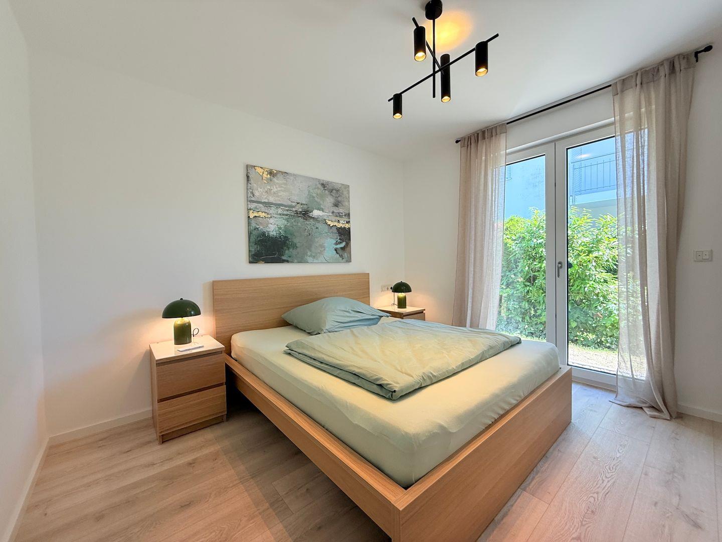 Eine überdachte Terrasse bieten Zugang zum Garten mit Gartenmöbeln, Liegewiese und Sonnenschirm. Von hier aus lässt sich der eingeschränkte Seeblick sowie Gartenblick genießen. Die Lage der Suite Harmony ist ideal für Naturliebhaber. Einkaufsmöglichkeiten, Restaurants und der öffentliche Nahverkehr sind in Reichweite; so liegt ein Supermarkt ca. einen Kilometer entfernt, das nächste Restaurant erreichen Sie nach etwa 800 Metern.