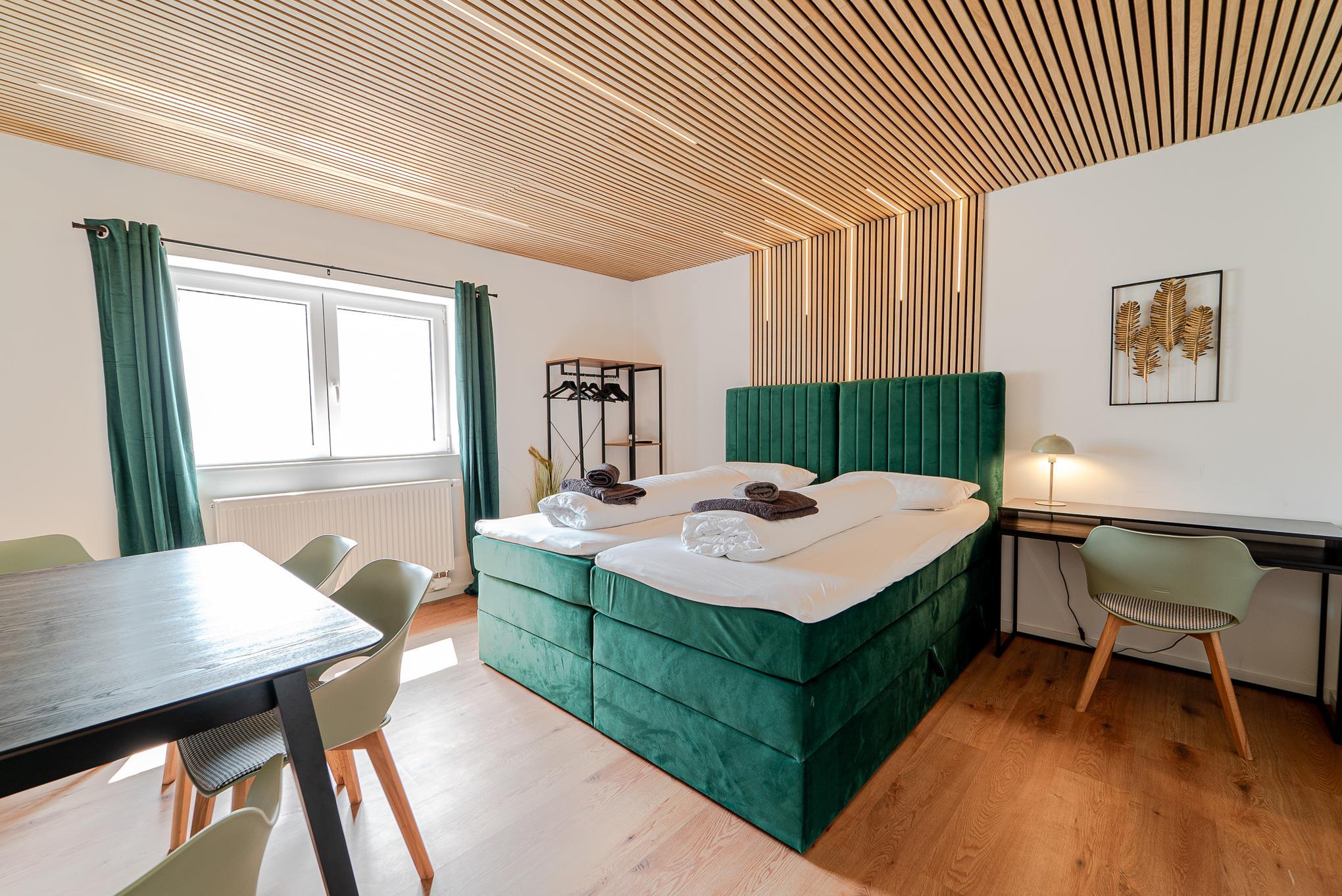 Wir bieten geräumige Schlafzimmer mit bequemen Schlafplätzen und einem praktischen Esstisch, um den Platz effizient zu nutzen und gleichzeitig maximalen Komfort zu gewährleisten.
