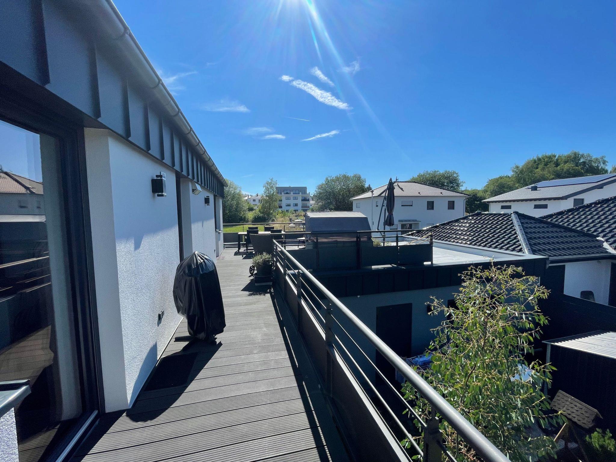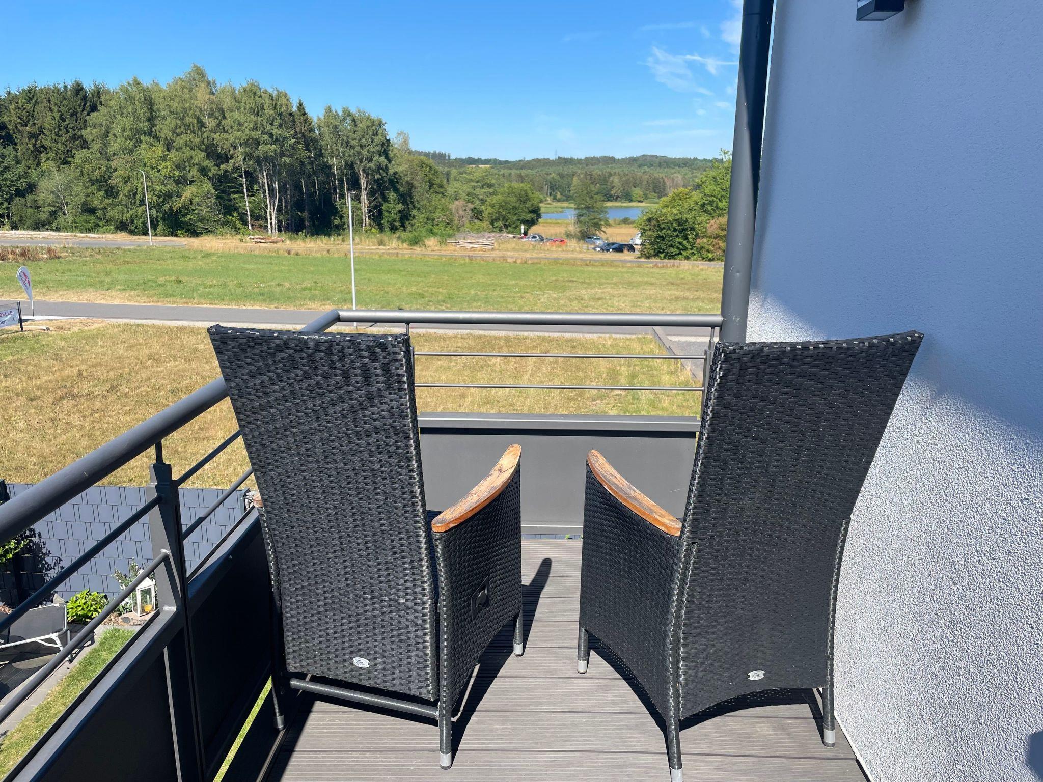 Die große Terrasse mit schönem Blick auf den Jungferweiher verfügt über eine gemütliche Sitzecke, Sonnenschirm, Grill und Relaxliegen.