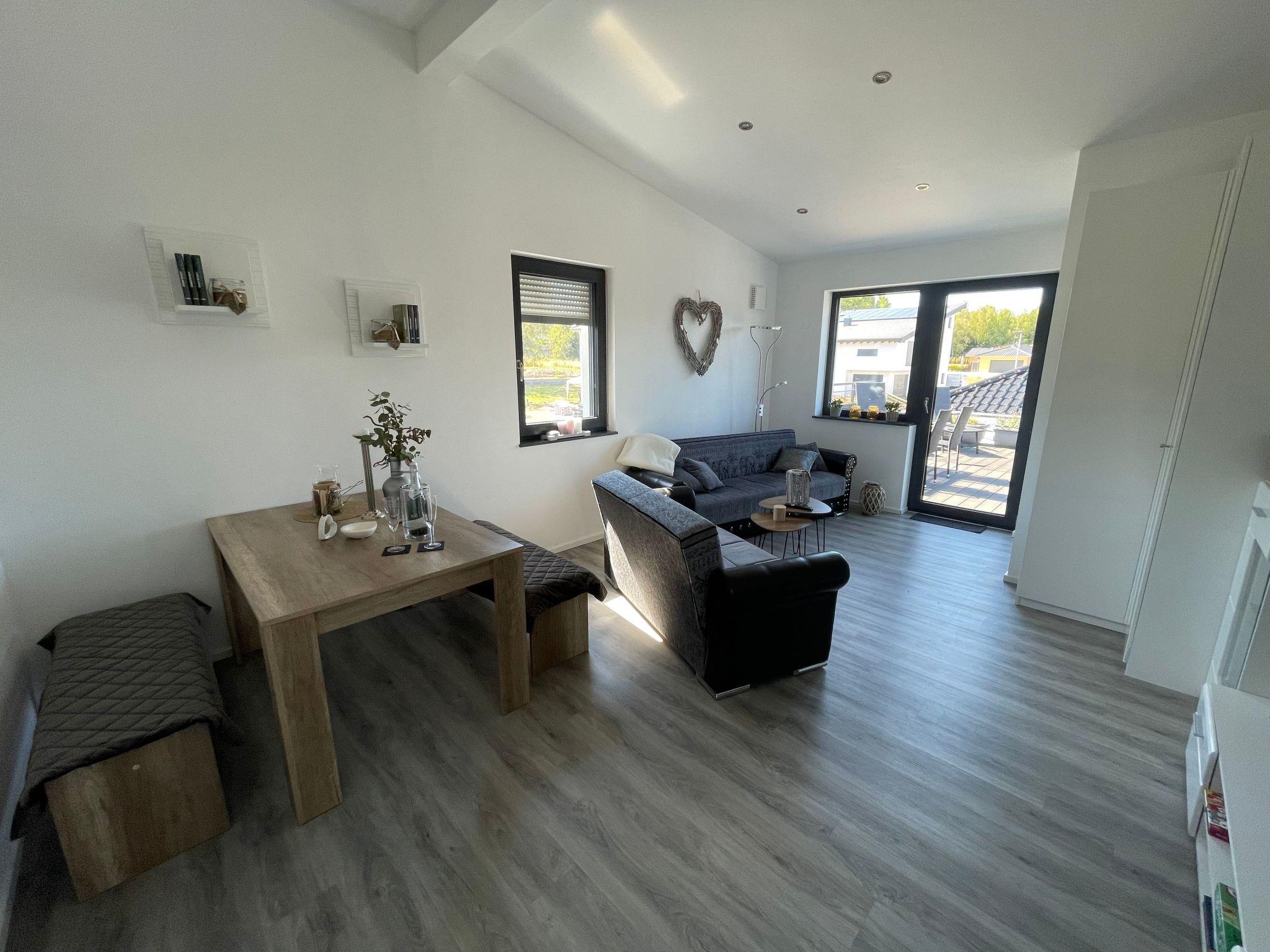Spiele für einen geselligen Abend stehen bereit oder spannende Eifelkrimis für einen ruhigen Leseabend. Ein separater Essbereich mit modernen Sitzbänken ergänzt den Wohnbereich.