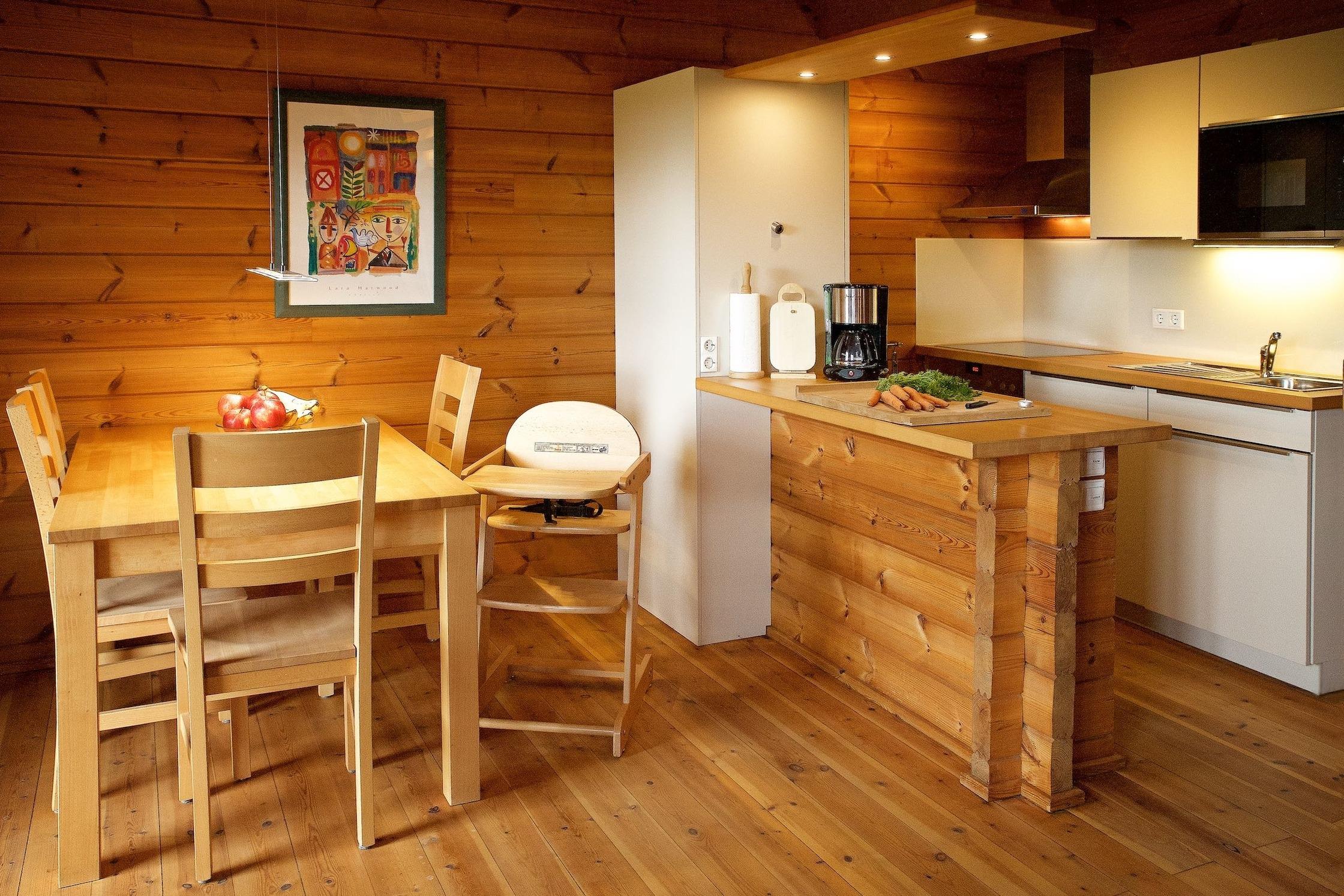 Unser Blockhaus wird gern von Familien gebucht. Kinder finden direkt am Haus sogleich neue Freunde und genügend Platz zum Spielen. Wie alle unsere Blockhäuser und -Wohnungen ist das Blockhaus Knut sehr wohnlich und doch praktisch aufgeteilt. Wände und Möbel sind aus Massivholz. Direkt am Tresen der offenen. vollständig eingerichteten Küche befindet sich die Essecke.