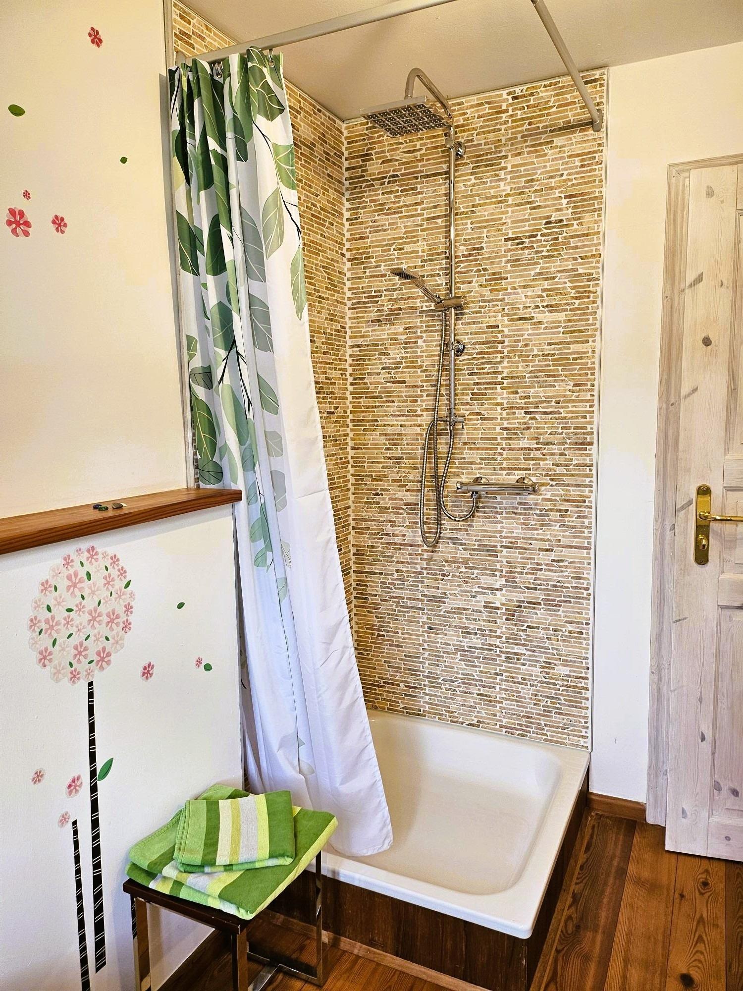 Alte Holzbalken, Holzdielen und natürliche Materialien sorgen für eine Atmosphäre, in der man sich einfach wohlfühlt. Dazu gibt’s eine gut ausgestattete Gemeinschaftsküche, ein einladendes, sonniges Wohnzimmer und draußen Garten und Terrasse – perfekt für eine Kaffeepause unter Obstbäumen oder ein gutes Buch in der Sonne.