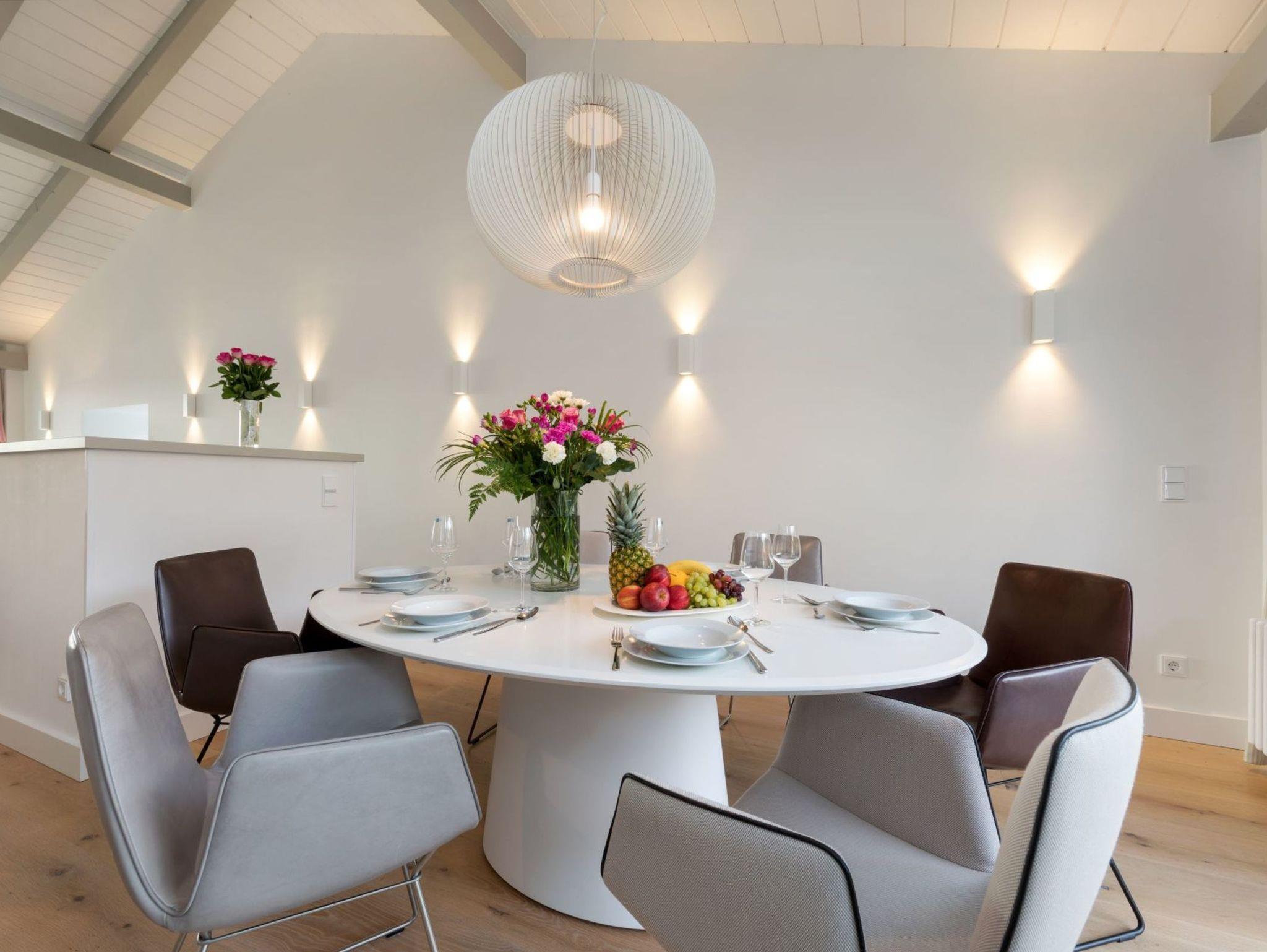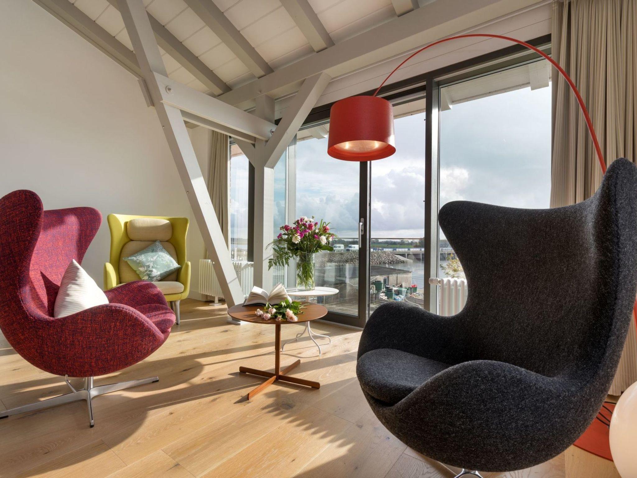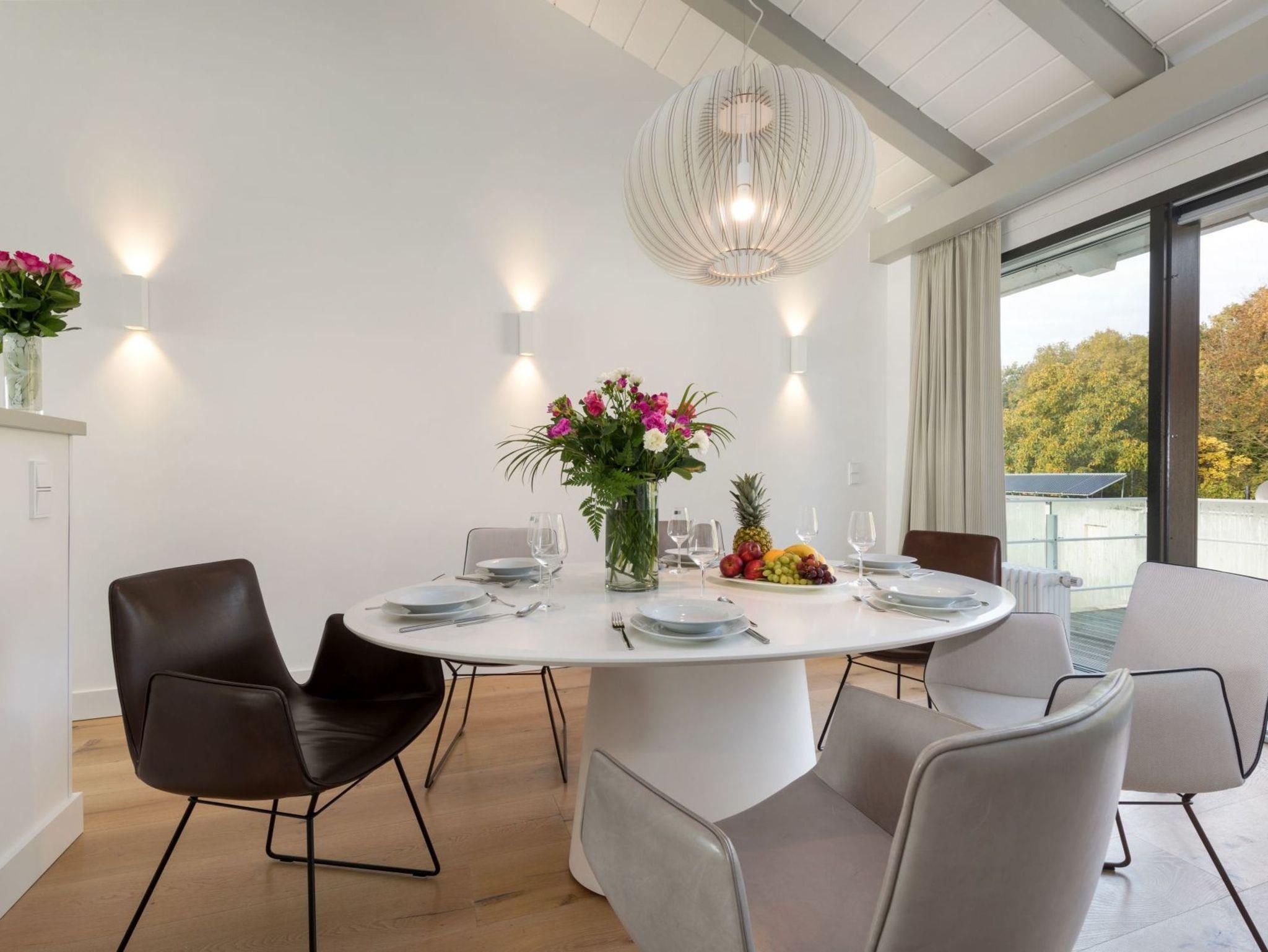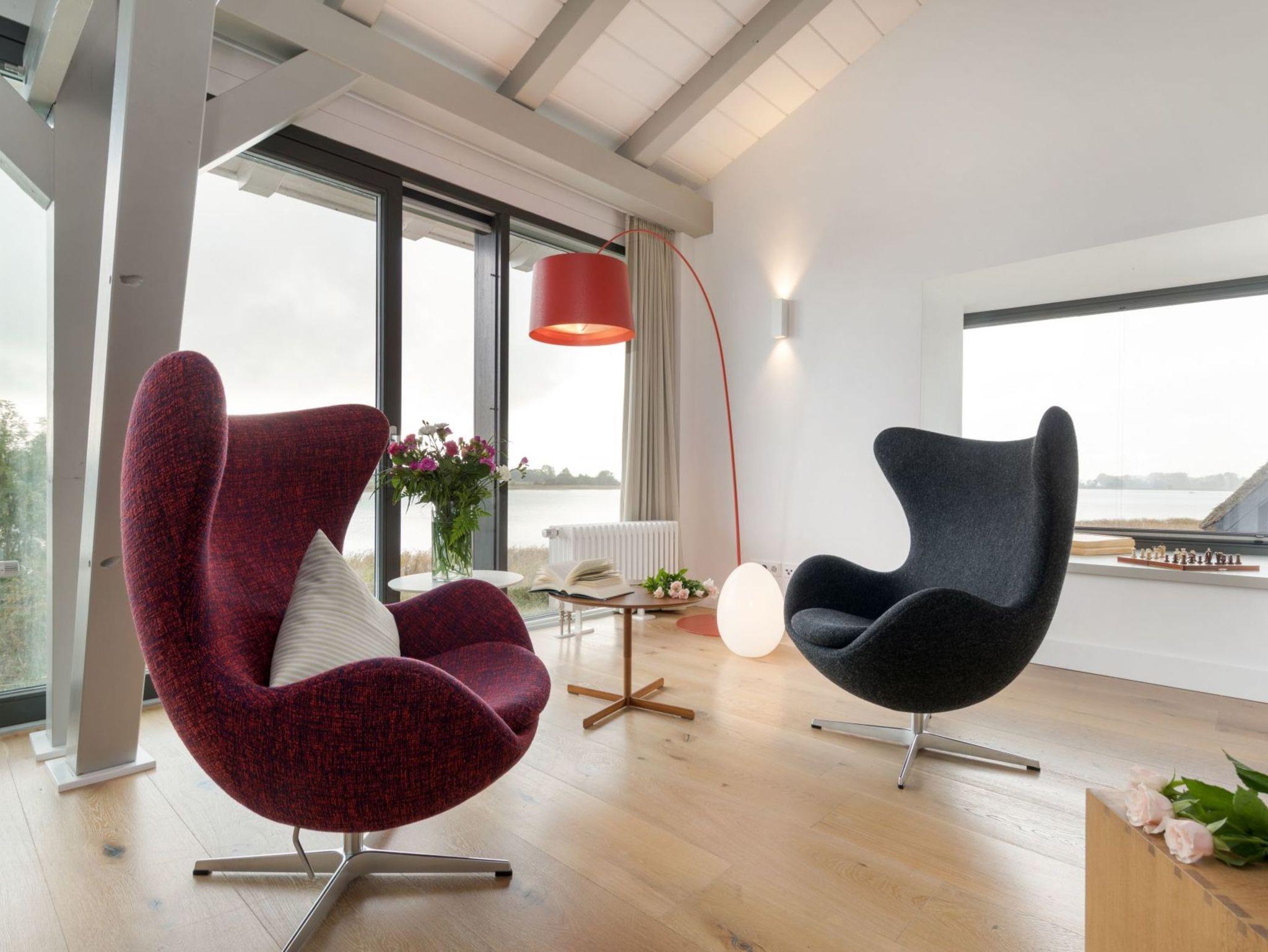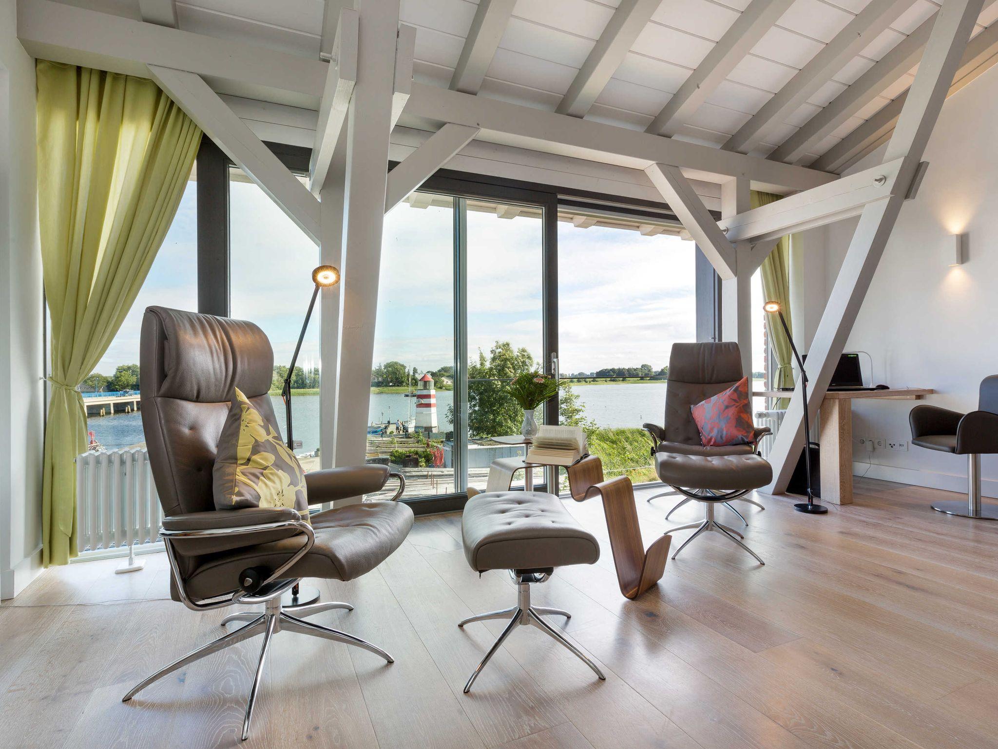 Während sich der großzügige Schlafbereich im Erdgeschoss befindet, beeindruckt der Wohnbereich im Obergeschoss mit bis zu vier Meter hohen Decken. Das luxuriöse Interieur wird durch die komplett ausgestattete Küche, drei HDTV-Fernseher, eine HiFi-Anlage, Designermöbel und natürlich einen Internetzugang per WLAN abgerundet.