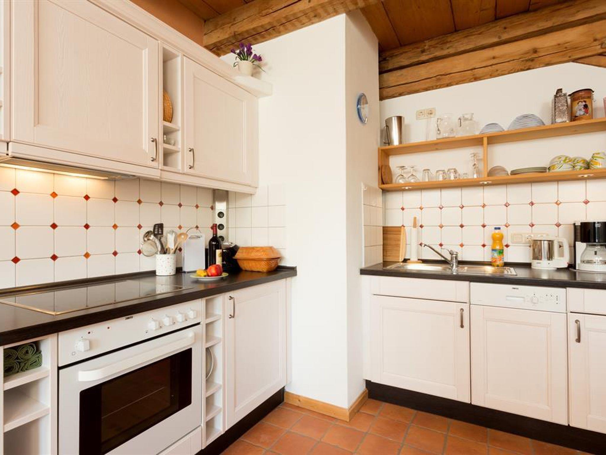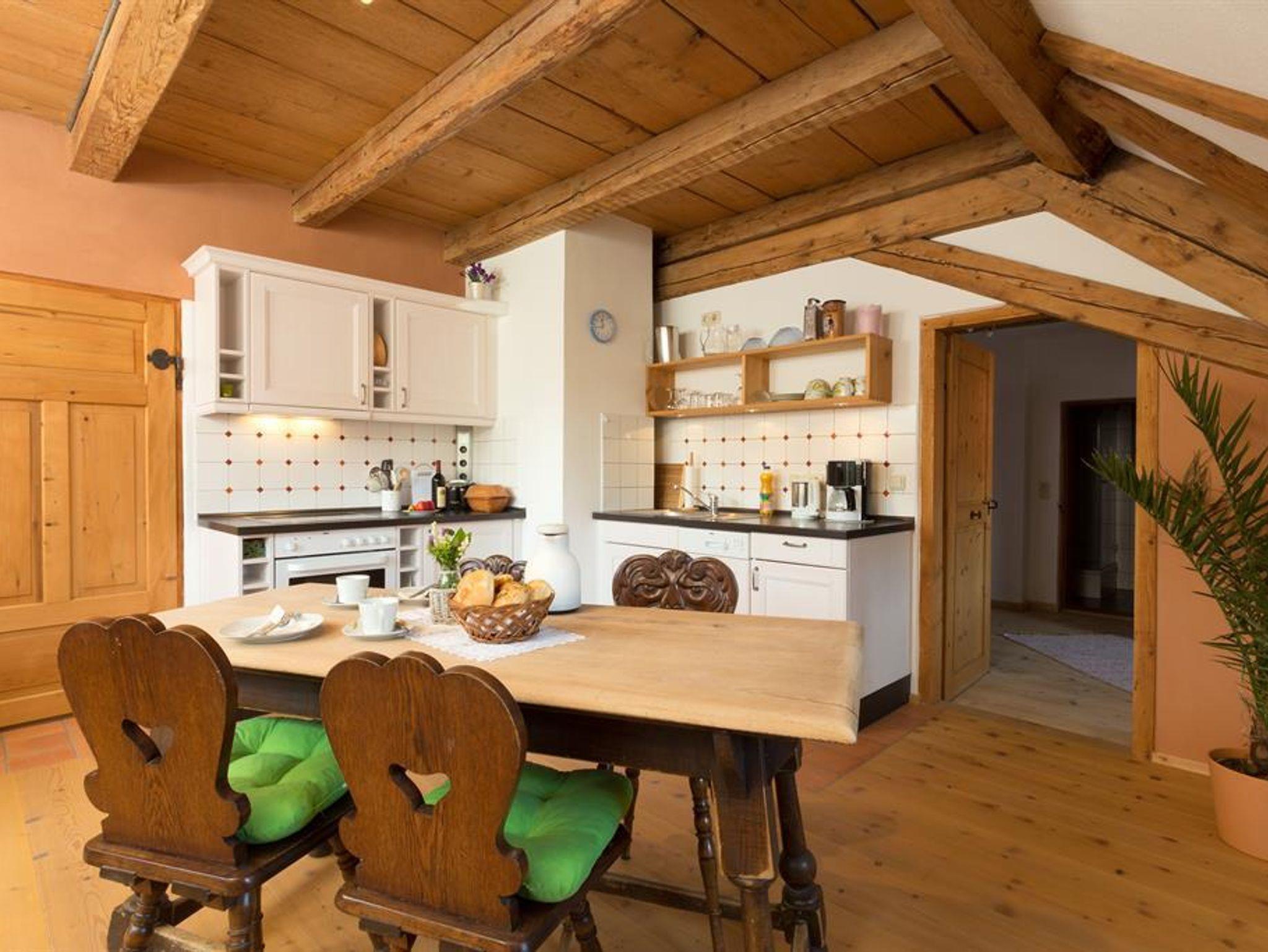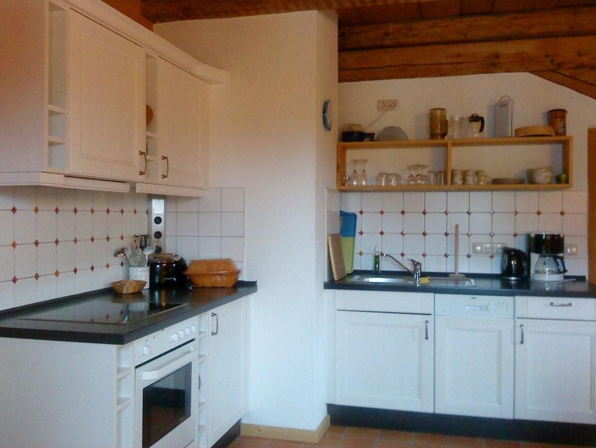 Schön geschnittene Wohnung mit sehr große Wohnküche. Stillvolle Einrichtung mit Massivholzmöbel. Holzfußboden, Lehmverputze Wände, hohe Räume mit originaler Balkendecke.