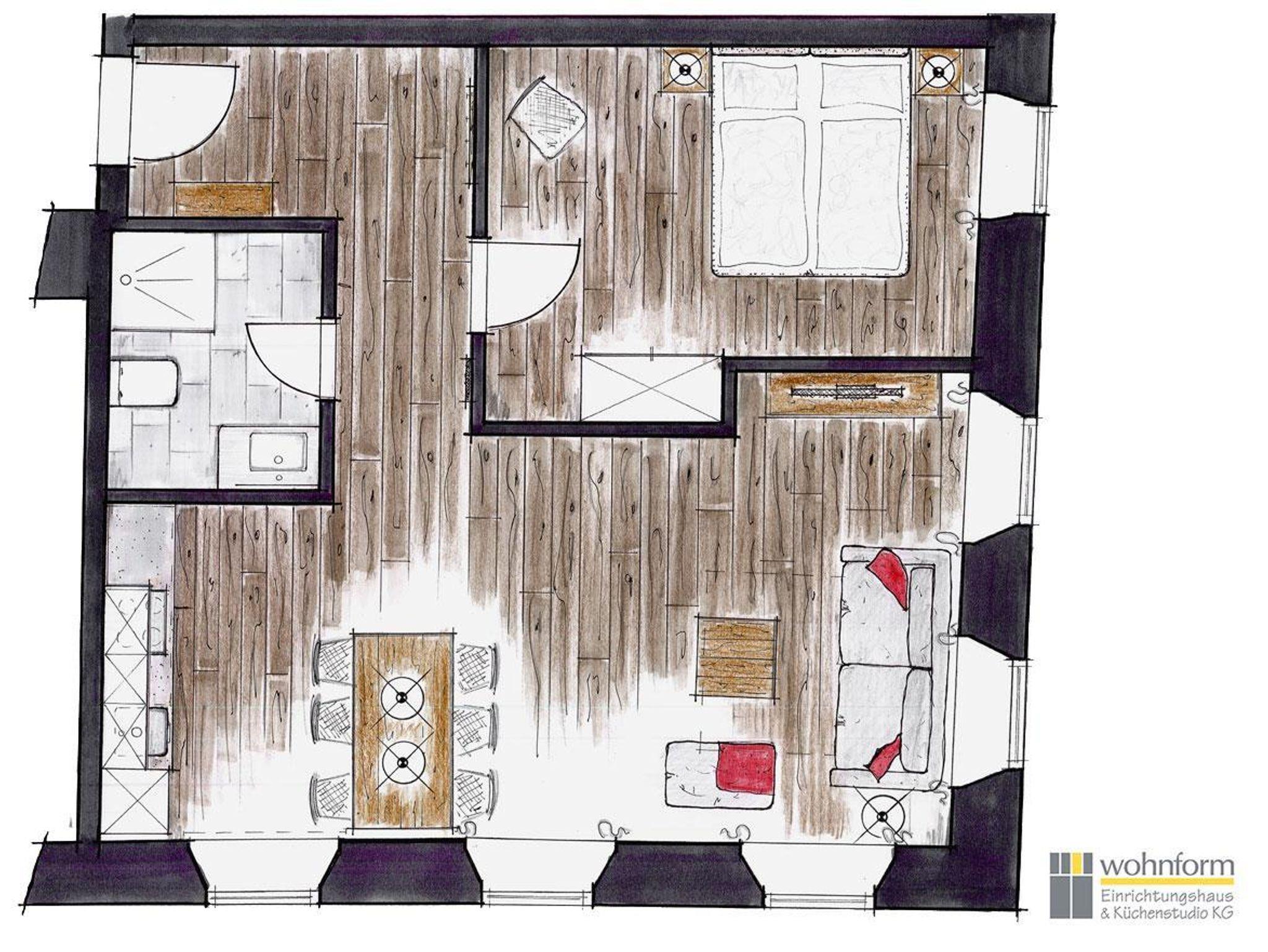 Diese Ferienwohnung für 2-4 Personen verfügt über ein zentral in der Wohnung gelegenen Wohnbereich mit integrierter Küche mit Essbereich und einem separaten Schlafzimmer. Sie verfügt über eine Küche mit Kühlschrank, Spülmaschine, Ceran-Herd, Wasserkocher, Toaster und Kaffeemaschine sowie ein Bad mit Dusche und WC.