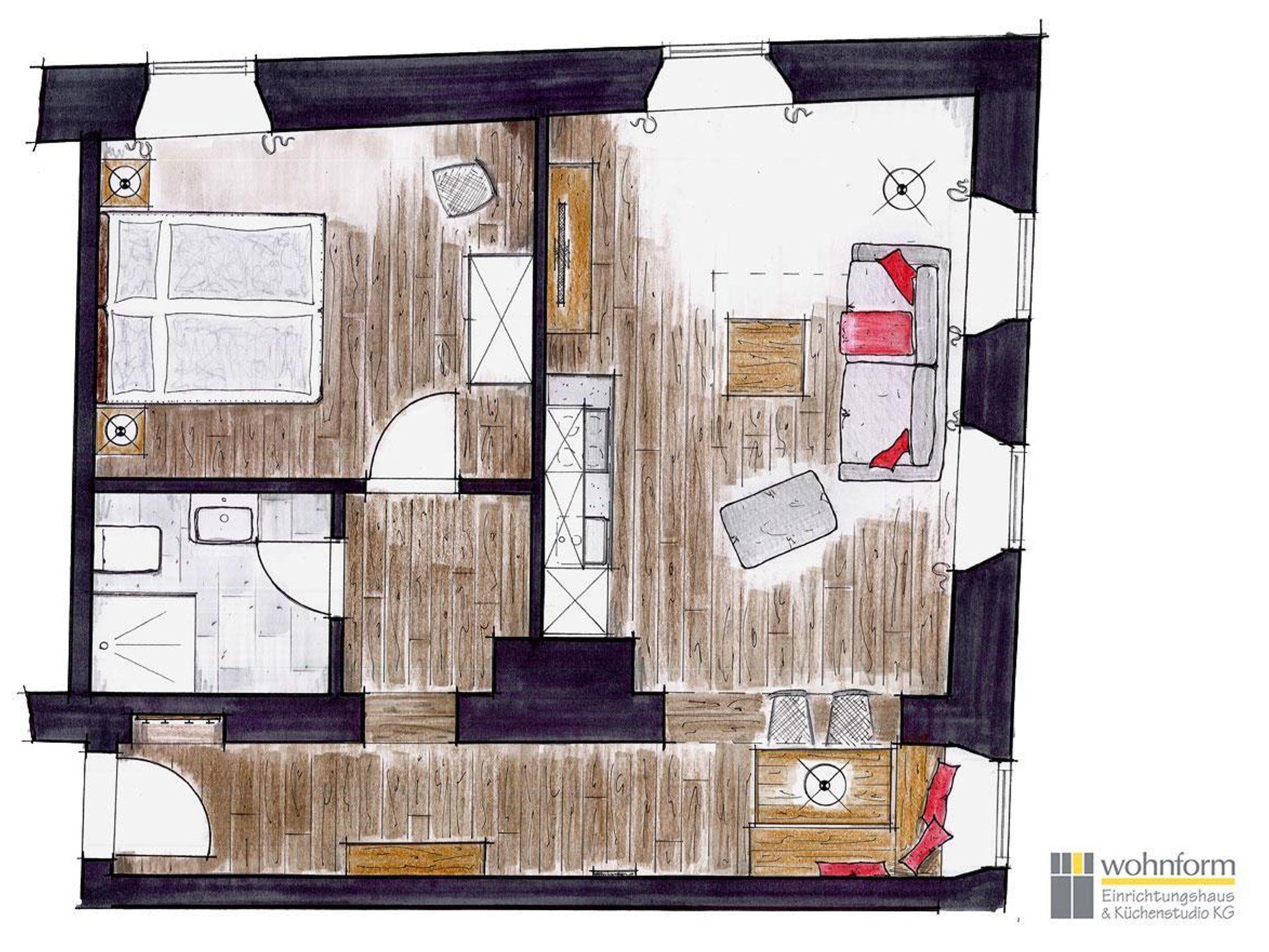Das Apartment verfügt über einen großen Wohn- und Schlafraum (37 qm) für 2 - 4 Personen, eine Küche mit Kühlschrank, Spülmaschine, Ceran-Herd, Wasserkocher, Toaster und Kaffeemaschine sowie ein Bad mit Dusche und WC.