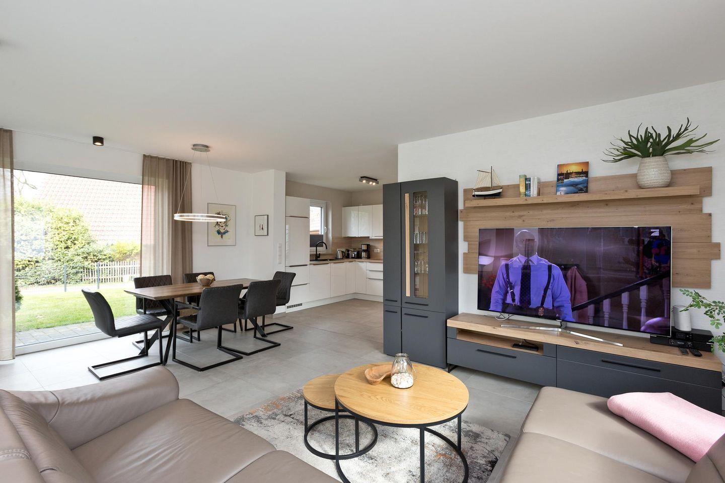 Im Erdgeschoss befindet sich der großzügige Wohn-Küchen und Essbereich. Hier erwartet Sie eine gehobene und exklusive Ausstattung mit einem Ecksofa, Couchtisch einer Wohnwand und einem 65 Zoll Fernseher, sowie Internetradio und einer 5G - Wlan Box (inkl. unbegrenzte Flat) auf allen Räumen verteilt. Hier haben Sie die Möglichkeit mit Ihren lieben gemütliche Fernsehabende zu verbringen. Die Küche lässt ebenfalls keine Wünsche offen, hier befindet sich alles was man benötigt um ein tolles Essen zu zaubern und seine lieben zu verwöhnen. Die Küche besitzt eine Nespressomaschine und eine Filterkaffeemaschine, Thermoskanne, Kaffeedose, Wasserkocher, Toaster, Schneidebretter, Handmixer, Küchenwaage, Sparschäler, Zitronenpresse, 60 teiliges Besteckset, 12 teilige Essgeschirrset, 12 teiliges Kaffeegeschirrset und ausreichend Gläser.