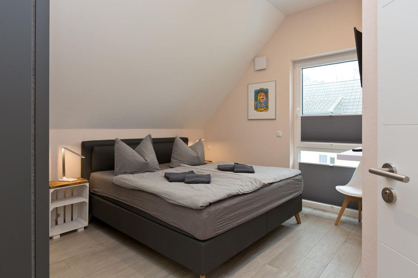 Im Obergeschoss befinden sich die Schlafzimmer, alle sind mit einem Boxspringbett ,Matratzenschoner sowie Zudecken und Kopfkissen ausgestattet. Nachttische und Nachttischlampen bieten Ihnen die Möglichkeit in Ruhe ein Buch zu lesen oder Sie nutzen die im Schlafzimmer an der Wand befestigten TV Geräte um den Abend ausklingen zu lassen.