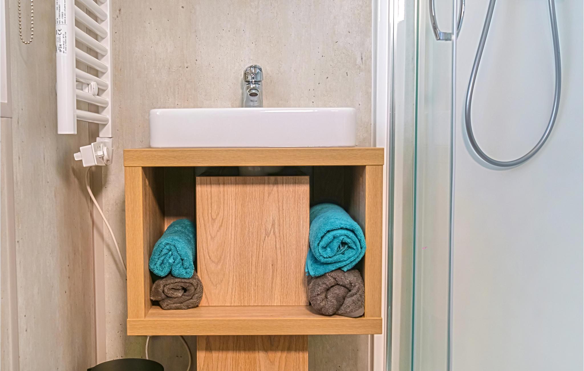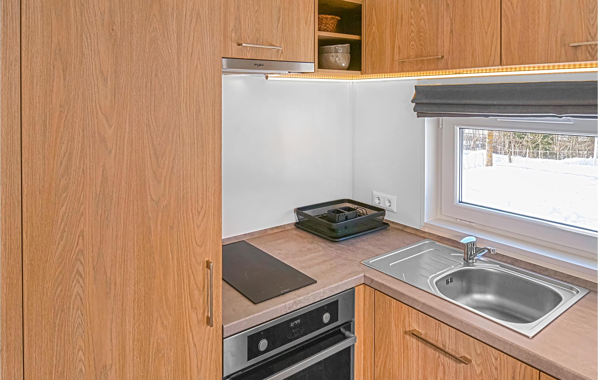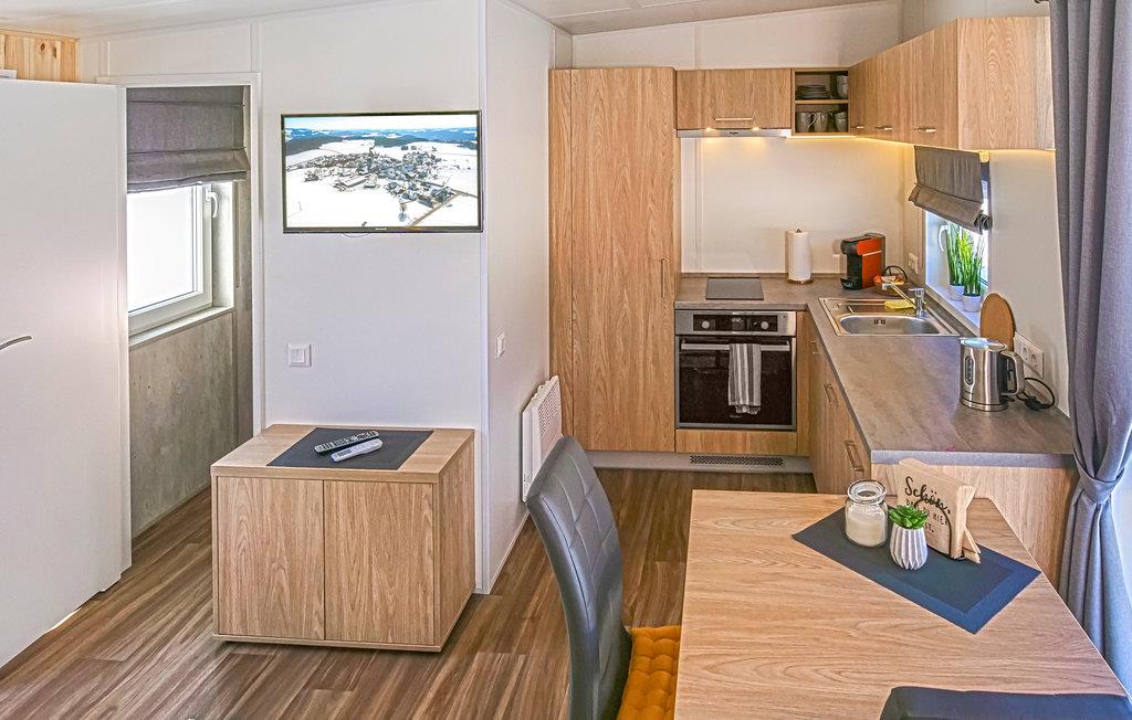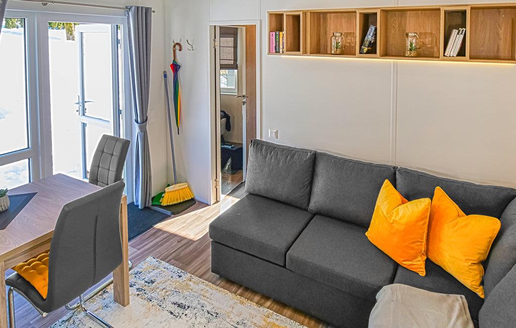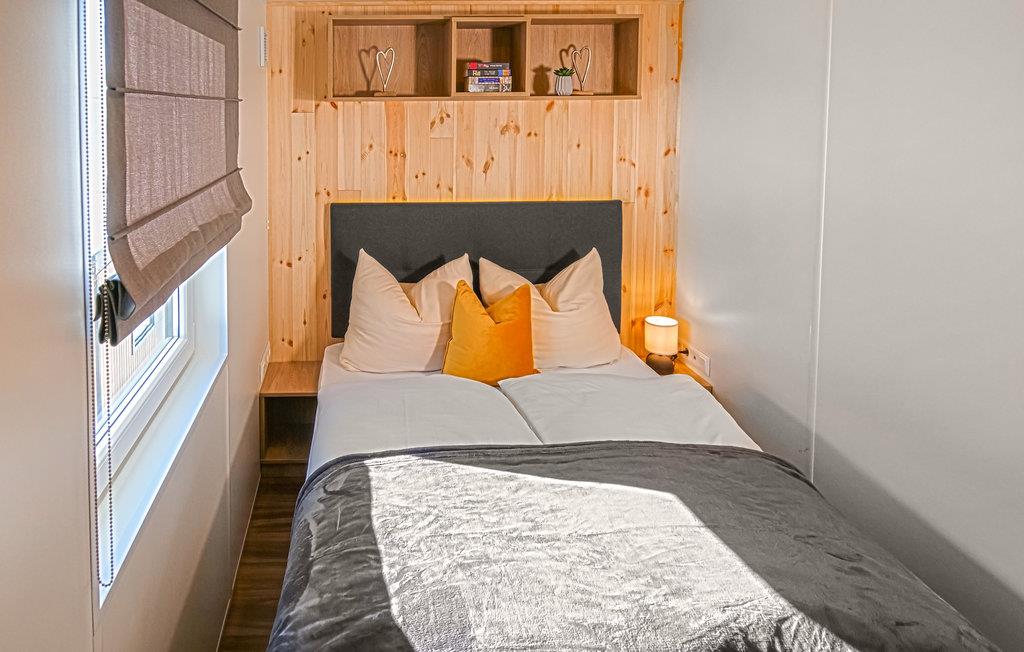 Minihuset består af en hyggelig opholdsstue med sovesofa (1,20x1,90 m), spiseplads og veludstyret tekøkken. Der er desuden et adskilt soveværelse med boxmadrasser, hvor I kan drømme sødt mellem jeres oplevelser ude i området. Derudover har minihuset eget badeværelse med brus/toilet.