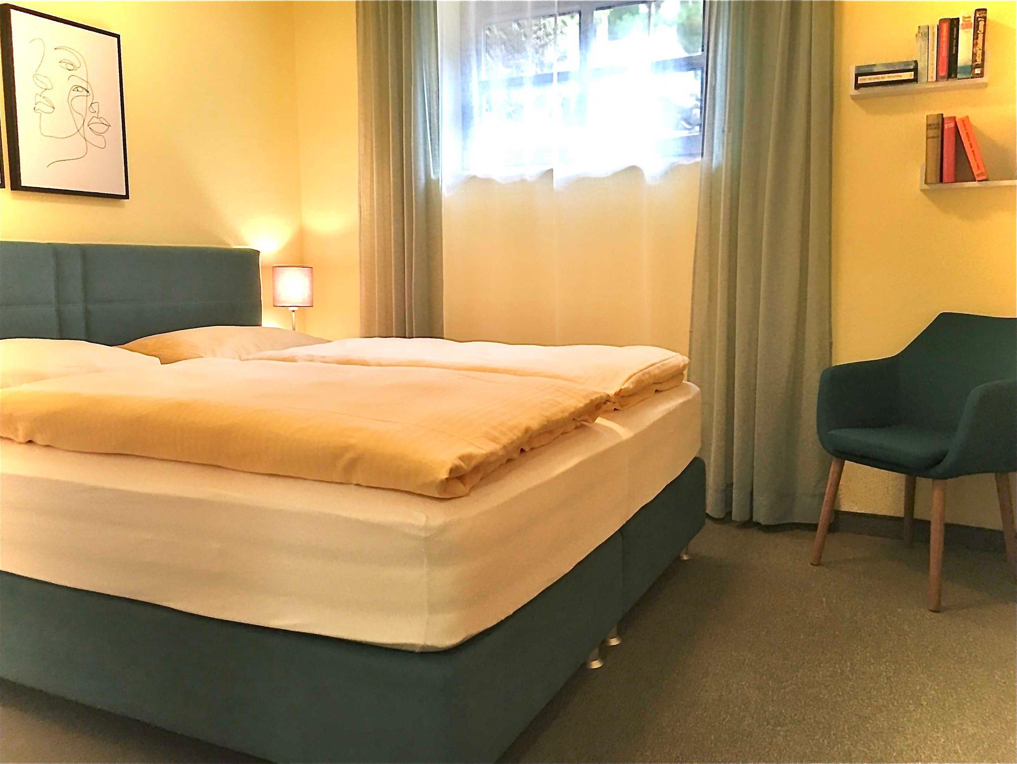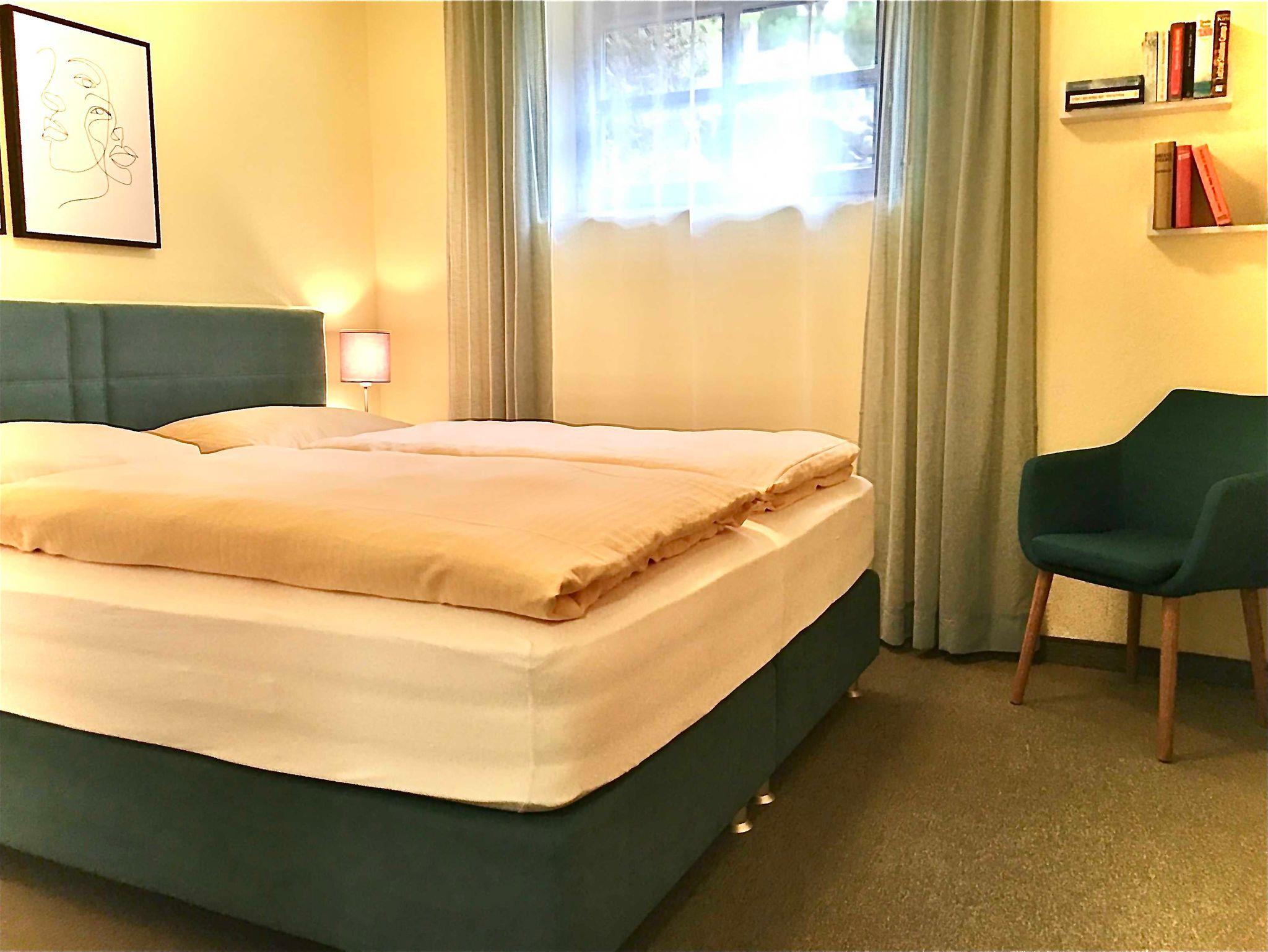 Schlafzimmer 2 mit 2 Boxspringbetten, Nachttisch/Beleuchtung, Kleiderschrank, Kleiderablage, Stuhl
