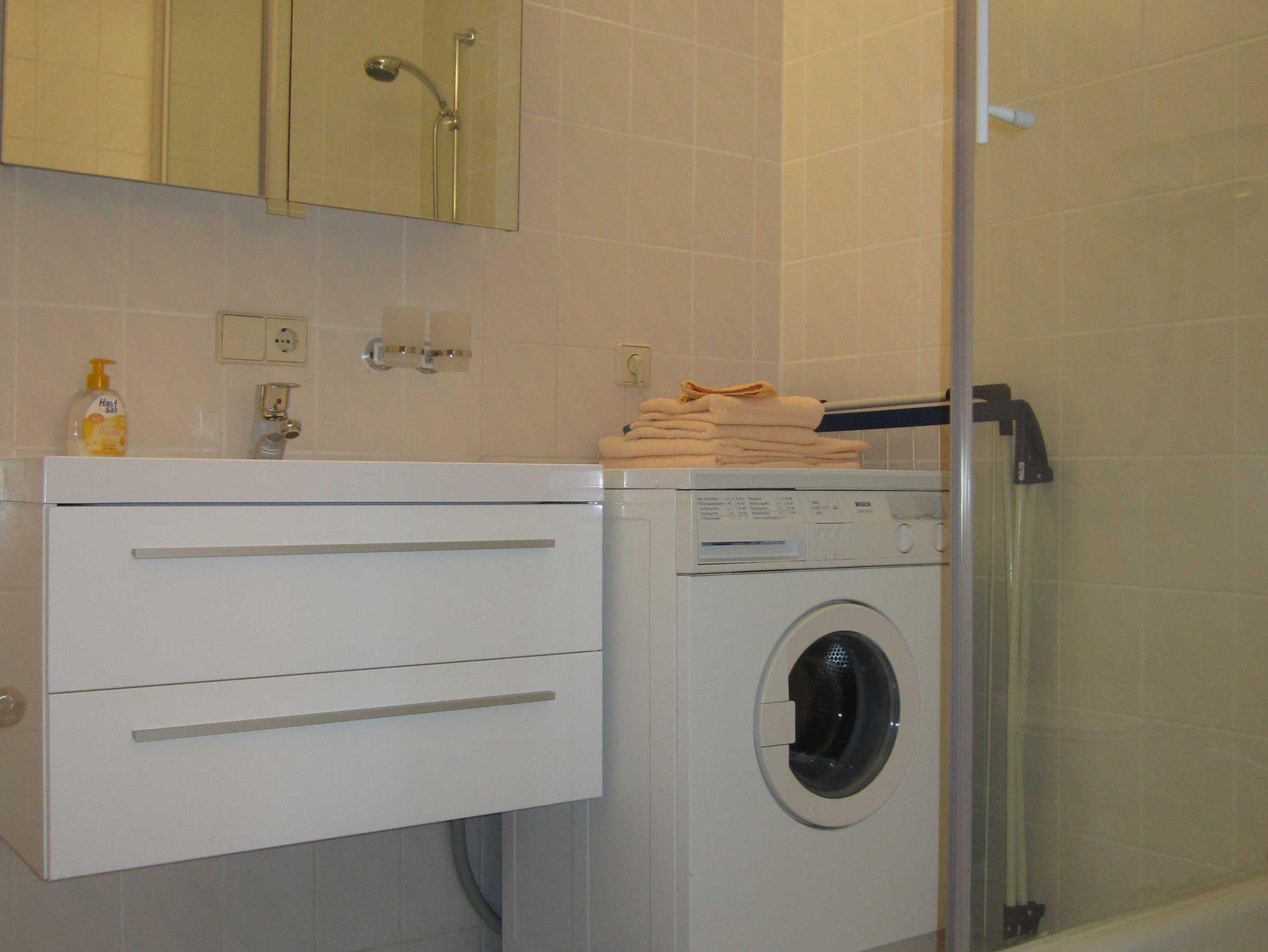 Dusche/WC mit Waschtisch, Spiegelschrank, Handtuchwärmer, Kosmetikspiegel, Regendusche, Fön, Waschmaschine