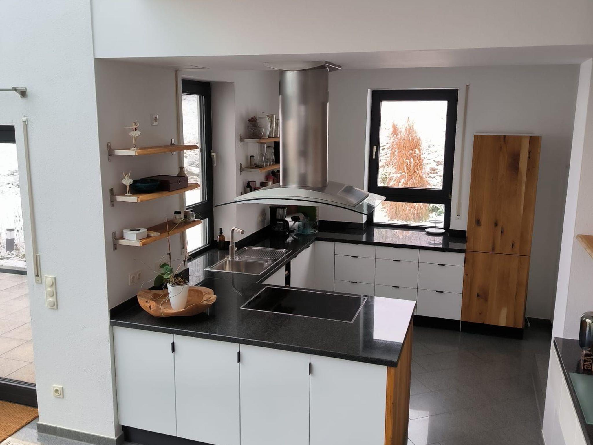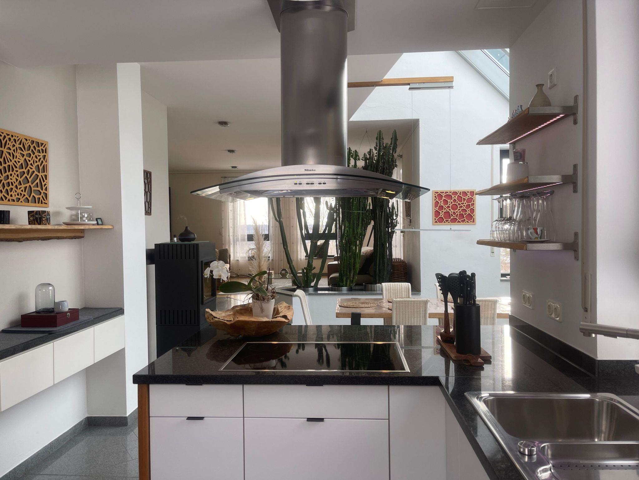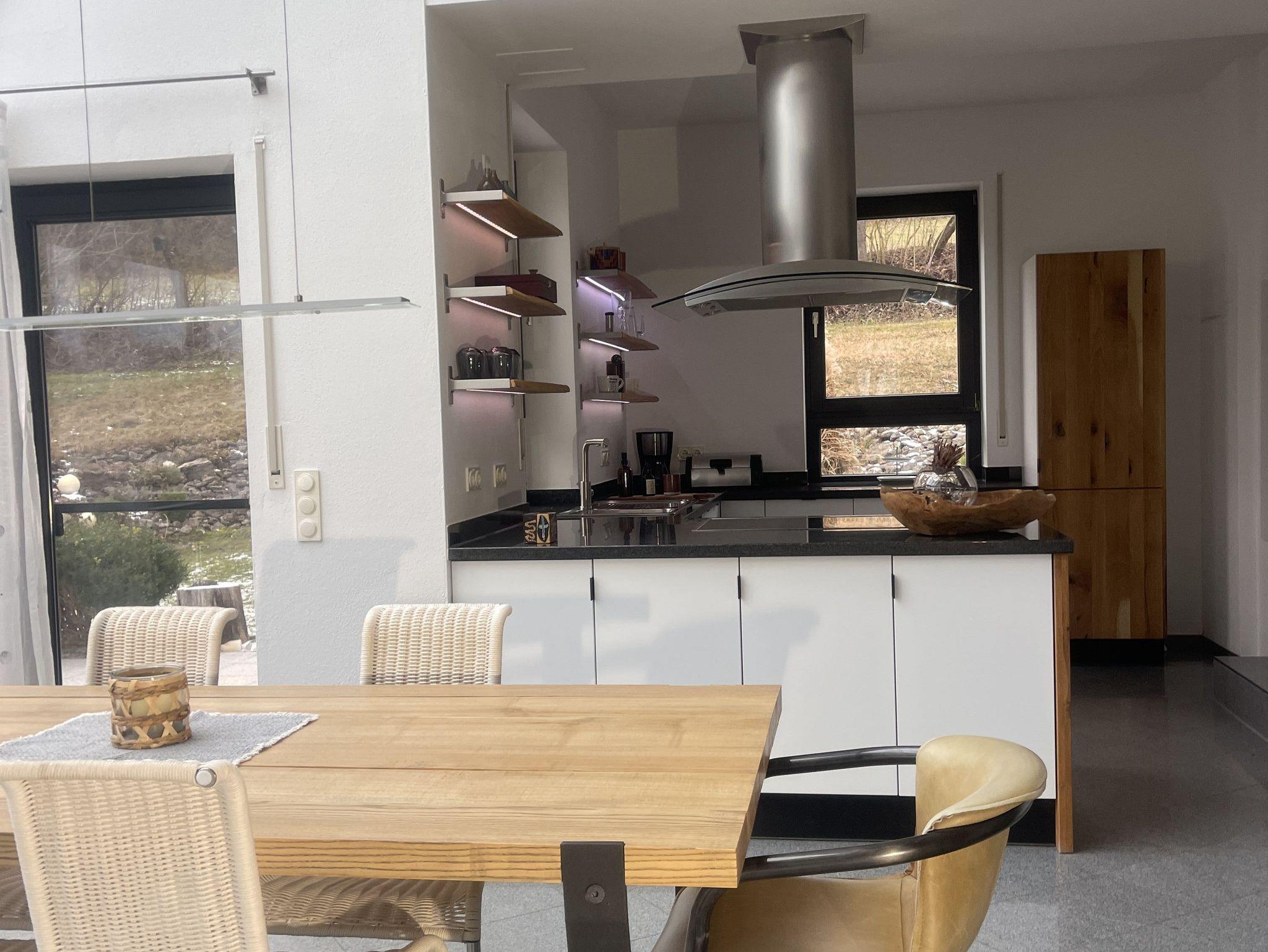 Die voll ausgestattete Küche fügt sich harmonisch in den offenen Wohn- und Essbereich ein und überzeugt mit Funktionalität und Stil. Großzügige Fenster und der angrenzende Wintergarten sorgen für ein helles, freundliches Ambiente. An kühlen Tagen schafft der Schwedenofen eine besonders gemütliche Atmosphäre - ideal für entspannte Abende daheim.