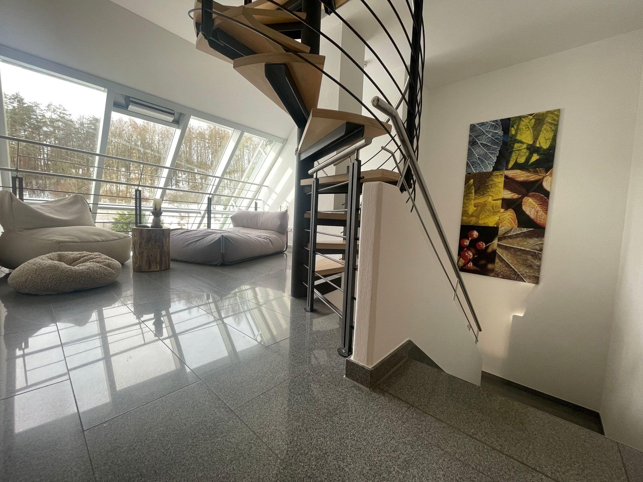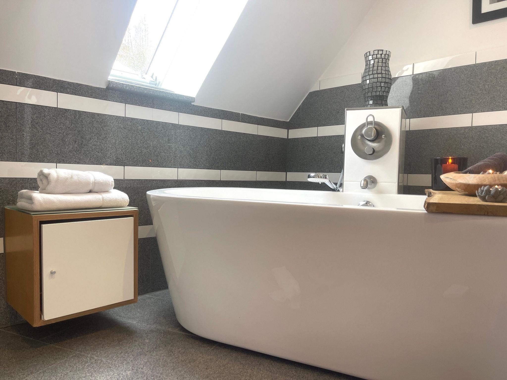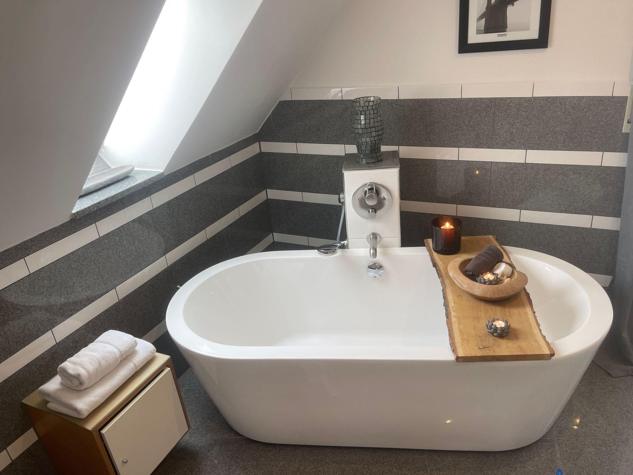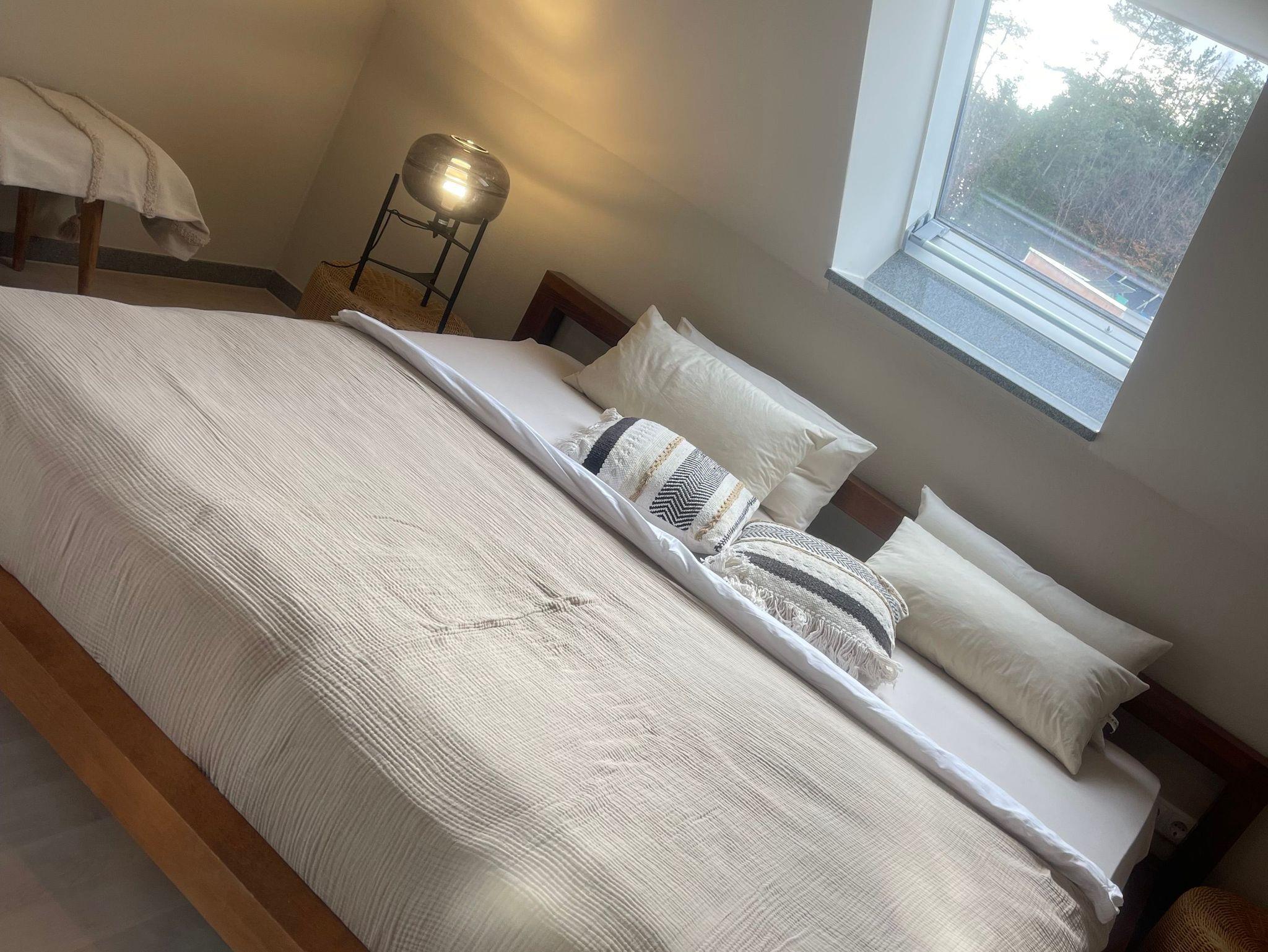 Im OG erwarten Sie drei helle und gemütliche Schlafzimmer sowie eine offene Galerie mit Blick in den Wohnbereich. Das moderne Badezimmer lässt keine Wünsche offen: Mit freistehender Badewanne, ebenerdiger Dusche und eigener Sauna wird Ihr Aufenthalt zum privaten Wellnesserlebnis.