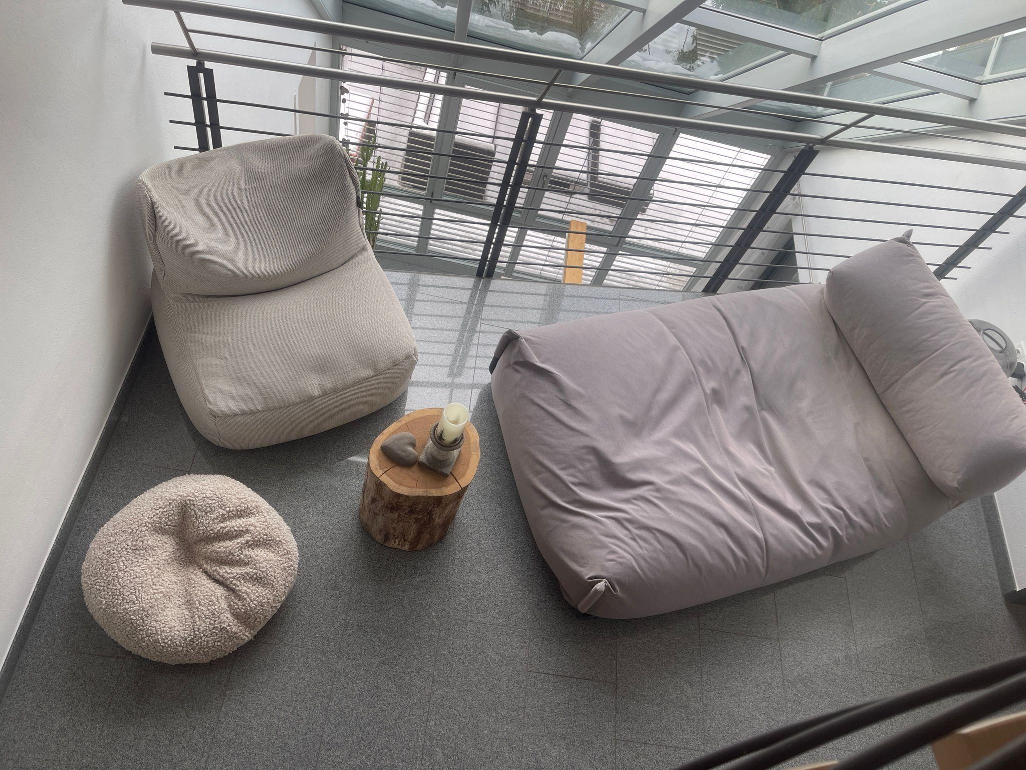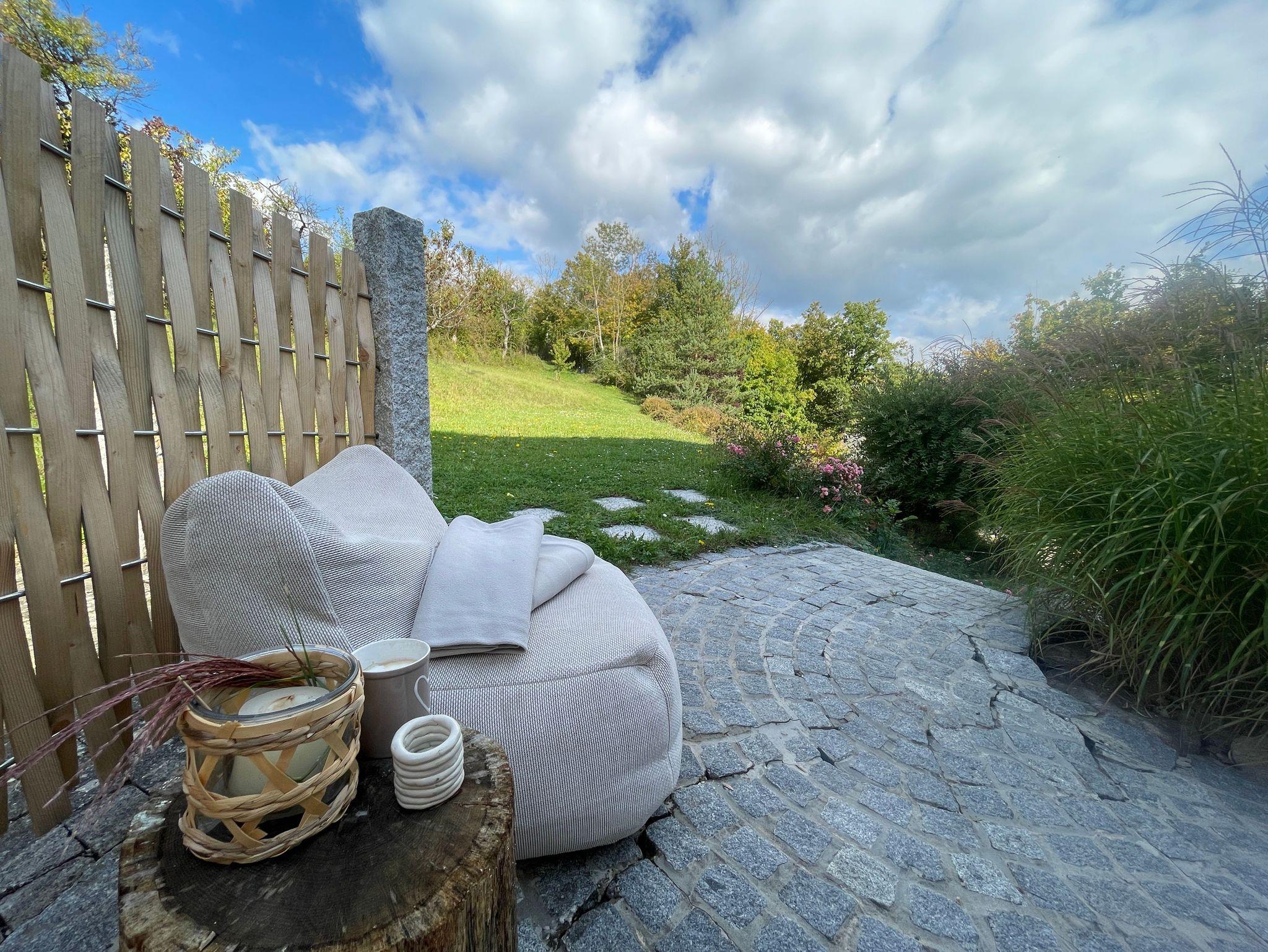 Unsere Ferienwohnung verfügt zudem über eine eigene Terrasse mit Lounge-Möbeln, einem Gartenbereich mit Liegestühlen, großem Esstisch und Grill. Hier können Sie entspannen, die Sonne genießen oder gemütliche Grillabende in privater Atmosphäre verbringen.