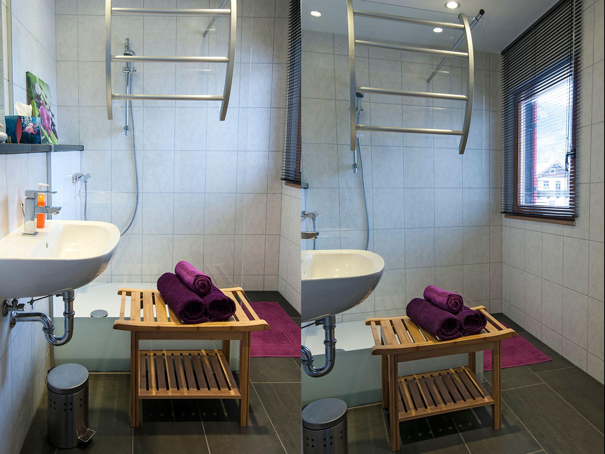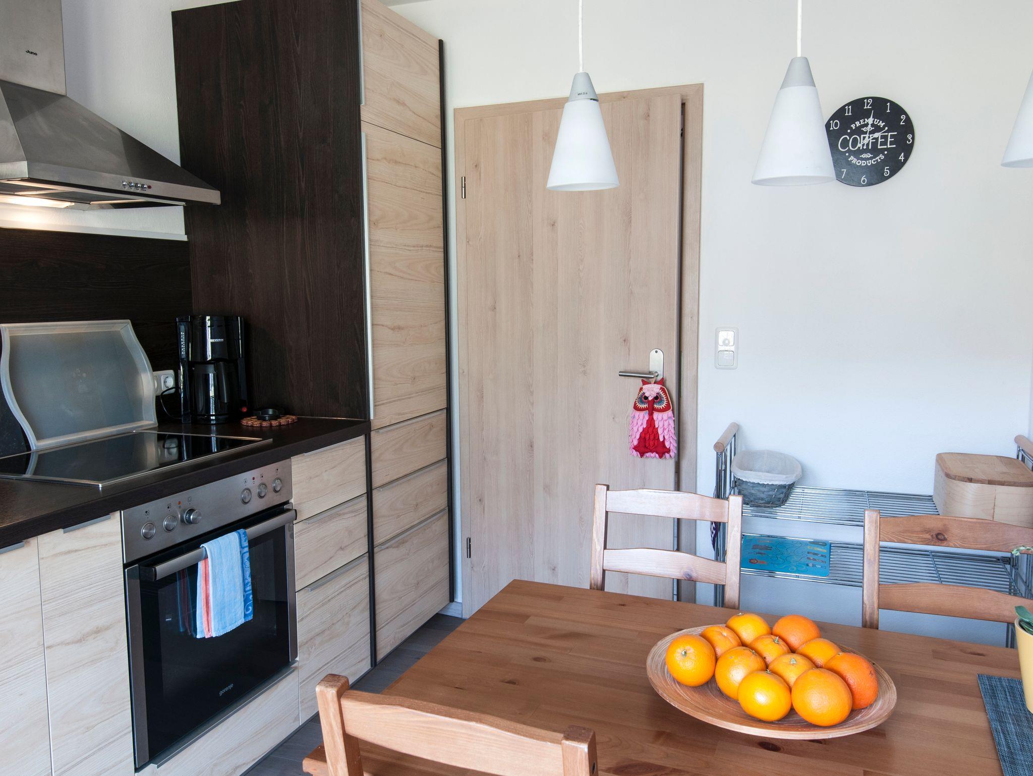 Die Ferienwohnung im 1. Obergeschoss ist über eine separate Außentreppe erreichbar. Neben einem Schlafzimmer mit Zusatzbett gibt es ein Wohn-/Schlafzimmer mit Doppelbett, ein separates WC, eine separate Küche mit Essplatz und ein Bad mit geräumiger Dusche. Handtücher und Bettwäsche werden gestellt. Alle Zimmer mit Zugang zum Balkon. Balkonmöbel vorhanden. Sat-TV mit Internet-Zugang und freies WLAN. Eine Bushaltestelle befindet sich direkt am Haus.