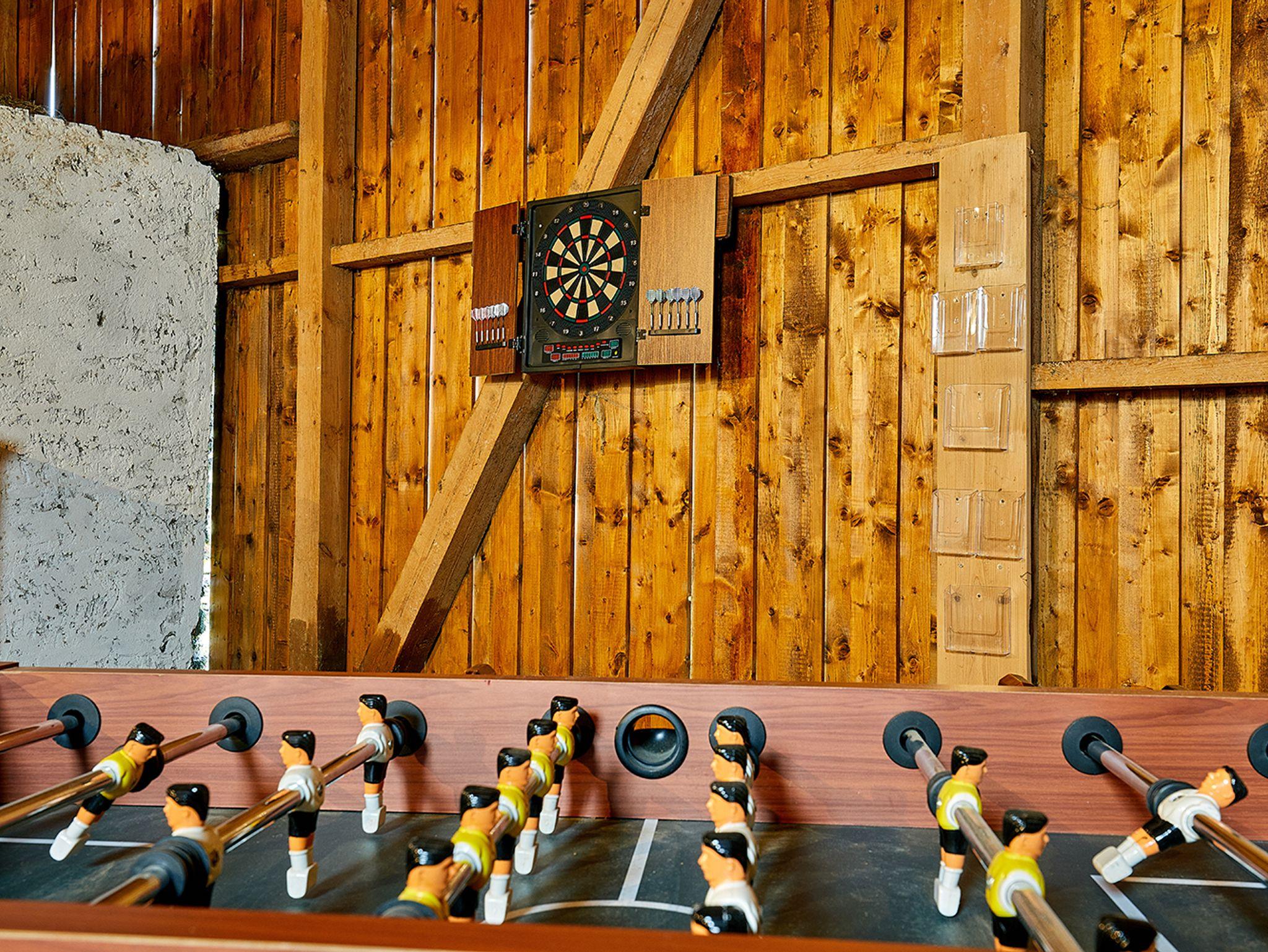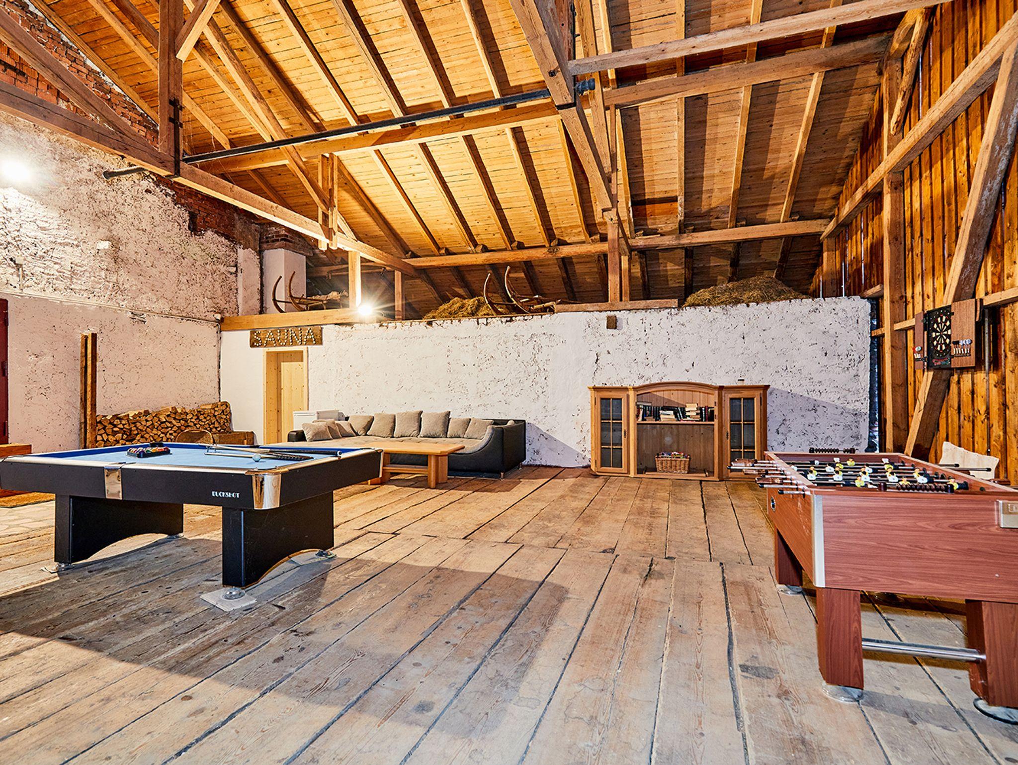 Ein besonderes Highlight ist die alte Tenne mit ca. 300 m², die als großzügiges „Outdoor-Wohnzimmer“ gestaltet ist. Hier laden ein gemütliches Sofa, ein Getränkekühlschrank sowie Spielmöglichkeiten wie Billard, Kicker und Dart zum Verweilen ein. Zudem bietet die Tenne ausreichend Platz zur Unterstellung von Fahrrädern, Schlitten, Ski und weiterer Ausrüstung.