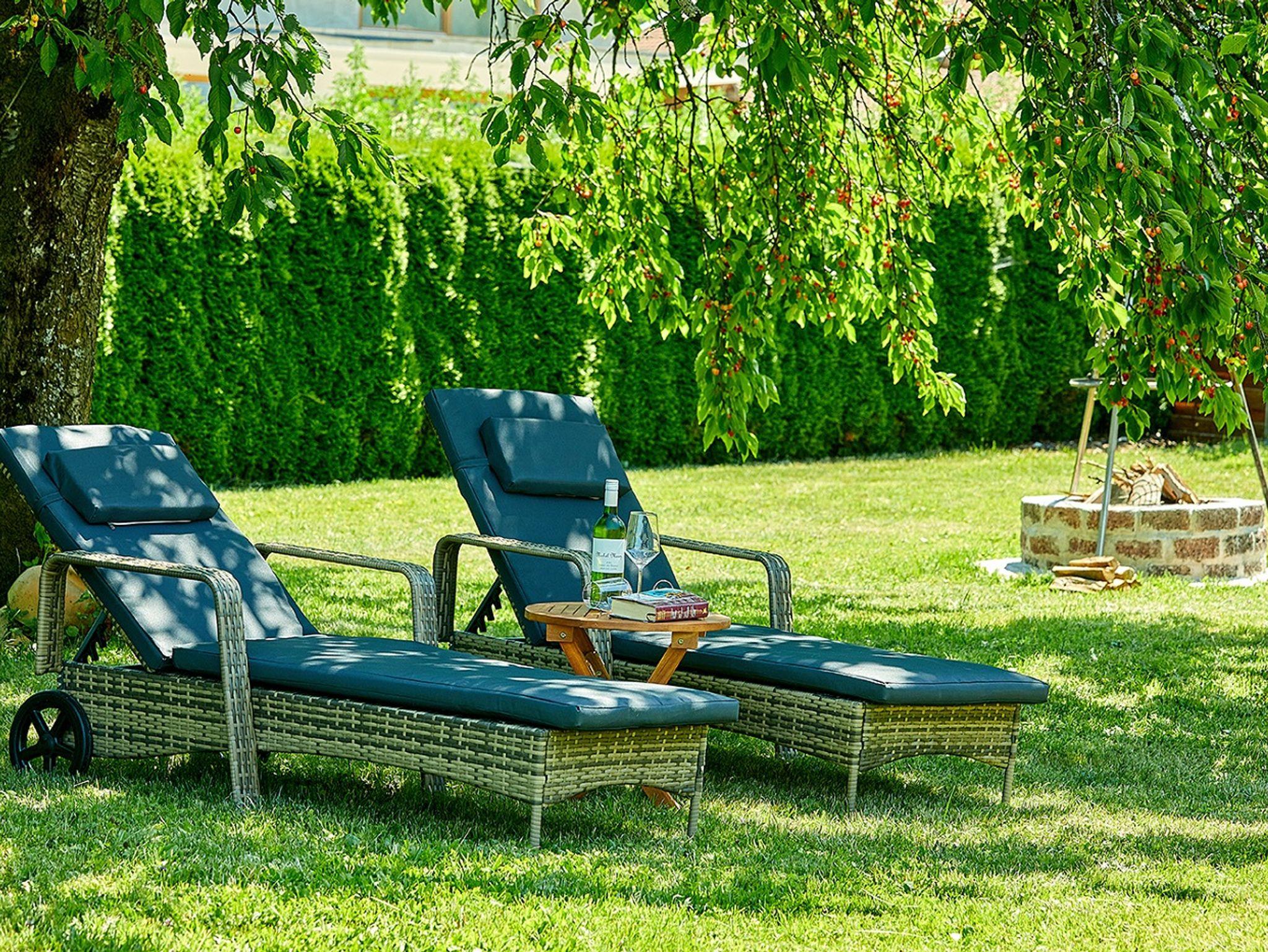 Der großzügig angelegte Garten mit Liegewiese, bequemen Gartenliegen und einer großen Terrasse mit Freisitz sowie Feuerstelle für Lagerfeuer ist der perfekte Ort, um sonnige Sommertage in entspannter Atmosphäre zu genießen.