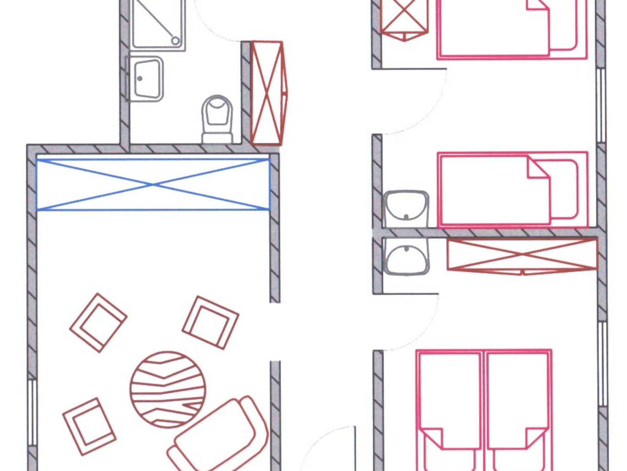 Raumaufteilung: 1 Schlafraum (1 Doppelbett, 1 Kinderbett), 1 Wohnzimmer, 1 separate Küche, 1 Badezimmer mit Dusche.