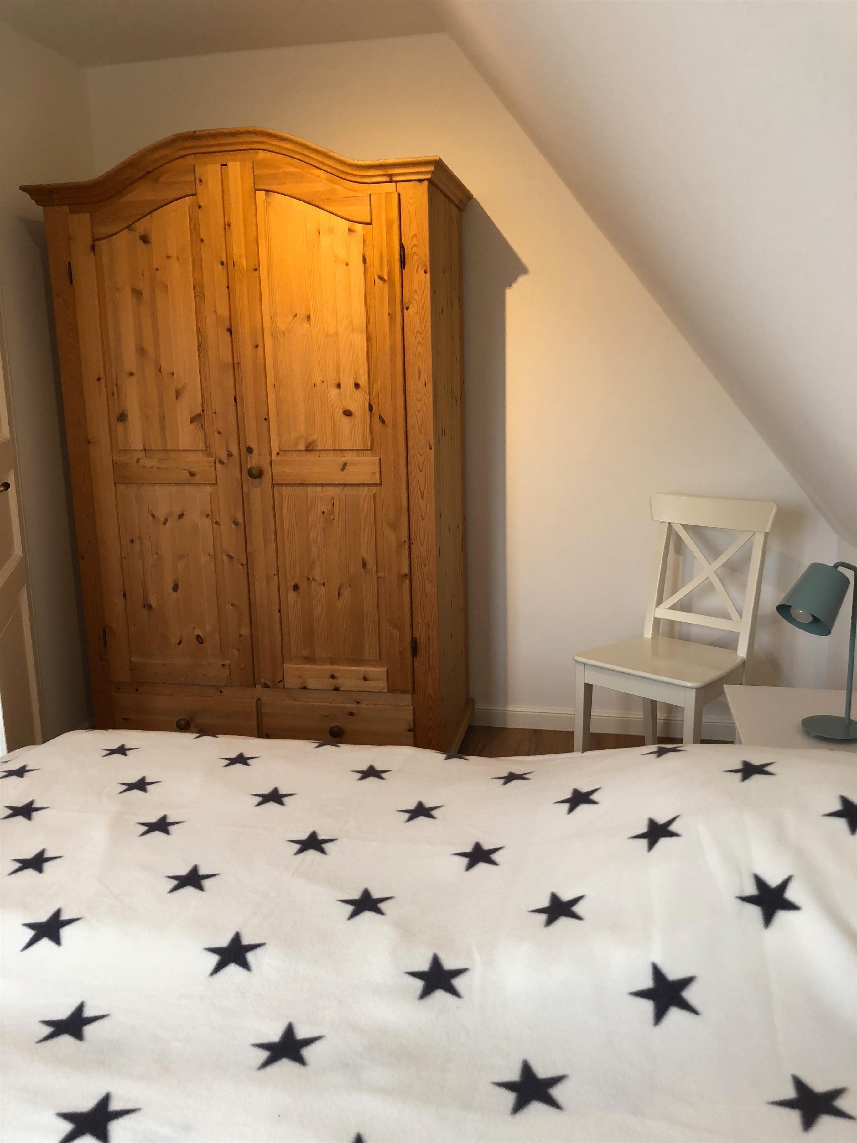 und ein Einbauschrank. Das Schlafzimmer ist mit einem geräumigen Doppelbett sowie einem Einbauschrank ausgestattet.