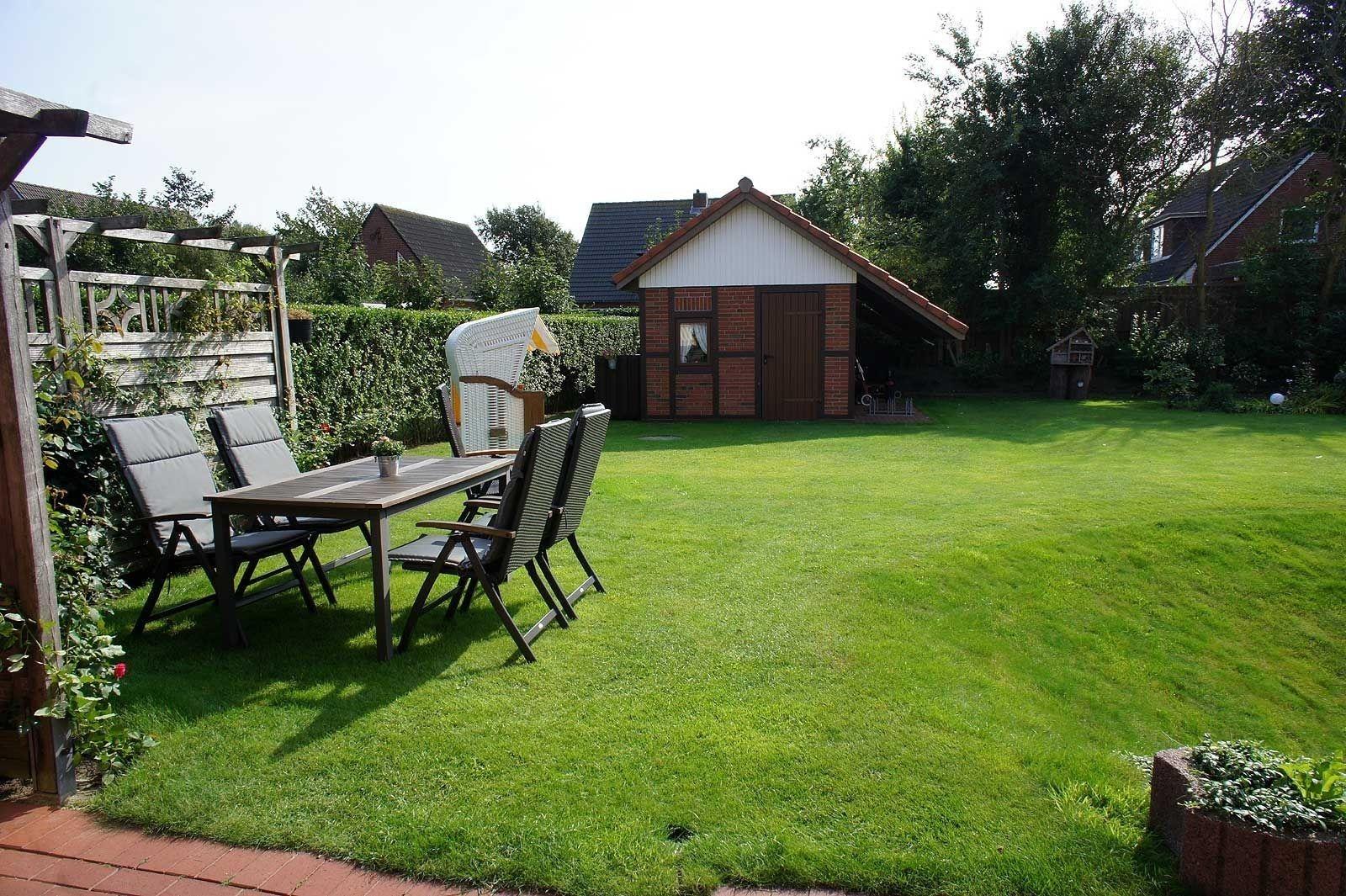 Im Garten mit Liegewiese können sie entspannen, sonnenbaden und abends grillen und auch an kühleren Tagen ist im Gartenhaus reichlich Platz dazu.