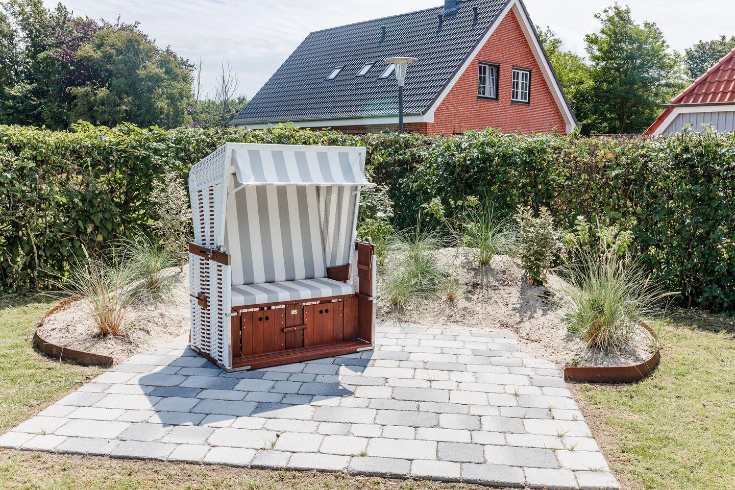 Entspannen Sie auf der südwestlich ausgerichteten Terrasse im großzügigen Garten, der vollständig von einer Hecke umgeben ist. Zwei PKW-Stellplätze, eine E-Auto-Ladestation und eine Abstellmöglichkeit für Ihre Fahrräder runden das Angebot ab. In den Monaten Mai - September steht Ihnen ein Strandkorb am Haus zur Verfügung.