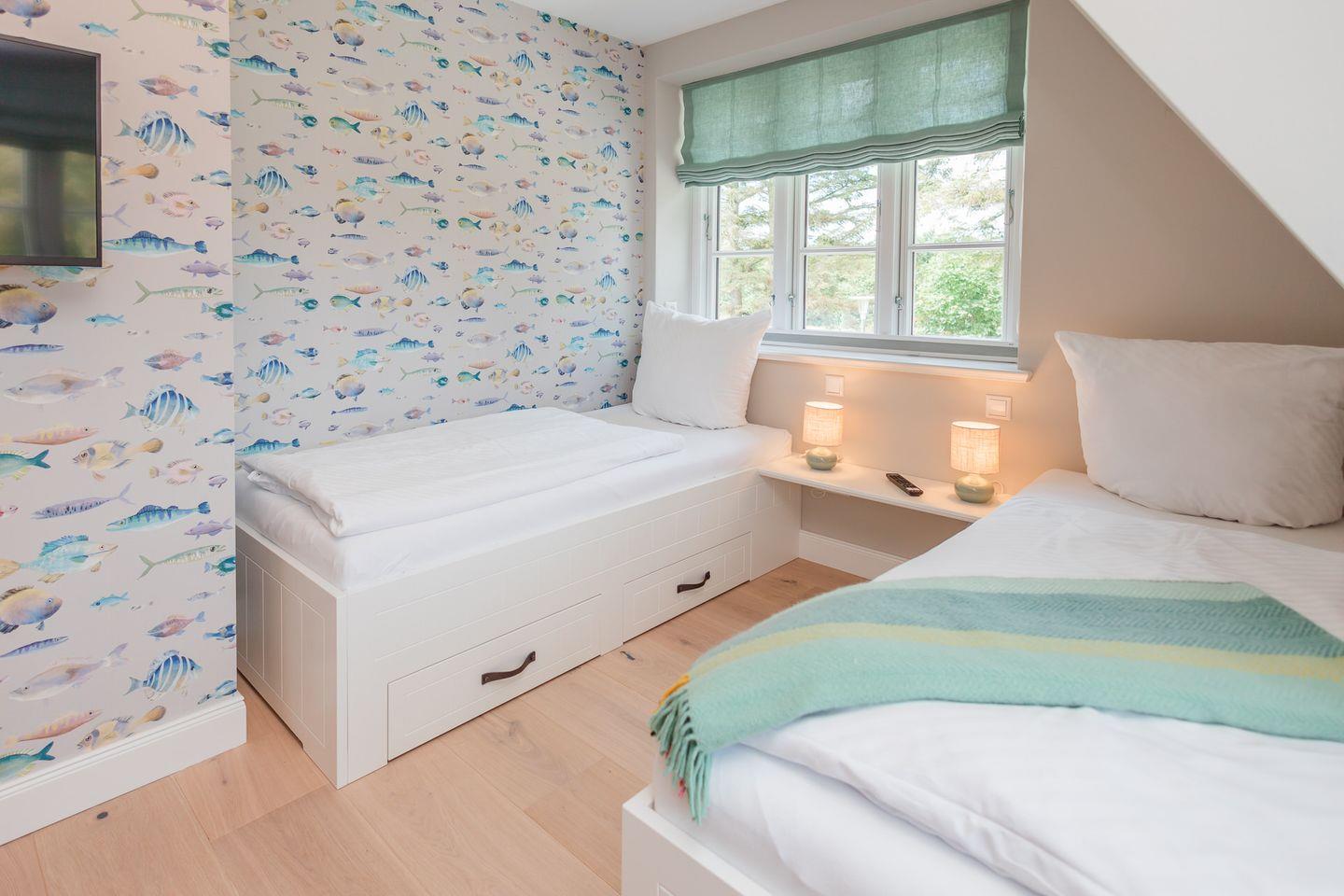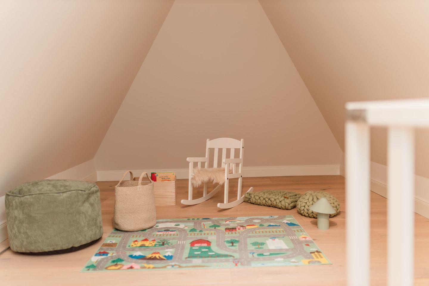 Im Obergeschoss sind die drei Schlafzimmer - zwei mit je einem Doppelbett und eines mit zwei Einzelbetten - sowie ein weiteres Duschbad gelegen. Alle Schlafzimmer sind mit einem Smart-TV ausgestattet. Im Dachgeschoss steht Ihren Kleinen ein Raum zum Spielen und Toben zur Verfügung.