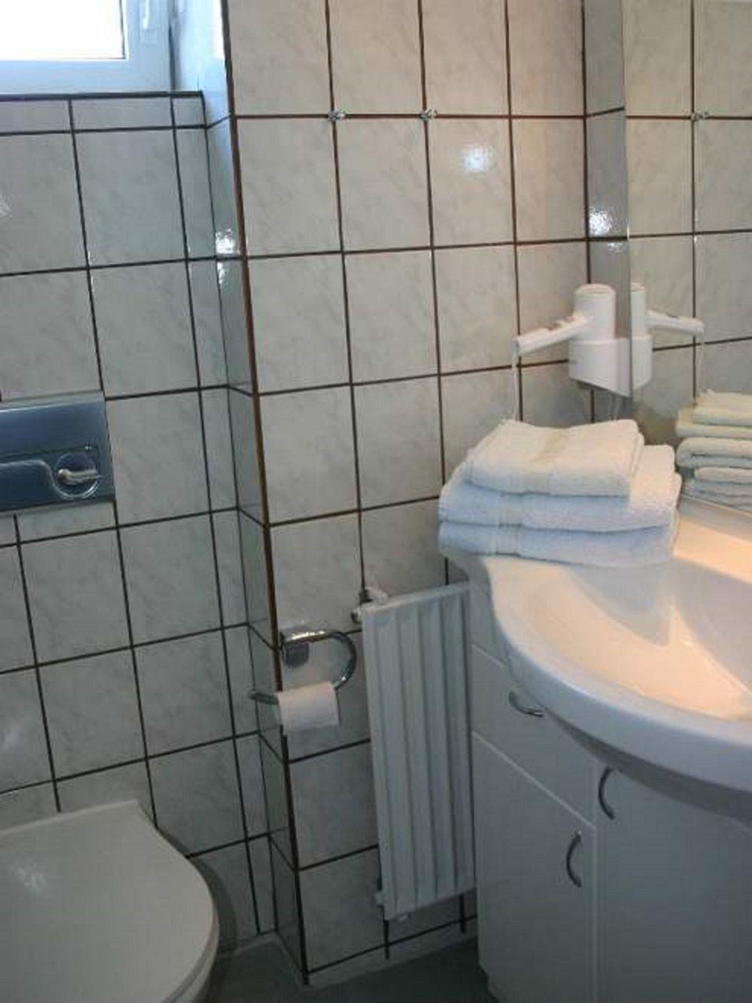 Das Badezimmer verfügt über Dusche, WC und Waschbecken. Eine Waschmaschine und ein Trockner stehen zur gemeinschaftlichen Nutzung (gegen Gebühr) zur Verfügung, was besonders praktisch für längere Aufenthalte ist.