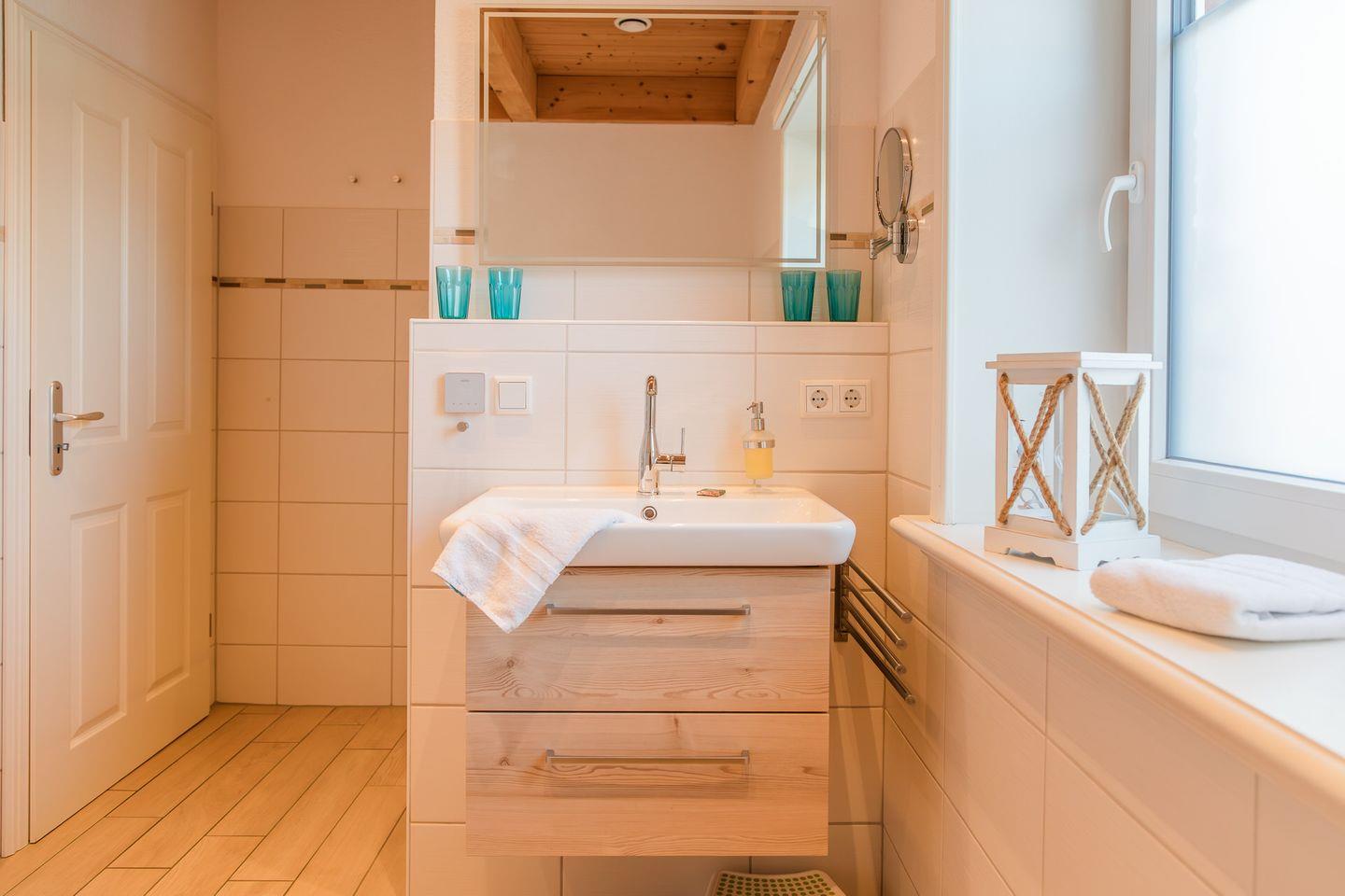 Im Erdgeschoss befinden sich ein Wohn- und Essbereich mit offener Küche, ein Schlafzimmer mit zwei Einzelbetten und ein Vollbad mit Badewanne und Raindance-Dusche, eine eingebaute Waschmaschine in der Küche. Über den Wohnbereich gelangen Sie auf die eigene Terrasse. Der Ethanol-Kamin sorgt auch an kühleren Tagen für eine angenehme Atmosphäre.