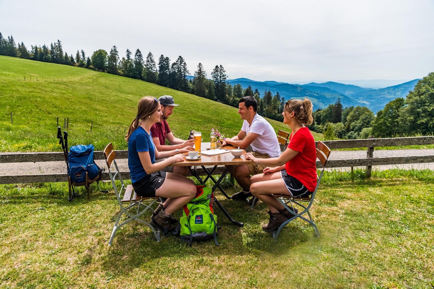 Eine sonnige Terrasse und ein gemütlicher Gastraum, schmackhafte Almküche und selbstgemachte Kuchen laden auf einer Wanderung oder Radtour zum Verweilen und Genießen dieser wunderschönen Landschaft ein.