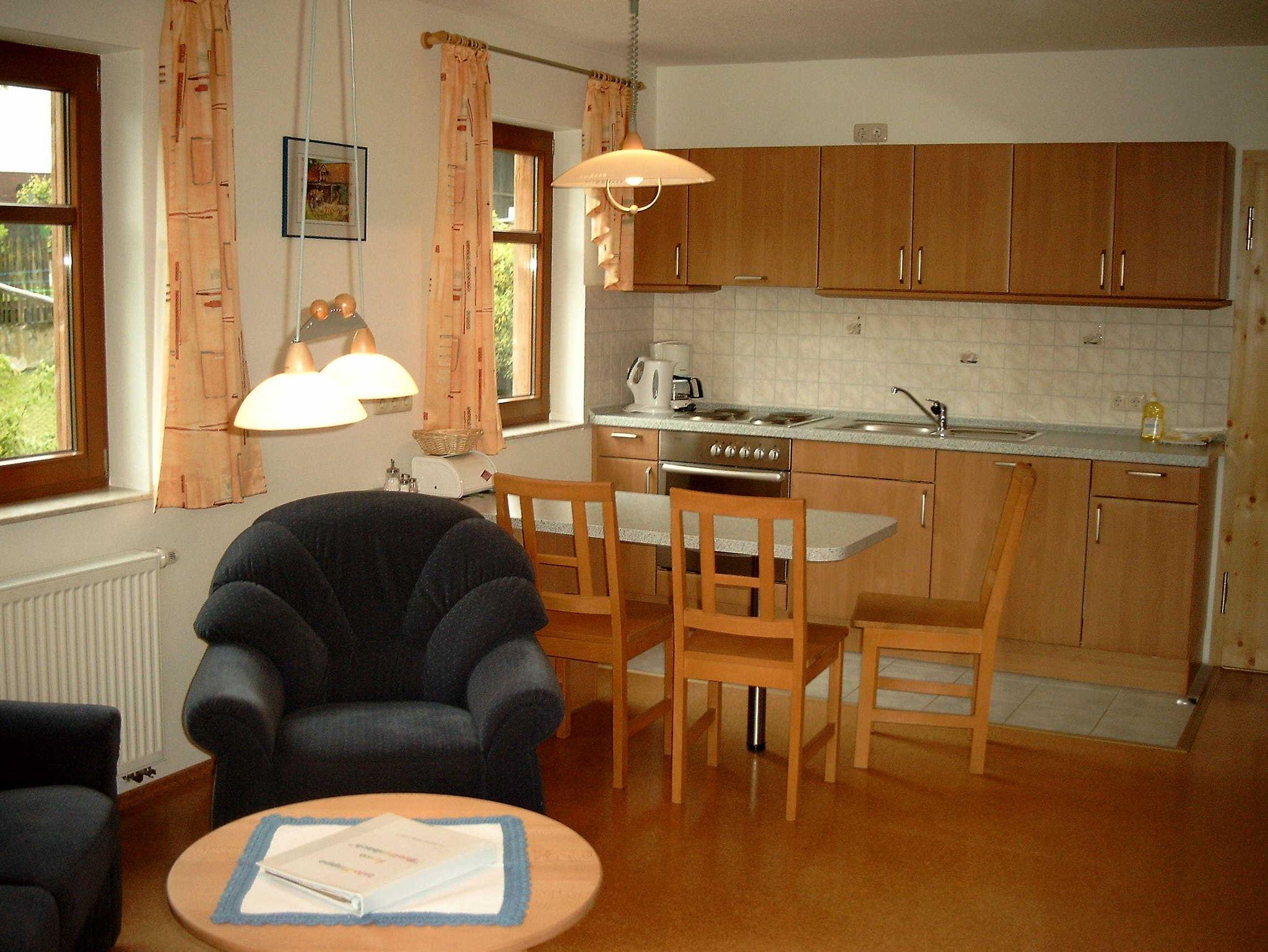 Gemütliche Ferienwohnung im I. OG mit Wohnküche, 1 Schlafraum, DU/WC mit ebenerdiger Dusche und überdachtem Balkon, Größe ca. 45 m², geeignet für bis zu 3 Personen.