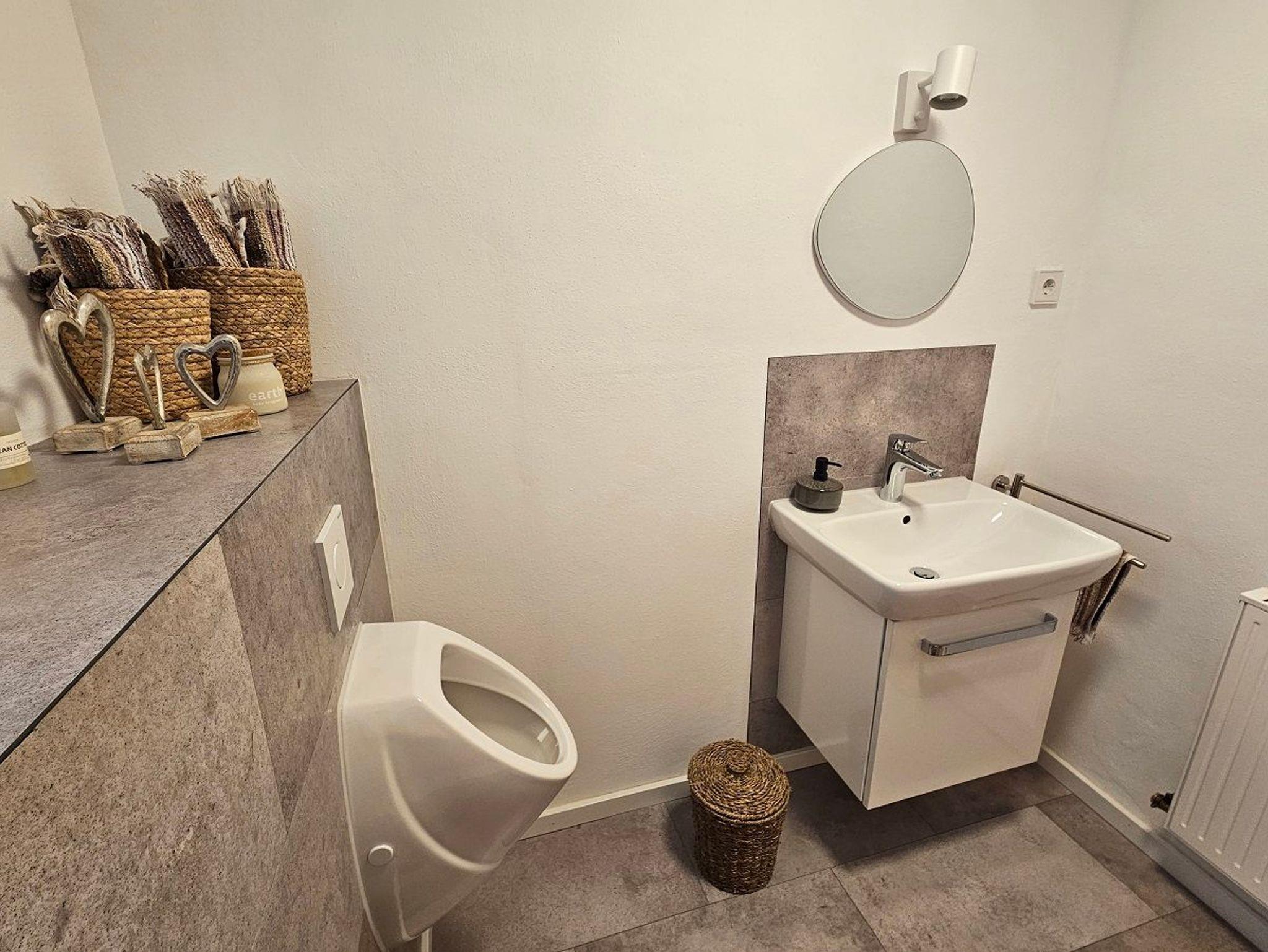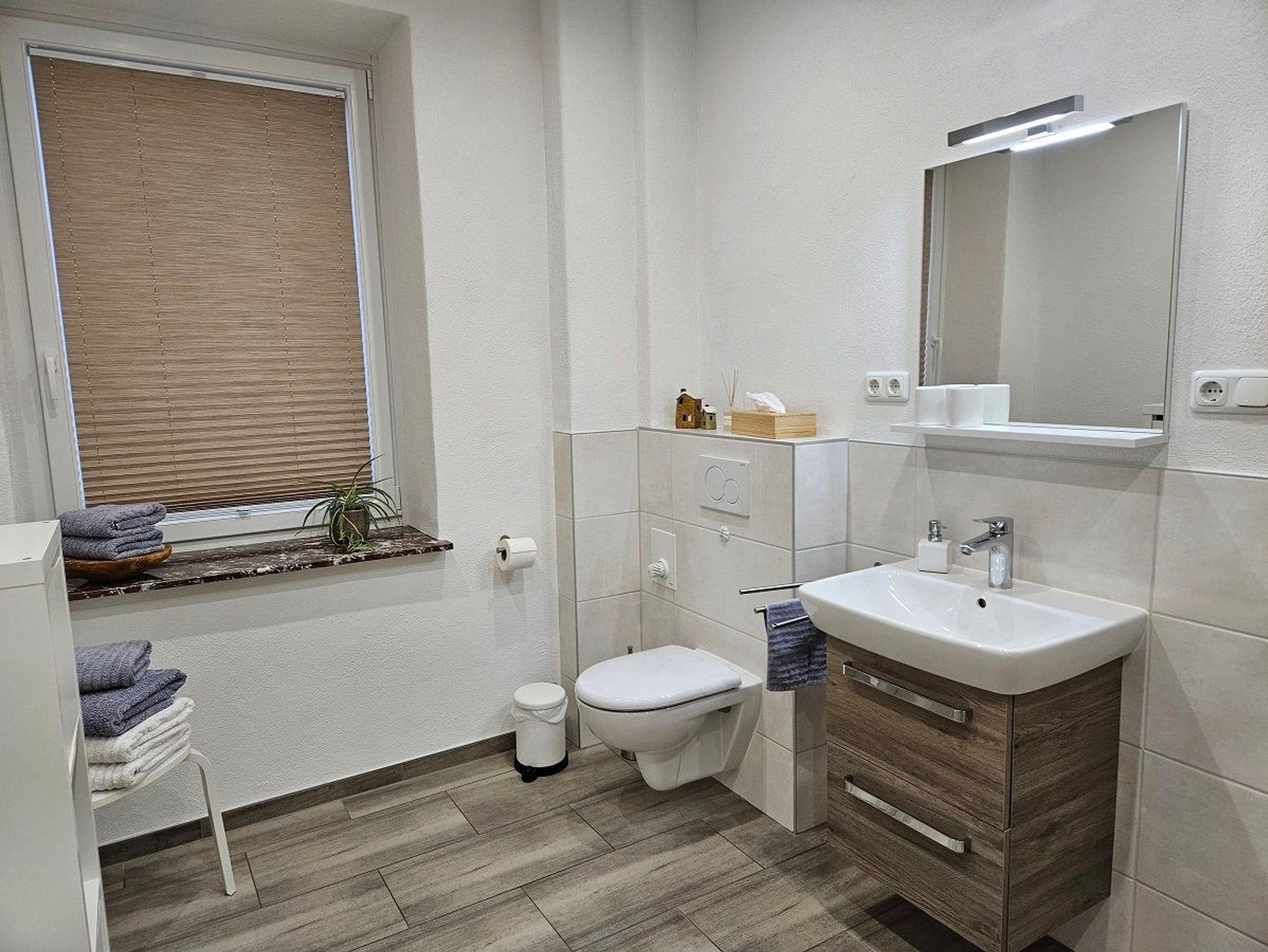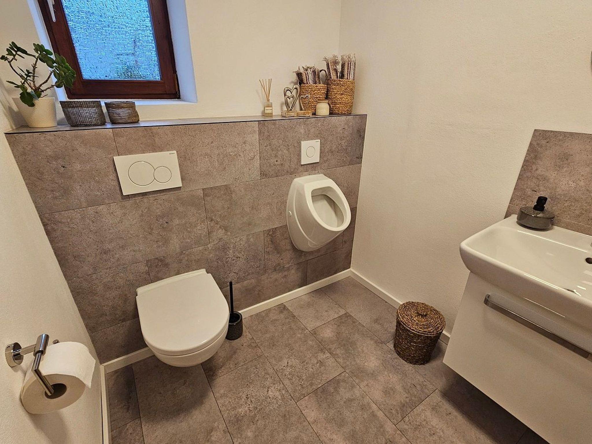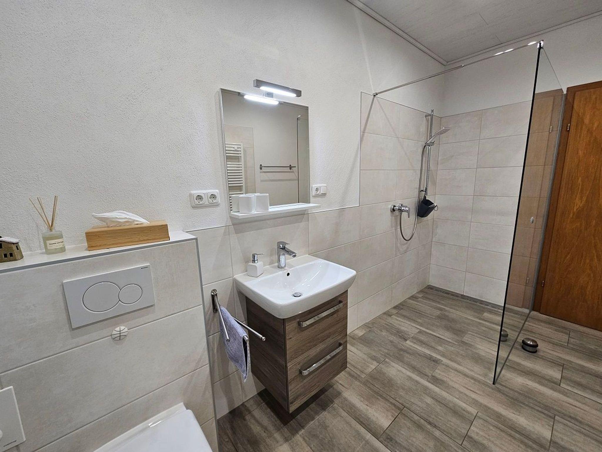 1 großes Bad mit bodengleicher Dusche, Seife und Toilettenpapier, Fußmatte, Tritthocker und Toilettensitz für Kinder, Fußbodenheizung, Handtuchheizkörper und Föhn, Handtücher werden gestellt.
