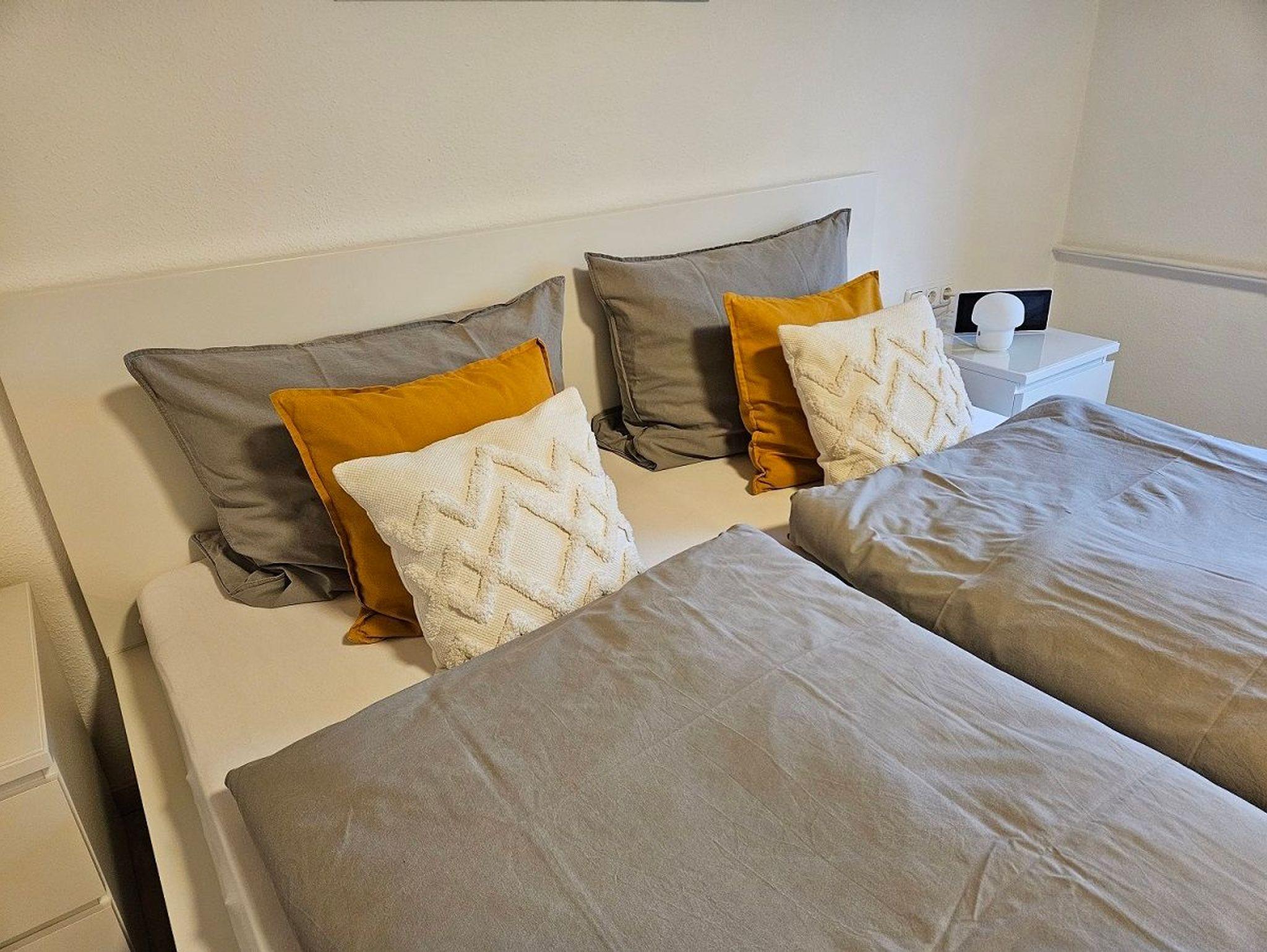 2 Schlafzimmer mit Doppelbetten 1,80 x 2,00 Meter, Nachtkonsolen, Kleiderschrank, Leselampe, Radiowecker (1 Schlafzimmer mit TV), Bettwäsche wird gestellt.