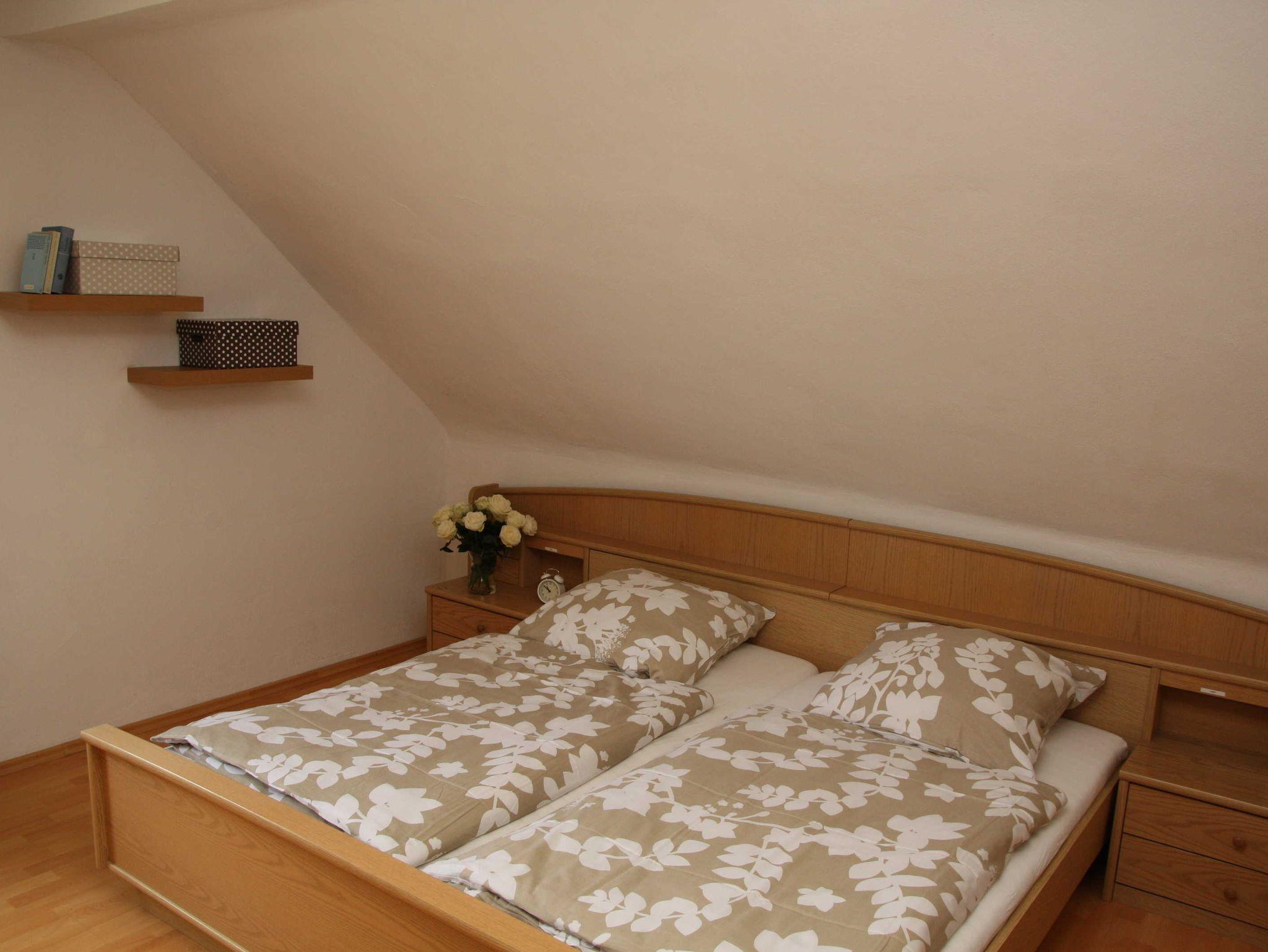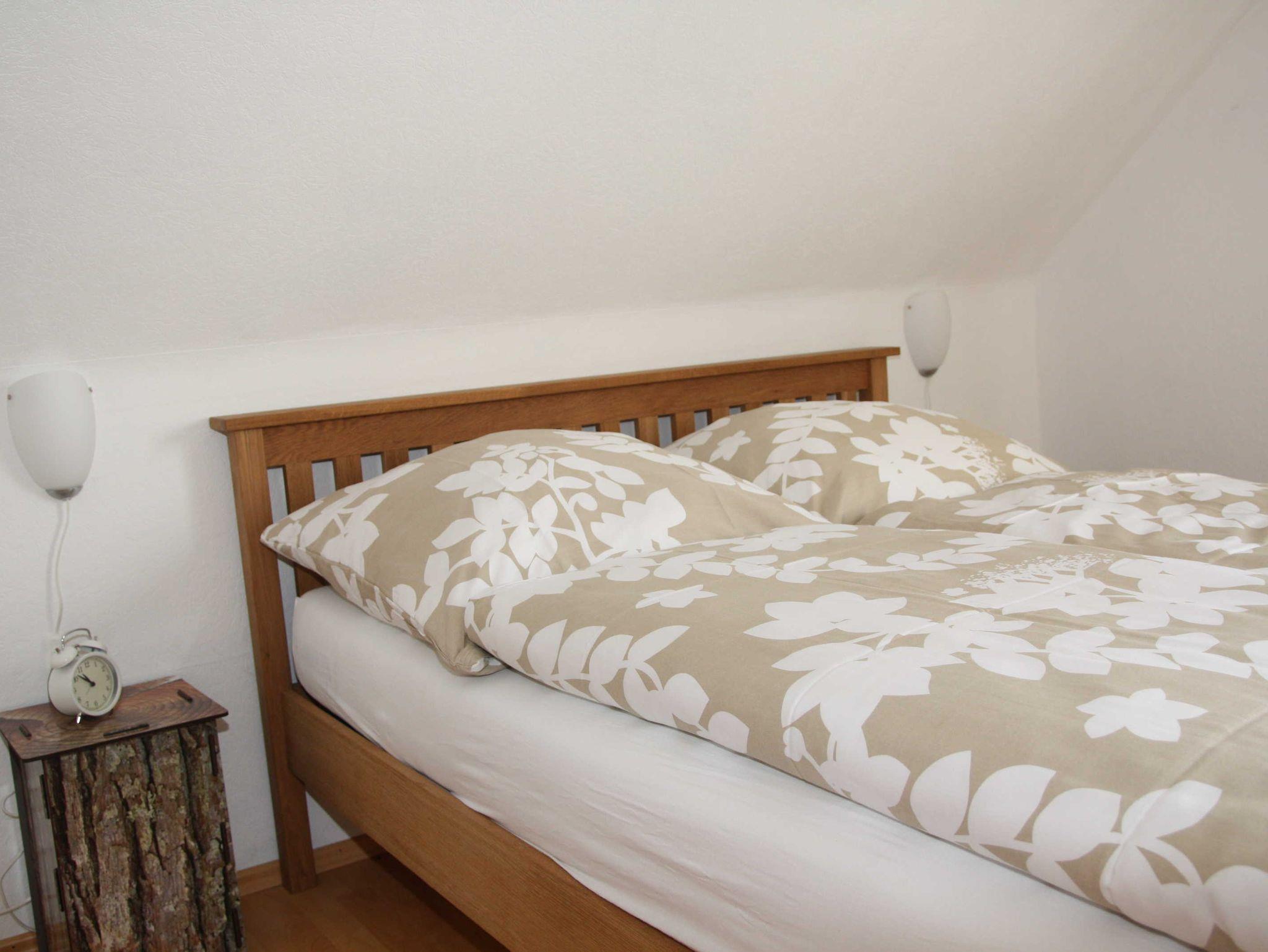 Die helle und großzügige Ferienwohnung liegt im Obergeschoss des Einfamilienhauses und bietet Schlafgelegenheit für bis zu 6 Personen. Sie verfügt über zwei separate Schlafzimmer, eines davon mit Doppelbett (2,00 x 2,00 m) und eines mit einem Bett von 1,40 x 2,00 m. In einem weiteren Wohn-Schlafraum, durch den beide Schlafräume zu erreichen sind, befindet sich eine Schlafcouch mit einer Bettgröße von 1,50 x 2,00 m. In diesem Durchgangszimmer steht unseren Gästen eine eigene Waschmaschine, ein Wäschetrockner und ein Bügeleisen zur Verfügung. Dies ist komplett im Schrank untergebracht und stört daher nicht die Gemütlichkeit.