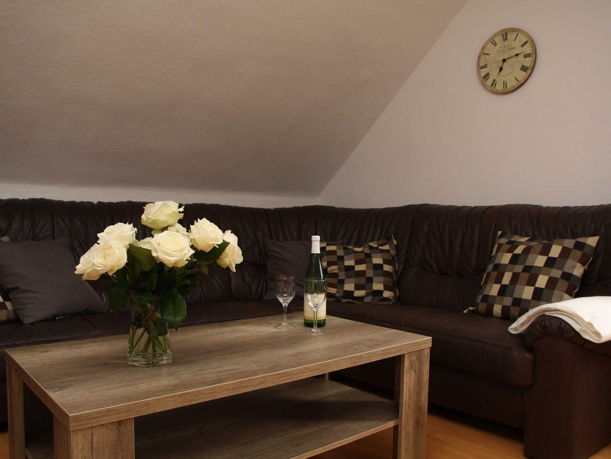 Im gemütlichen Wohnzimmer befindet sich eine Sitzgruppe aus Leder sowie ein Flachbild-TV und ein CD-Player mit Radio. Auch W-LAN ist verfügbar.