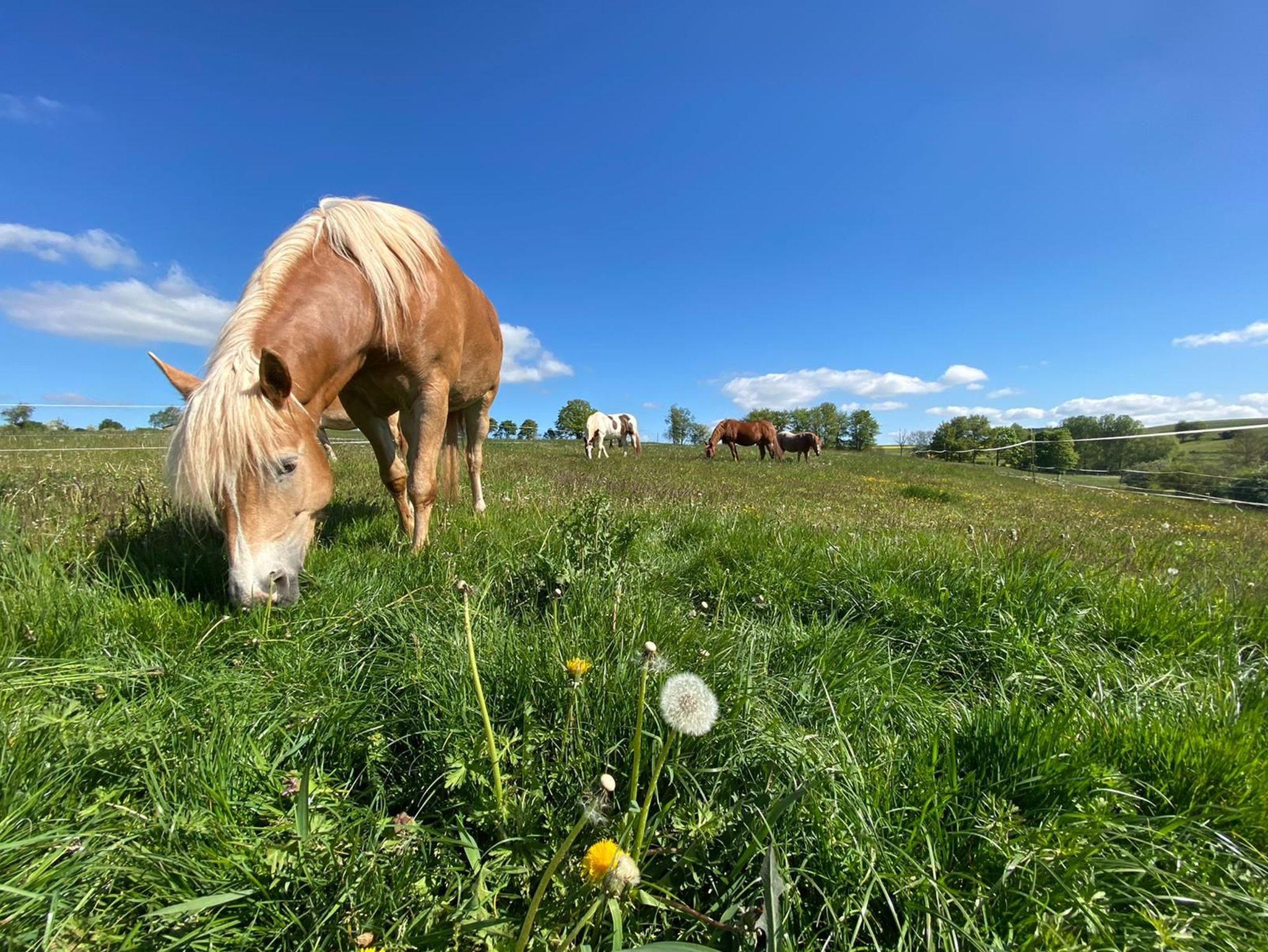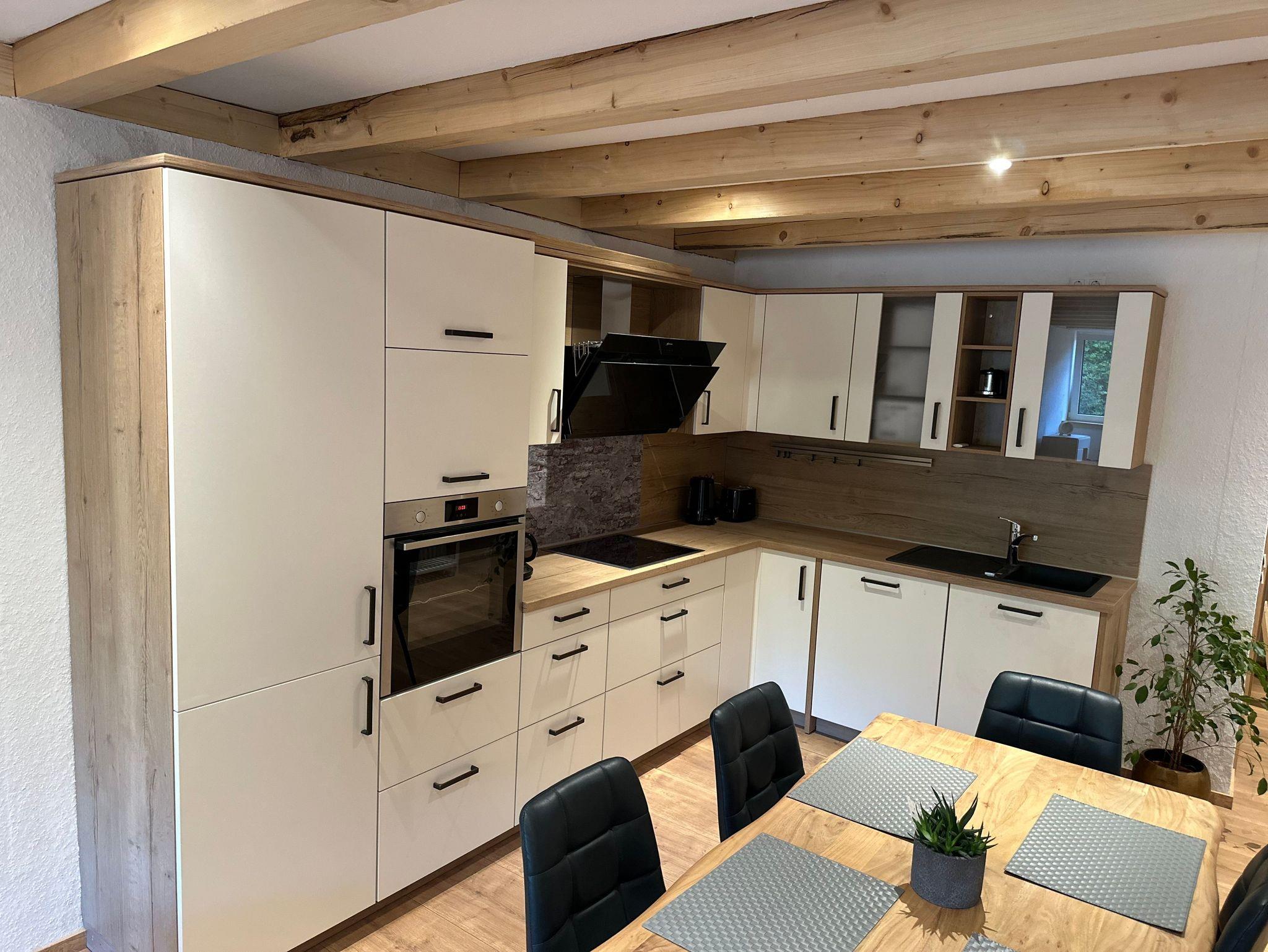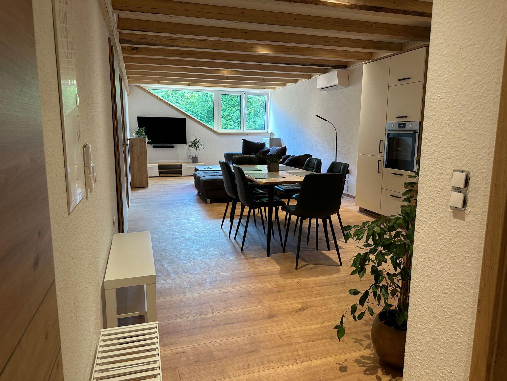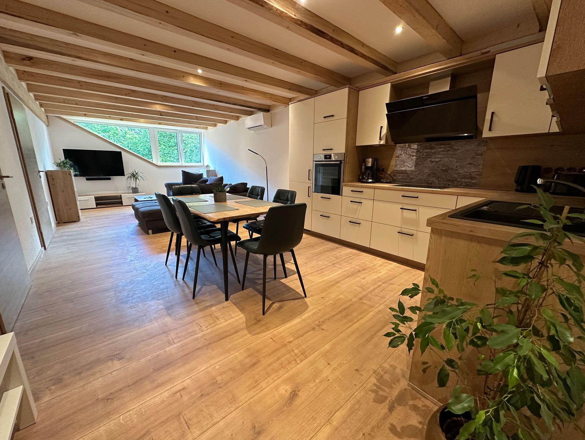 Der geräumige, offene Wohn- und Essbereich lädt zum Entspannen und Genießen ein. Ein großer Esstisch bietet Platz für gemeinsame Mahlzeiten, während die großzügige Sofalandschaft den perfekten Ort für entspannte Stunden mit Blick ins Grüne auf die idyllischen Hofweiden bietet. Die liebevoll durchdachte Einrichtung sorgt für eine gemütliche Atmosphäre, in der ihr euch wie zu Hause fühlt.