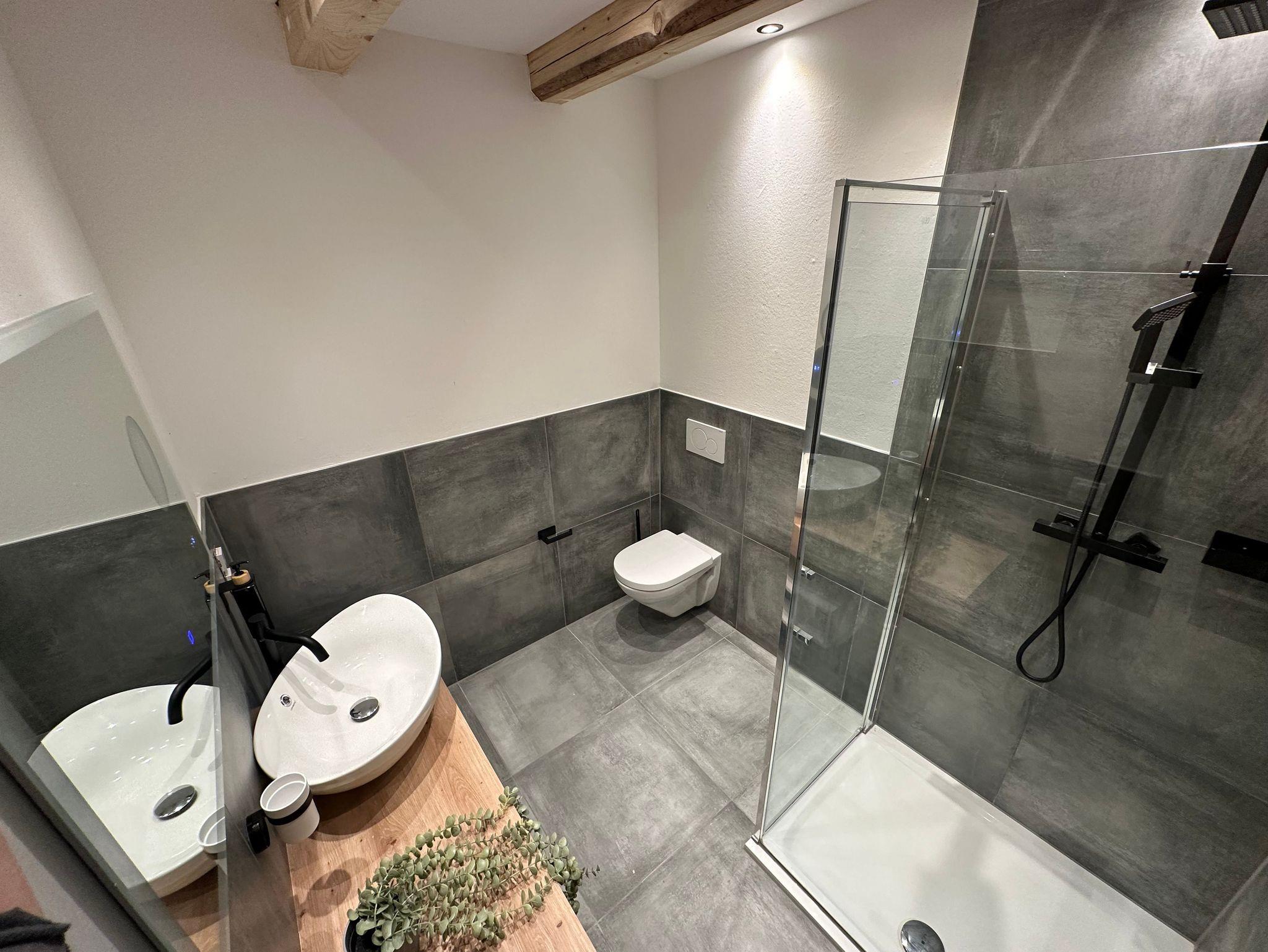 Die voll ausgestattete Küche lässt keine Wünsche offen und verfügt über einen Geschirrspüler, hochwertige Elektrogeräte (Kühlschrank, Gefrierfächer, Kochfeld, Mikrowelle, Ofen) sowie Toaster, Kaffeemaschine und Wasserkocher. Das modern eingerichtete Badezimmer ist mit einer geräumigen ebenerdigen Dusche, hochwertigen Armaturen und einem beleuchteten Spiegel ausgestattet.