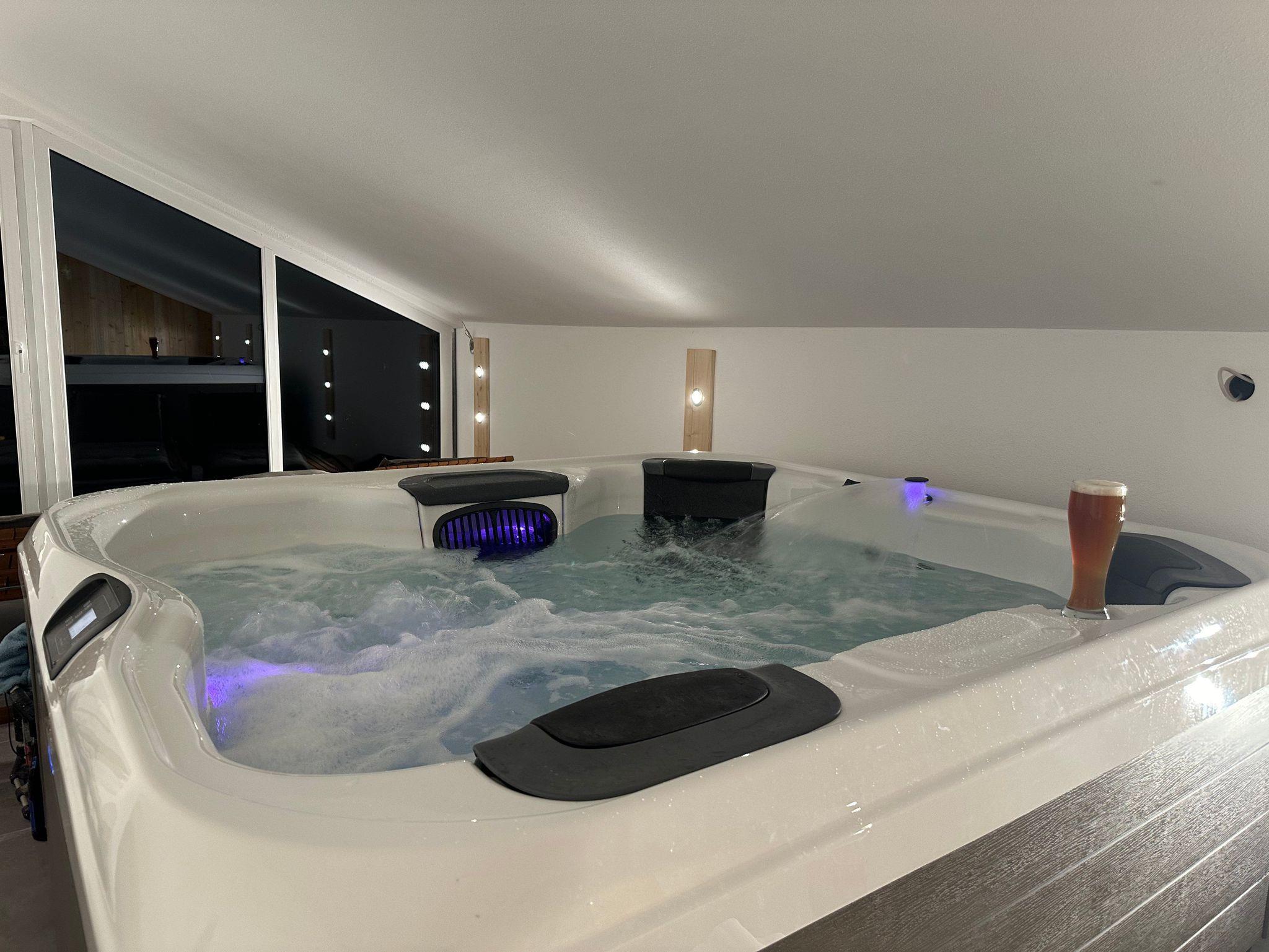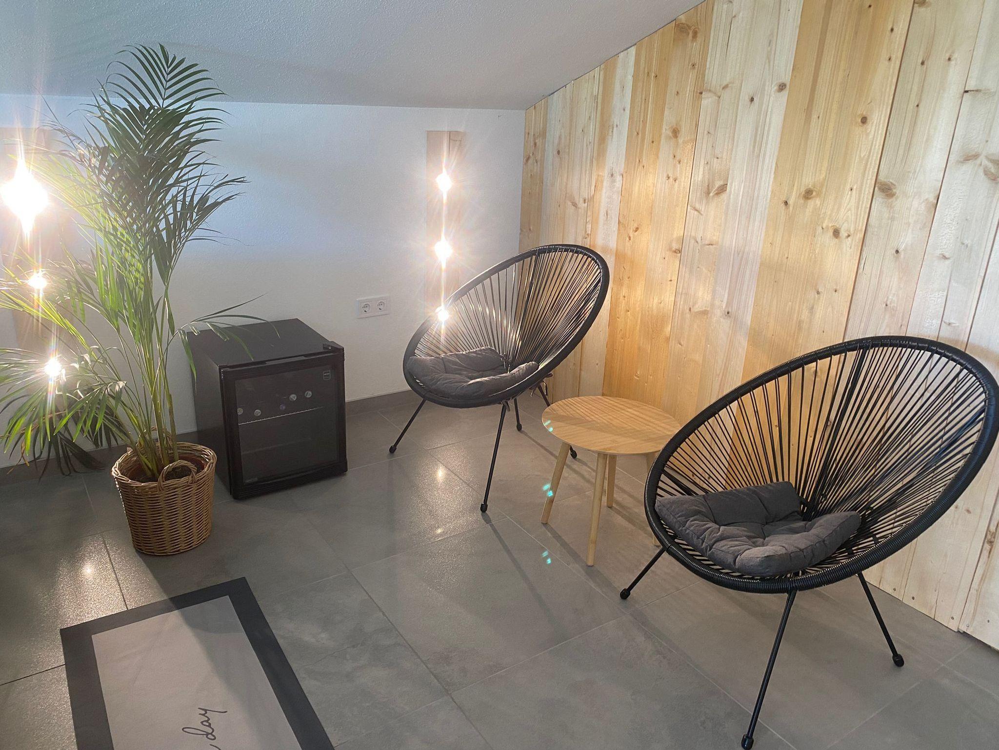 Im zweiten Obergeschoss findet ihr einen großzügigen Wellnessbereich, der über einen geräumigen Flur direkt von den Ferienwohnungen erreichbar ist. Neben einem Ruhebereich mit atemberaubendem Blick ins Grüne bietet der Wellnessbereich eine Sauna sowie einen großzügigen Whirlpool für bis zu vier Personen mit verschiedenen Massagedüsen.