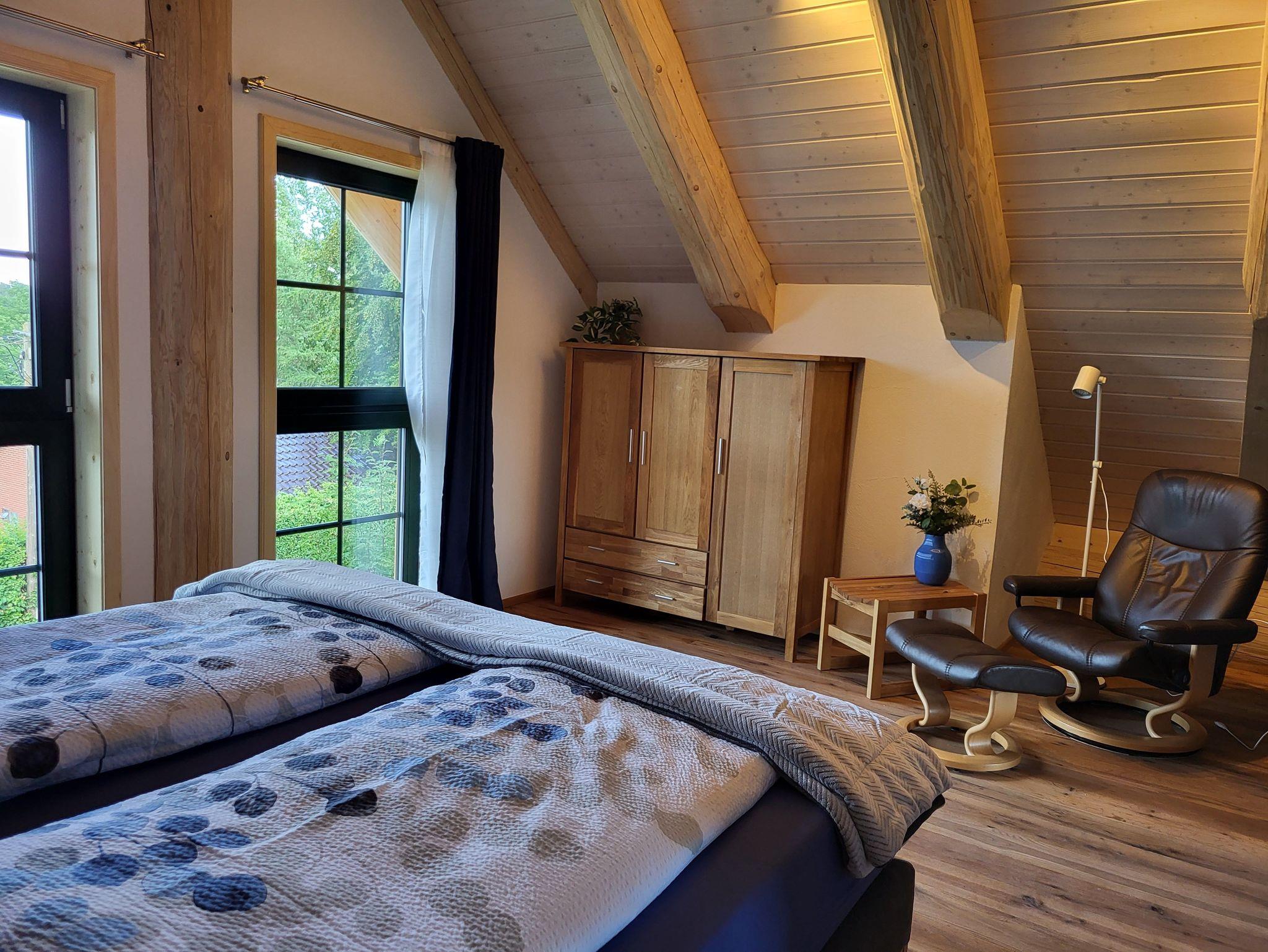 urgemütliches Schlafzimmer mit Boxspringbett(1,80 x 2,00 m), Kleiderschrank und Leseecke mit Stressless-Sessel