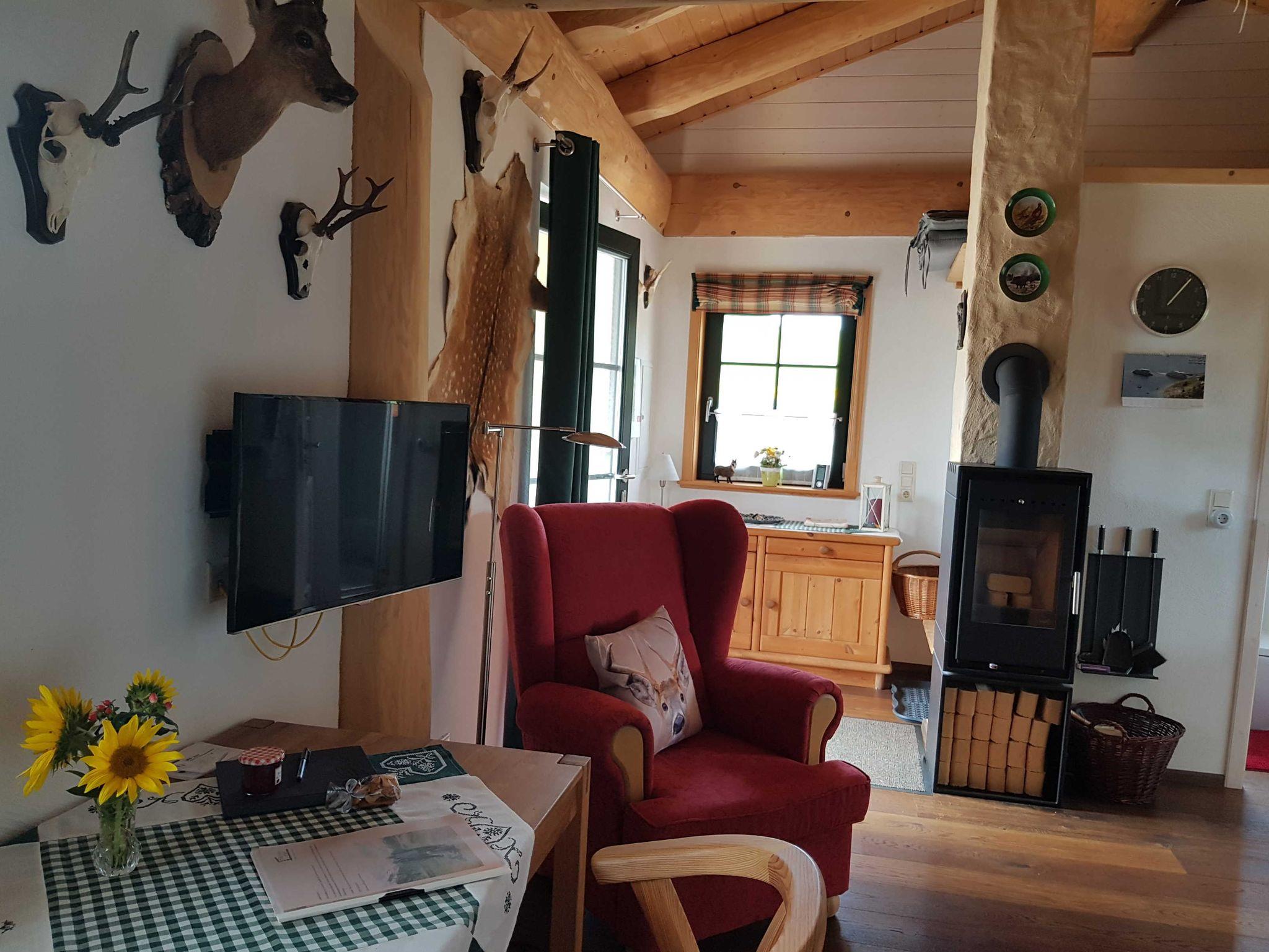 Der Wohn-/Essbereich ist mit einem gemütlichen Küchensofa, Esstisch mit 2 Stühlen und Ohrensessel mit Hocker, schwenkbarem 32 Smart-TV Flachbildschirm sowie Kaminofen mit großer Glastür ausgestattet.