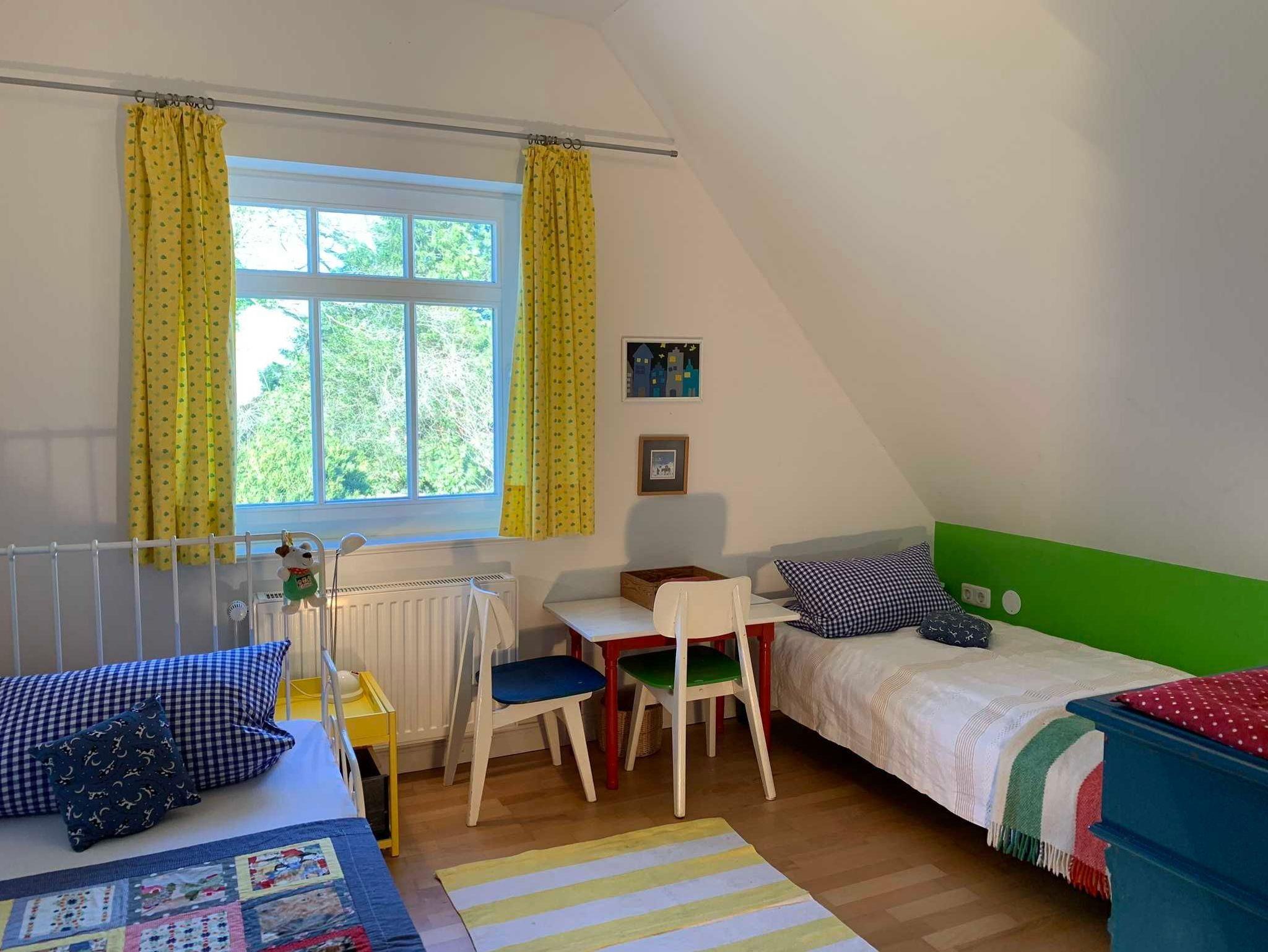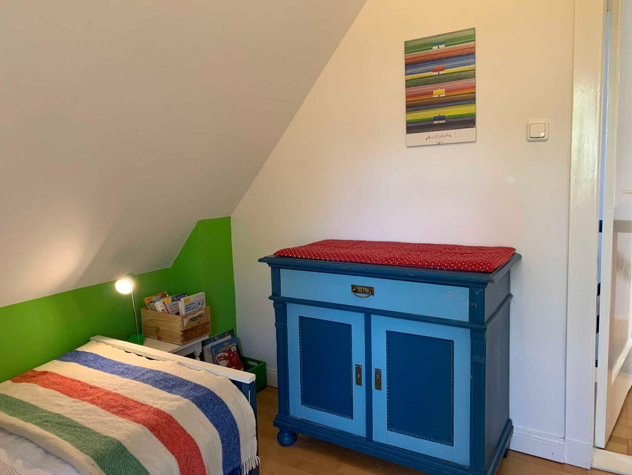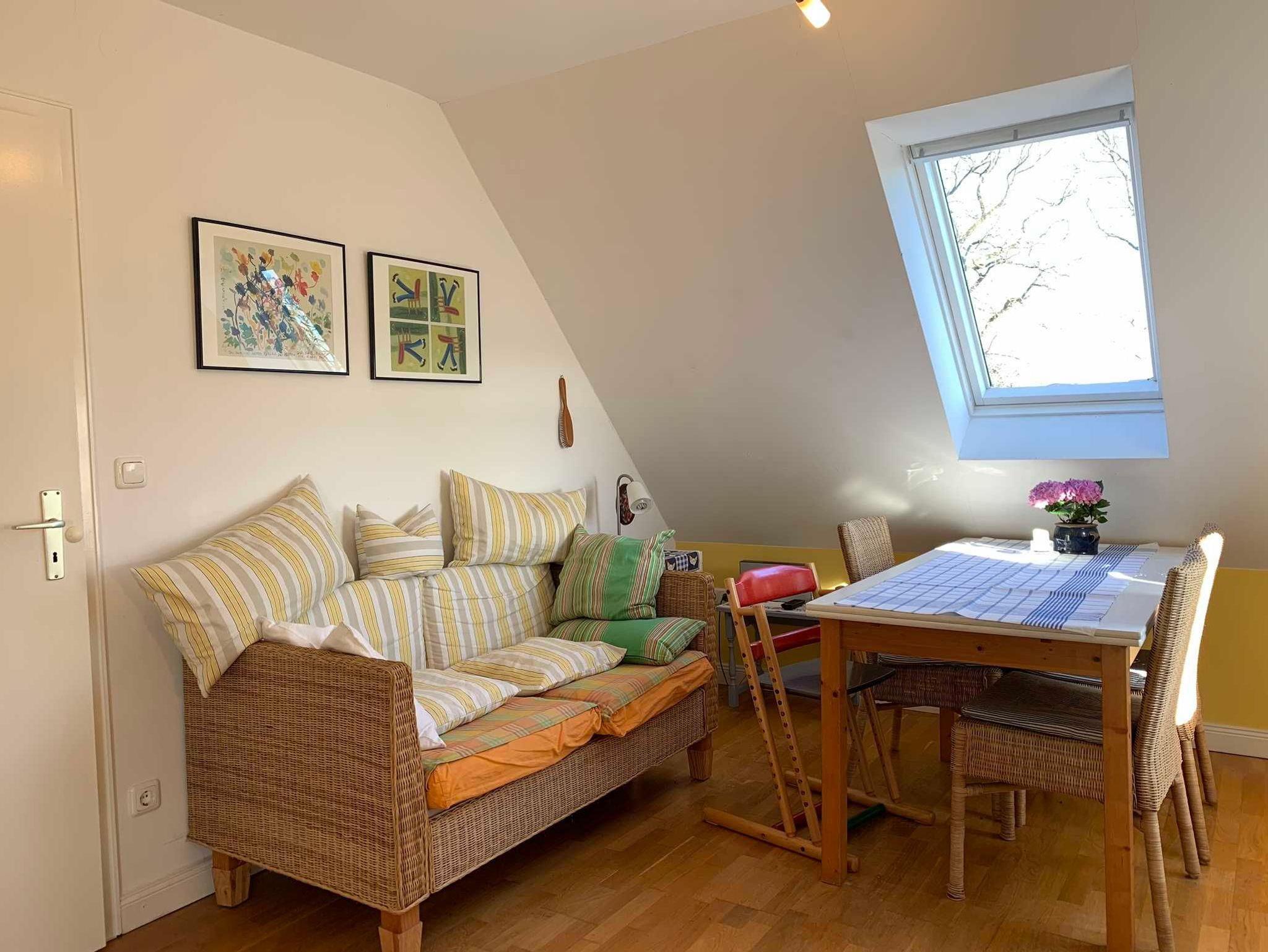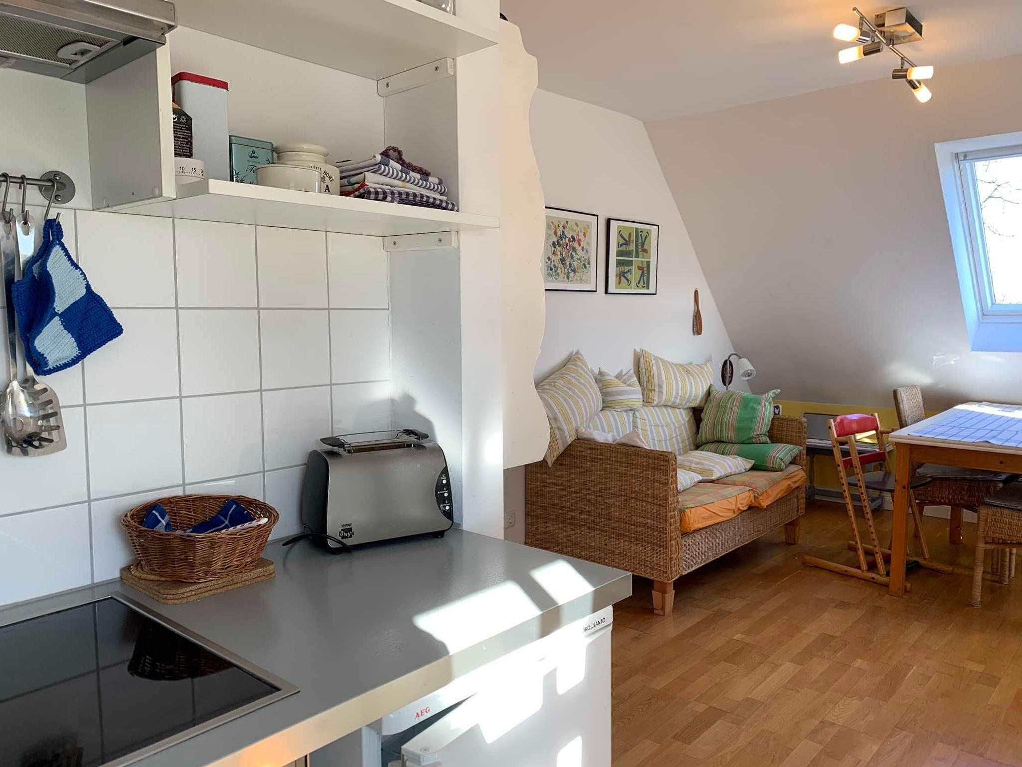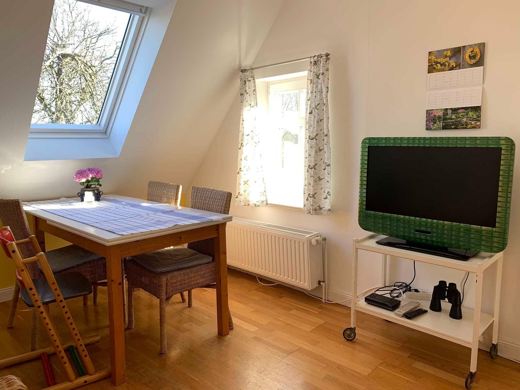Die Ferienwohnung im Obergeschoss hat ein Badezimmer mit Dusche, Badewanne und WC, ein Schlafzimmer mit Doppelbett, ein Kinderzimmer mit zwei Einzelbetten sowie eine gemütliche Wohnküche und bietet Platz für zwei Erwachsene und zwei Kinder. Es sind Spiele und Bücher vorhanden. Die Wohnung wurde 2020 renoviert und entspricht modernen Ansprüchen.