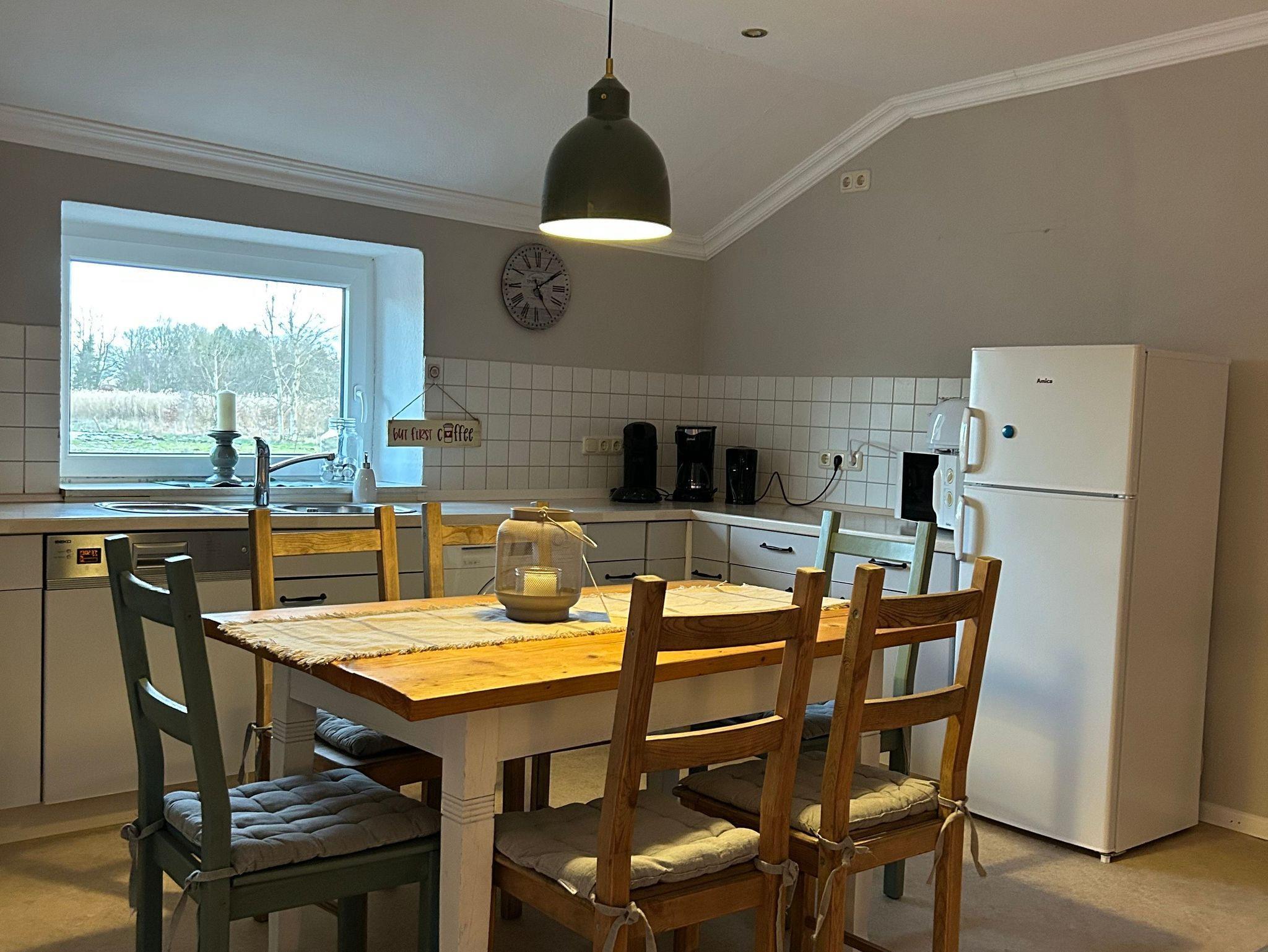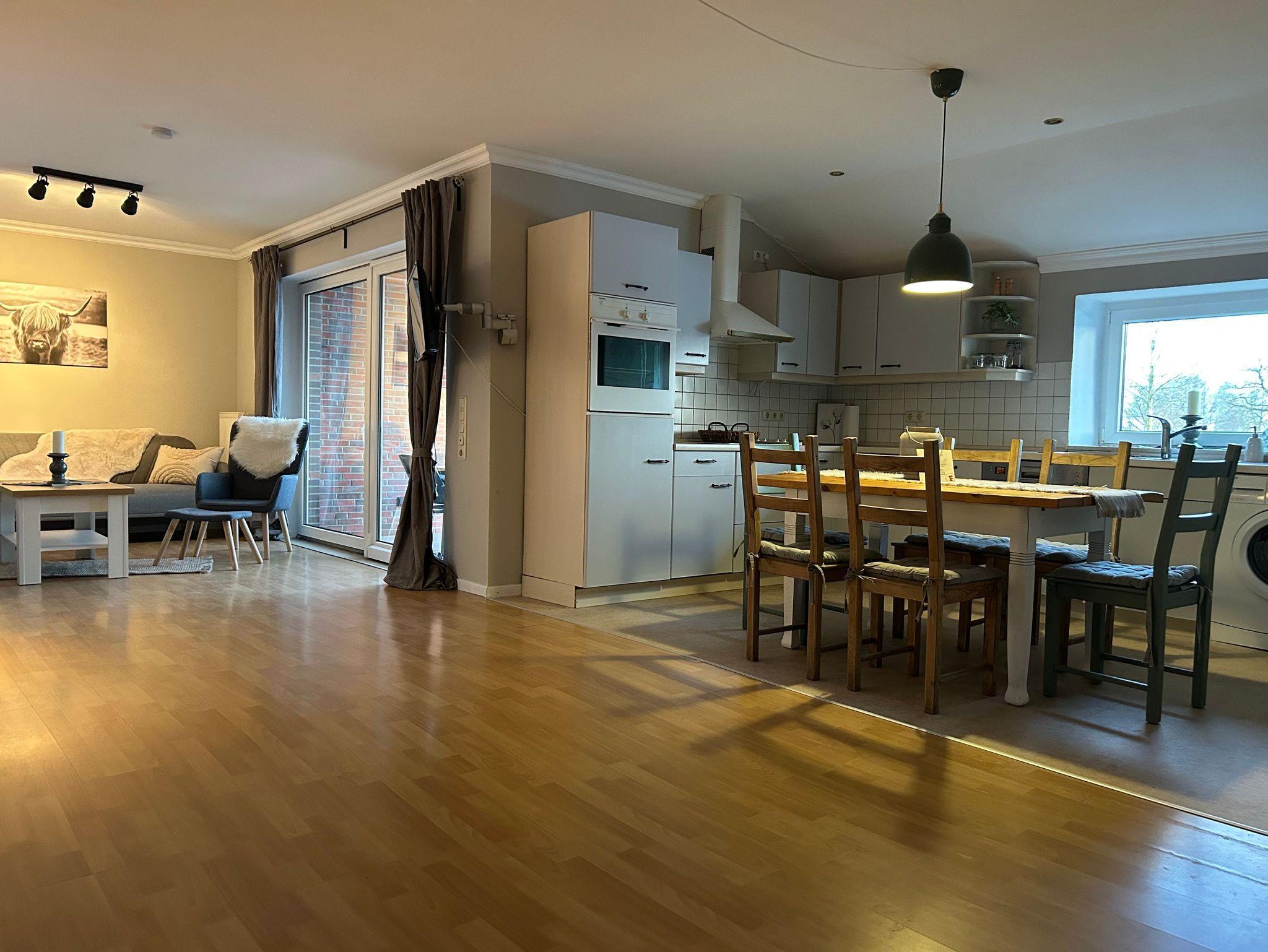 Geräumige Ferienwohnung mit Diele. Großzügige Küche mit Esstisch für 4 bis 6 Personen. Gemütliche Couchecke mit Blick auf die Weiden. Überdachte Terrasse mit Zugang zum gemeinschaftlichen Garten.
