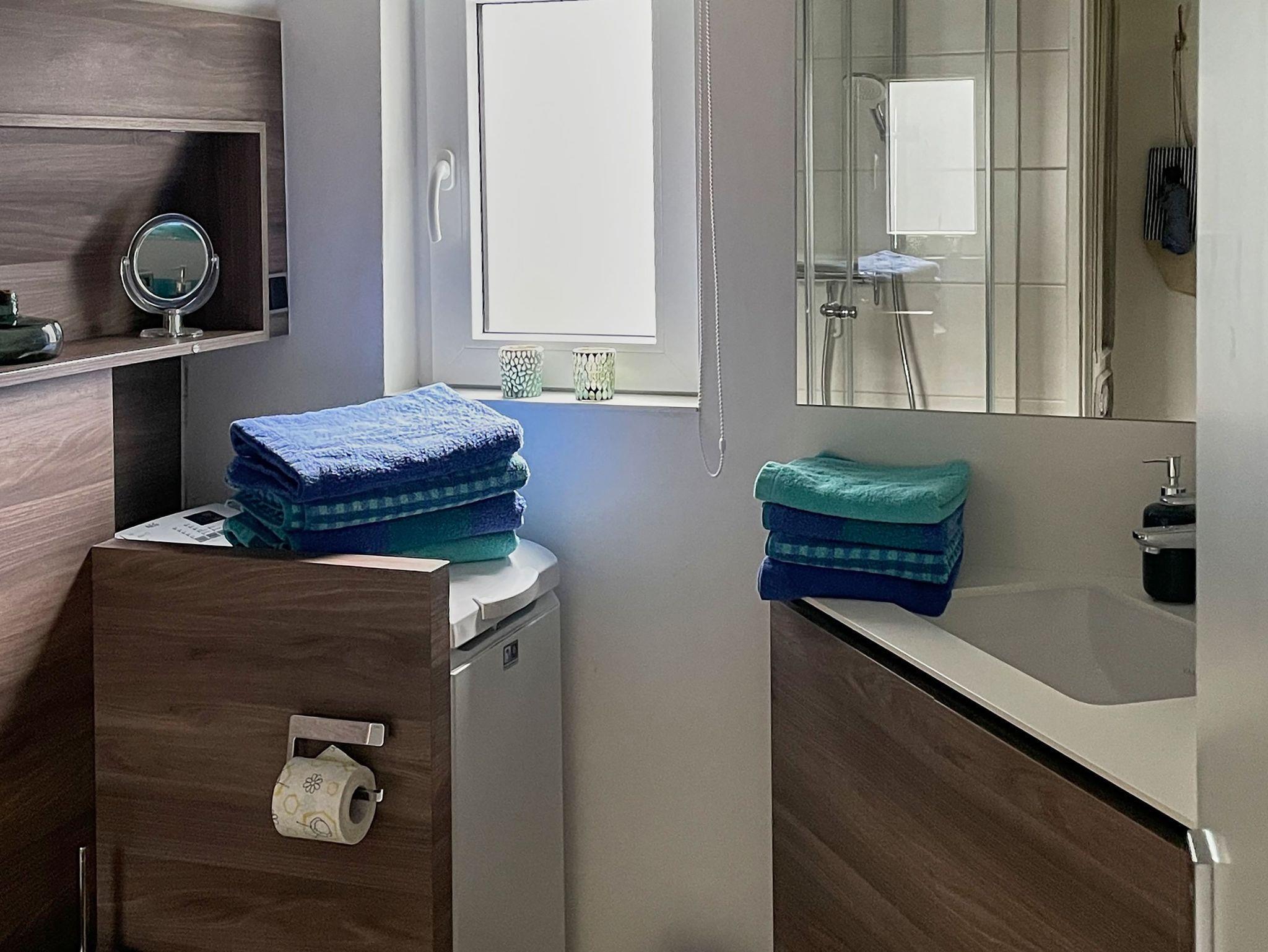 • ein helles Tageslicht-Bad mit ebenerdiger, großzügiger Dusche und viel Platz für Ihre Utensilien