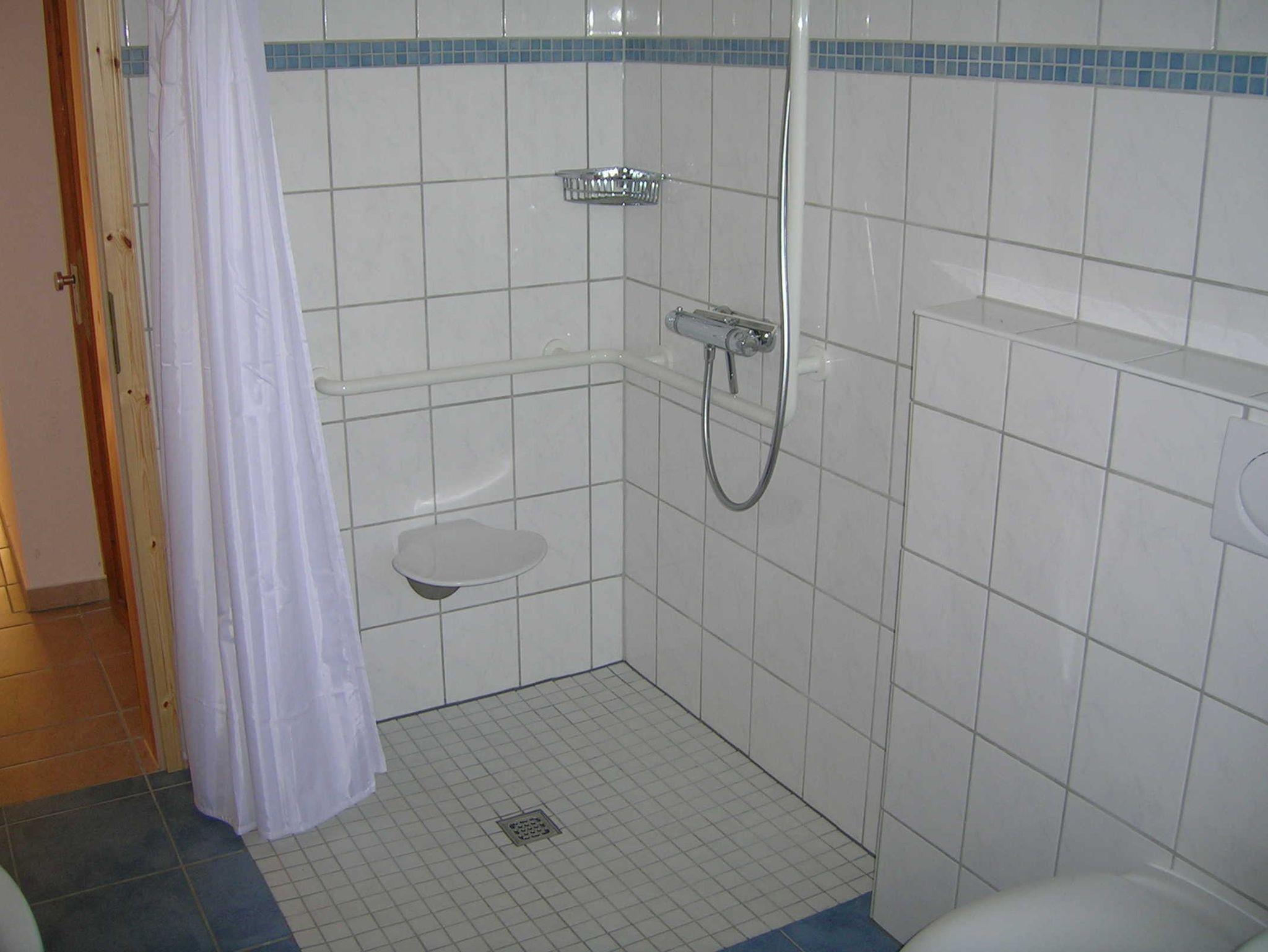 2 geräumige, rollstuhlgerechte Badezimmer. 1. Bad mit Badewanne und befahrbarer Dusche 2. Duschbad großzügig mit befahrbarer Dusche,