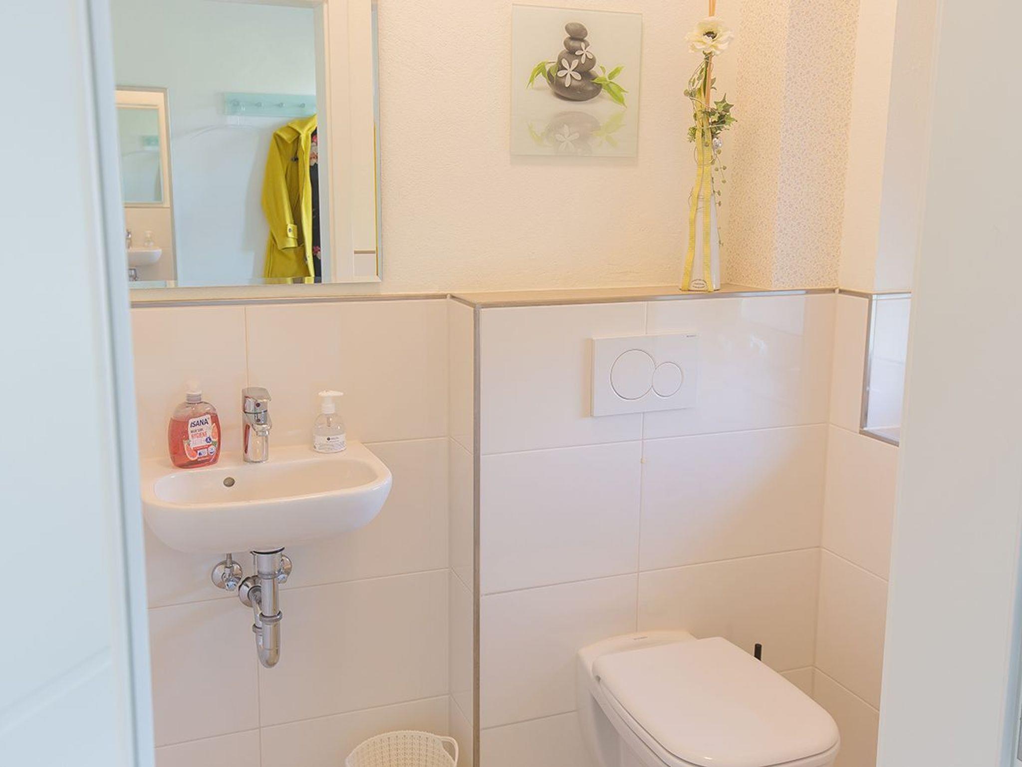 Sie parken direkt vor dem Haus - eine Garage ist vorhanden. Durch den hellen Dielenbereich gelangen Sie in das lichtdurchflutete Wohnzimmer mit integrierter L-Küchenzeile und dem Essplatz mit Ausgang zu den beiden Terrassen und der großen Liegewiese mit Strandkorb.